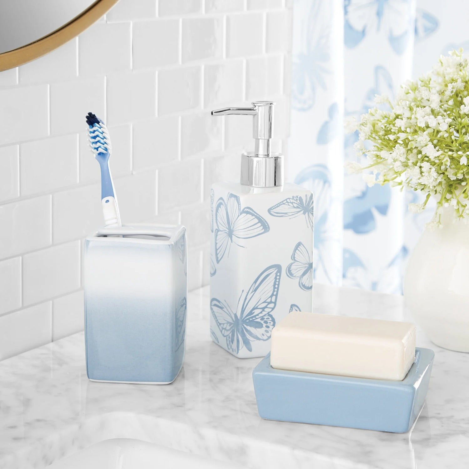 17-Piece Butterfly Polyester/ Ceramic Shower Curtain & Bathroom Accessory Set, Blue & White