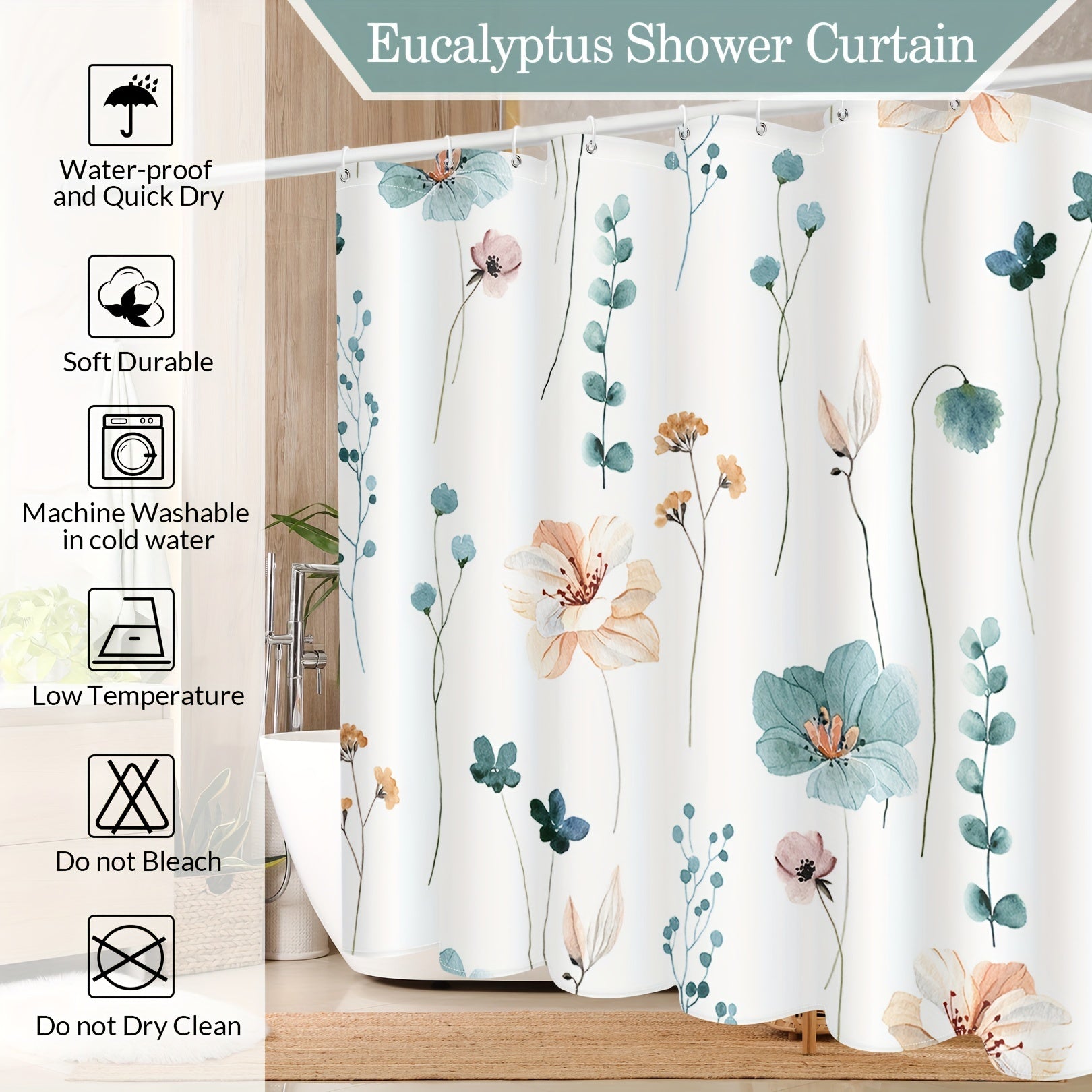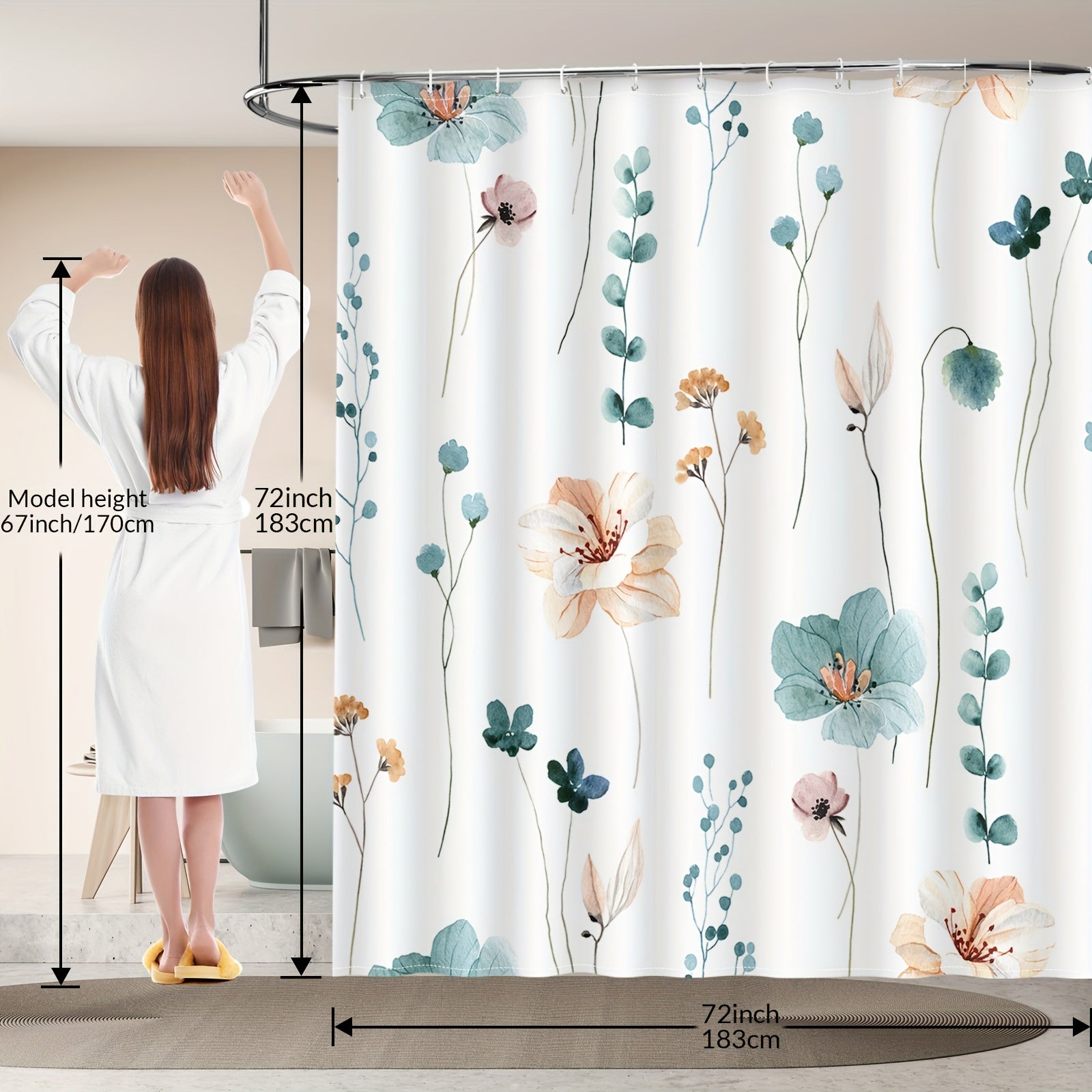 1pc Countryside Floral Shower Curtain, Teal Flower Summer Spring Shower Curtain, Waterproof Polyester Fabric, Modern Minimalist Waterproof Fabric Wildflower Leaf Plant Bathtub Curtains With 12 Hooks, Shower Curtains For Walk In Showers