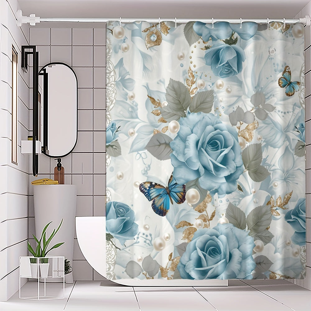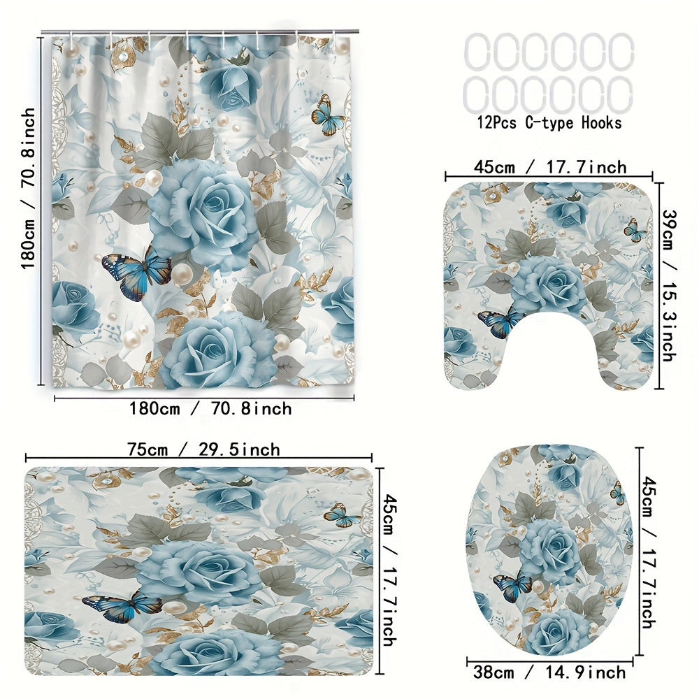 4 pcs blue and white flowers and butterfly digital printing polyester waterproof shower curtain no punching partition bathroom four-piece set