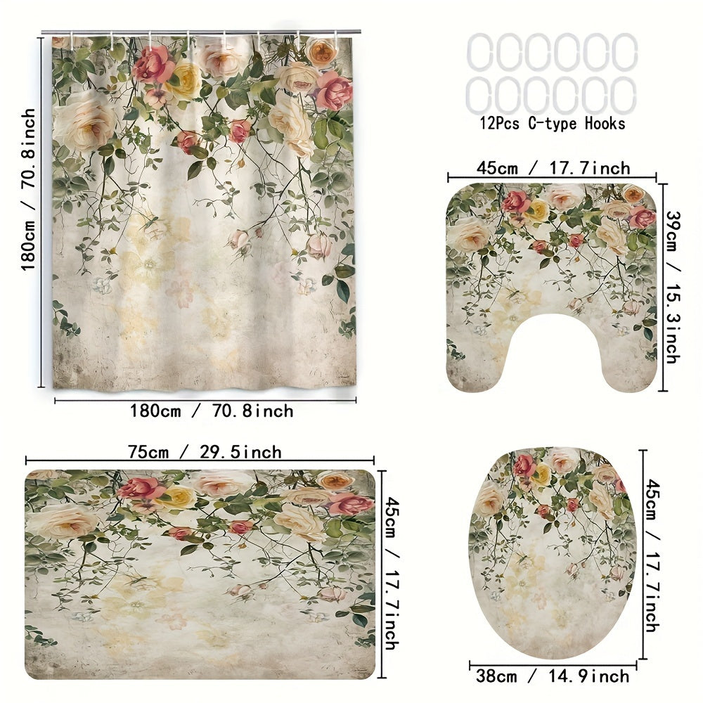 4 pcs flower branch digital printing polyester waterproof bath curtain non-punching partition bathroom bathroom four-piece set