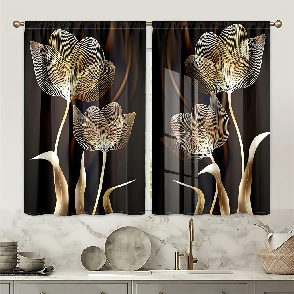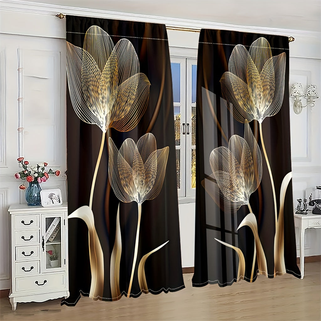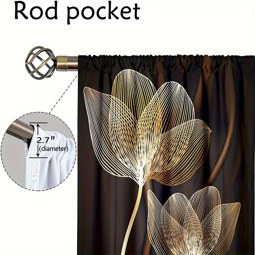 2pcs Modern Simple Golden And Black Flowers Digital Printing Curtains, Rod Pocket Design For Easy Hanging, Protection Privacy Curtain For Bedroom, Living Rooms, Kitchen, Study, Dining Room, Playroom, Home Decor Essentials
