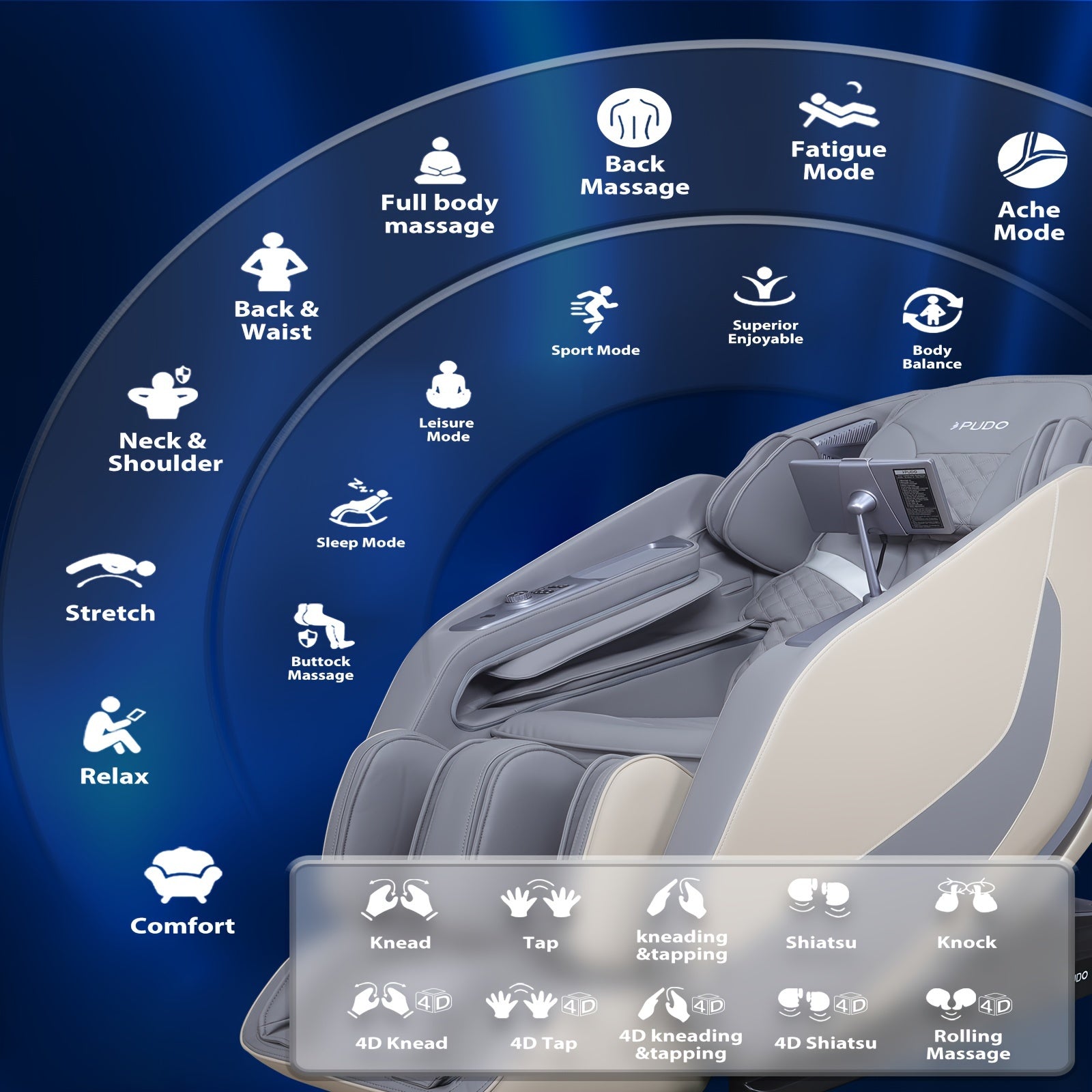 Upgraded 4D Massage Chair:Upgraded 4D Massage Chair Full Body The 4D massage roller imitates human massage. Choose from 15 automatic massage modes, each designed to target specific areas and alleviate various discomforts. Whether you seek relief for your neck, shoulders, back, or legs, there's a mode tailored to your needs. 10 techniques. Customization of Your Massage Chair Modes then enjoy it.