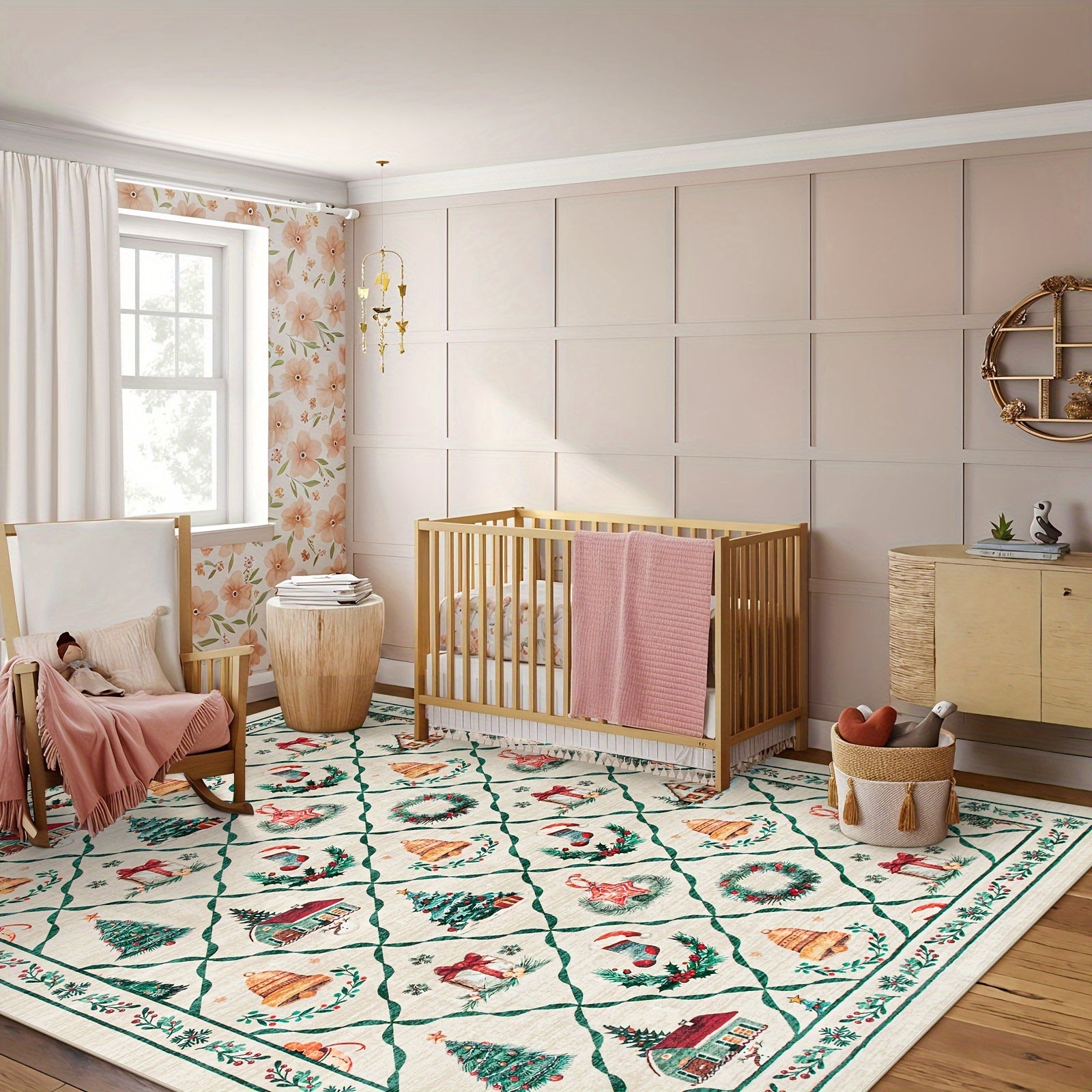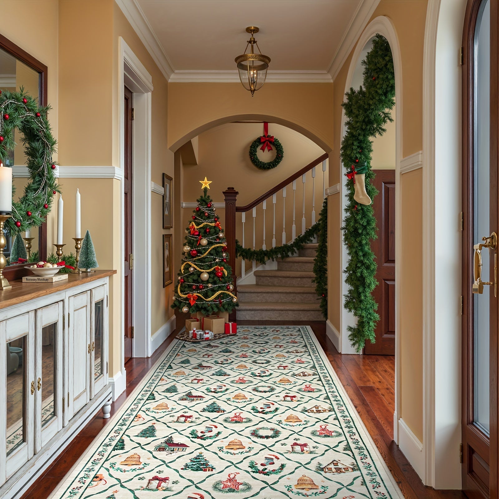 Moroccan Christmas Rug - Festive Non-Slip Holiday Carpet With Bells, Gifts, Christmas Tree. Washable Beige Rug Xmas Decor Throw Mat For Living Rooms, Entryways, And Kitchens