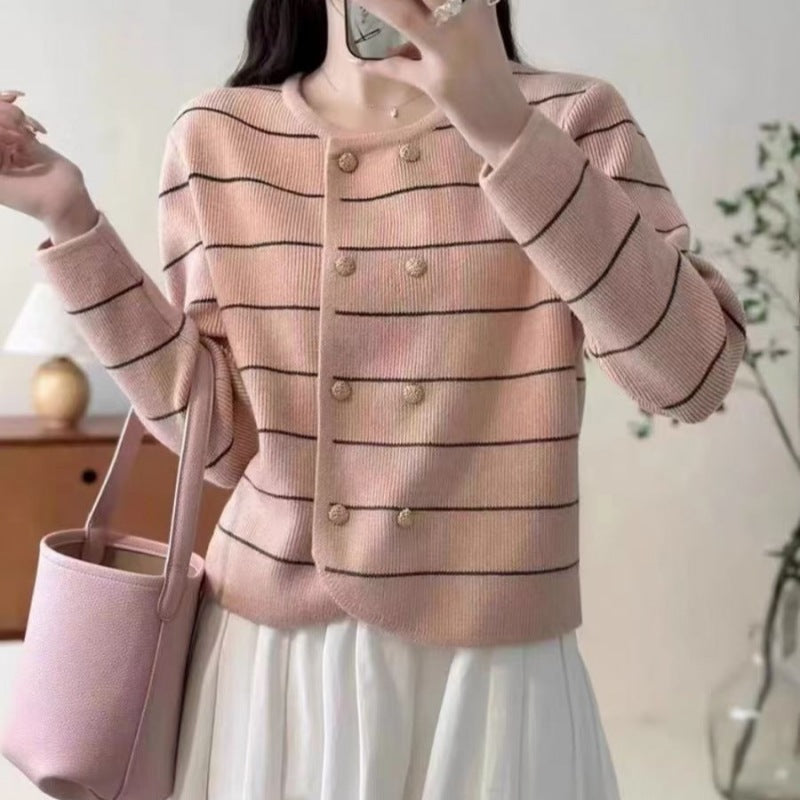 Double Breasted Western Style Classic Striped Color Collision Design Loose Round Neck Cardigan