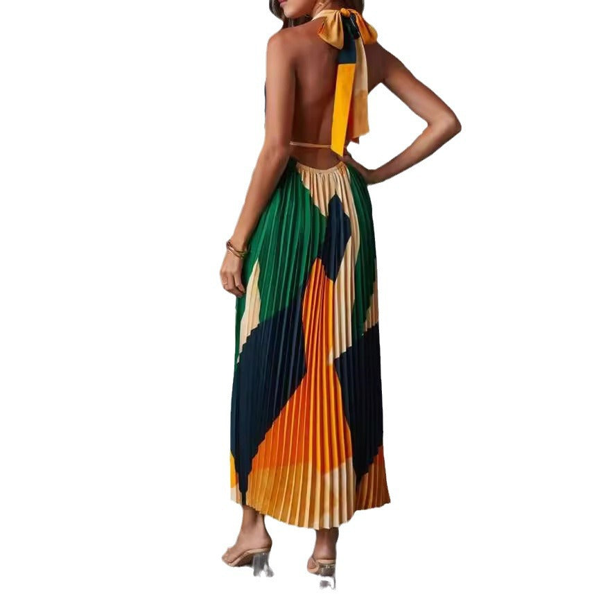 European And American Backless Bandage Folding Printing Organ Pleated Dress