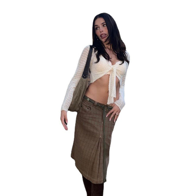 Vintage Knit Cut Top With Bandage At Front V-neck Blouse Top