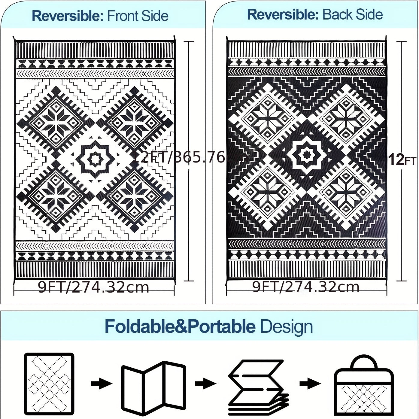 Outdoor Rug Mat For Patio, 9x12ft Waterproof Reversible Plastic Straw Rugs, Camping Carpet Area Mats For RV, Porch, Deck, Backyard, Balcony, Camper, Trailer, Black & White