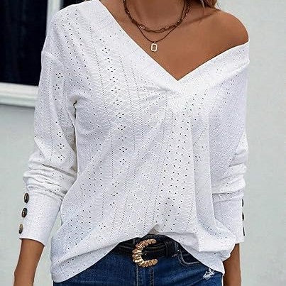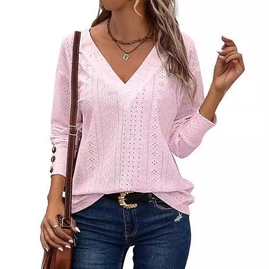 Women's Casual V-neck Long Sleeved Lace Embroidered Shirt