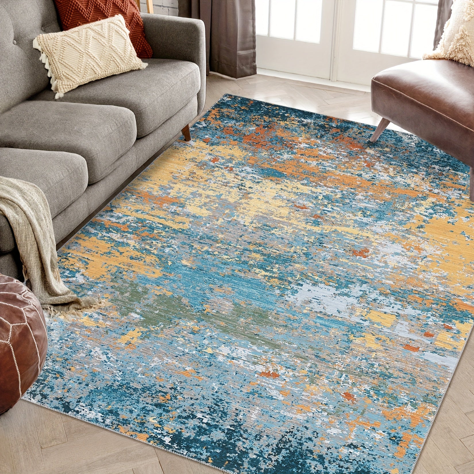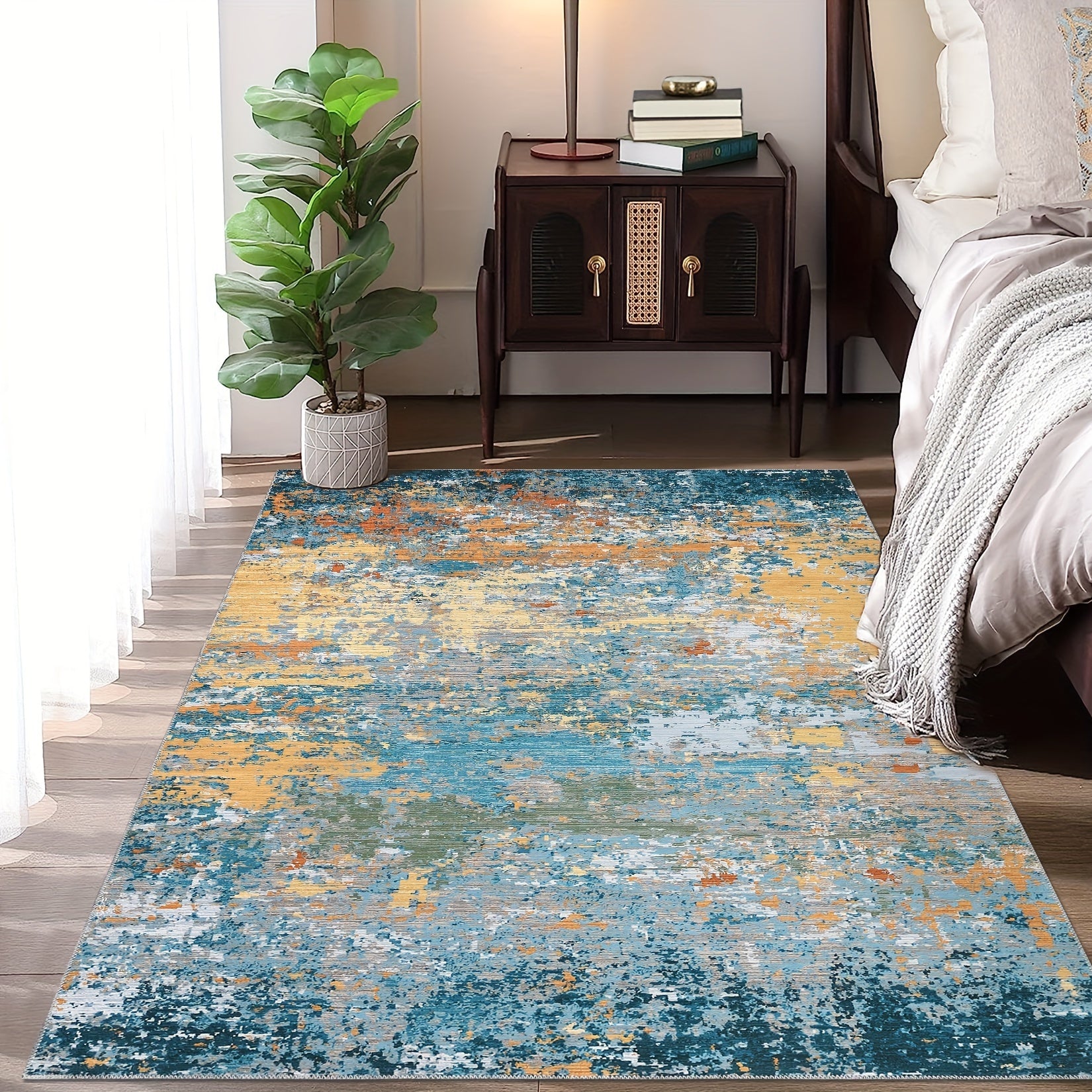 1PC Ultra-Thin Washable Area Rug Living Room Soft Surface Floor Mat Modern Abstract Soft Large Carpet Entryway Rug No Slip Indoor Floor Cover Low Pile Rug For Bedroom Kitchen Rugs Indoor Stain Resistant Carpet Home Office Farmhouse Gold Blue