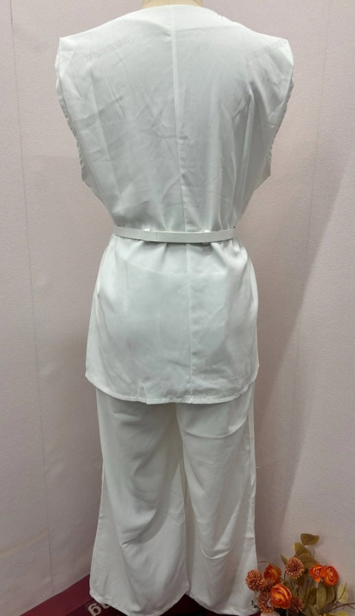 Solid Color Round Neck Sleeveless Top High Waist Wide Leg Pants Two-piece Set