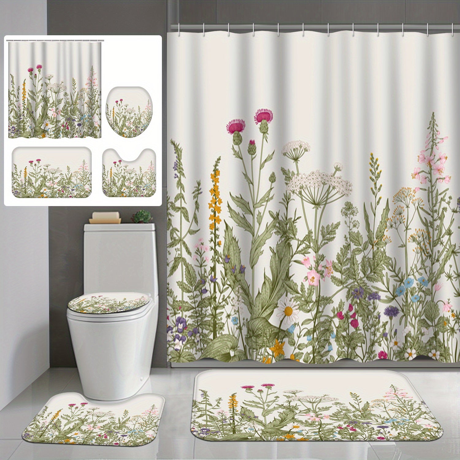 4pcs Flower Meadow Shower Curtain Set with 12 Hooks, Floral Border Herbs and Wild Flowers Botanical Style Colorful Waterproof& Non-Slip Bath Mat, Toilet Lid& U-Shaped Rugs