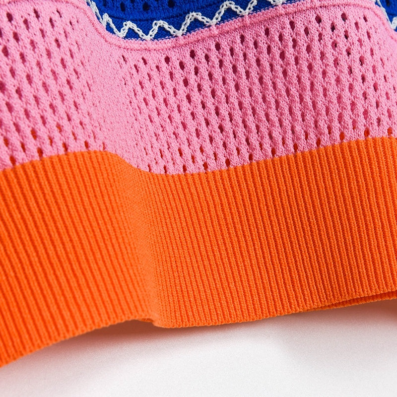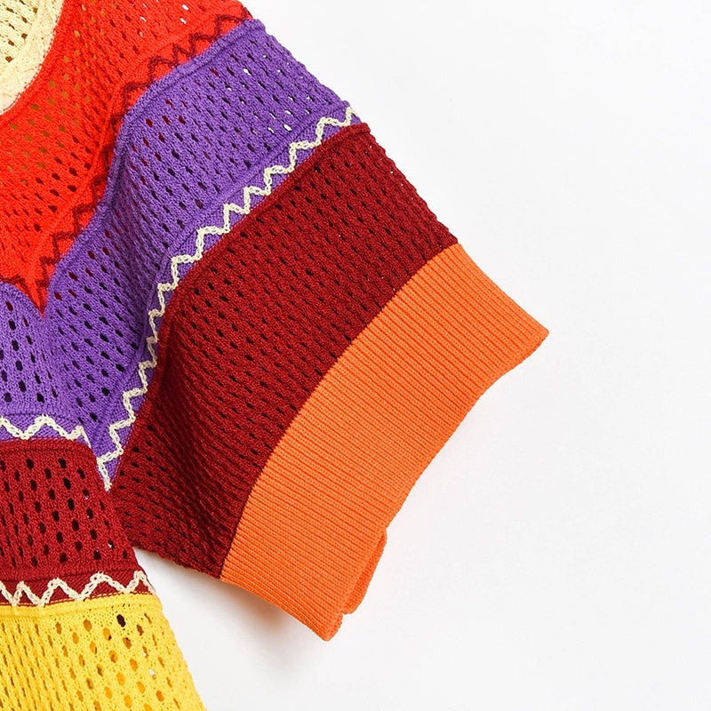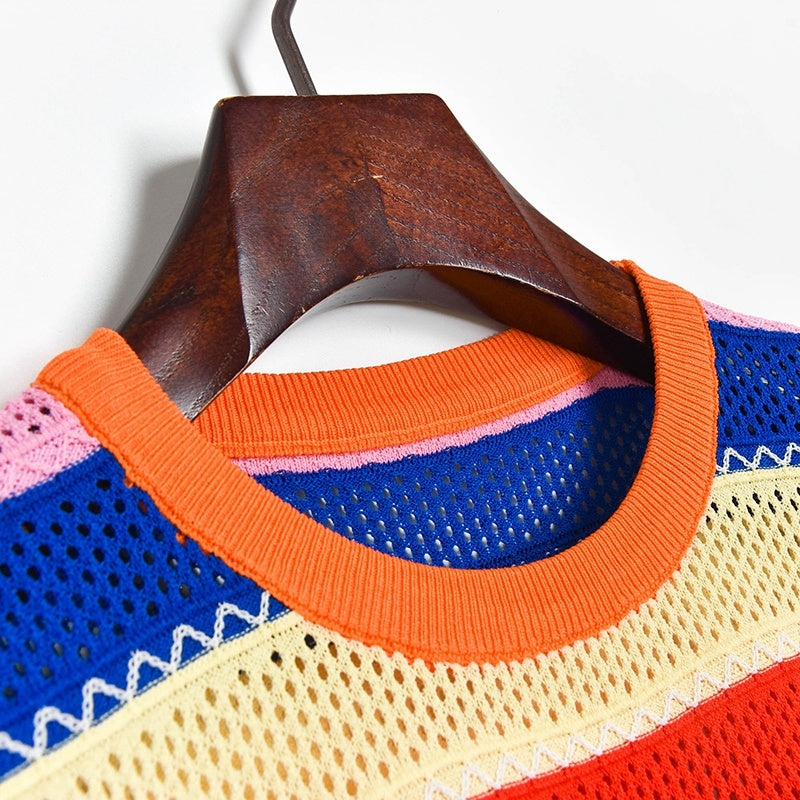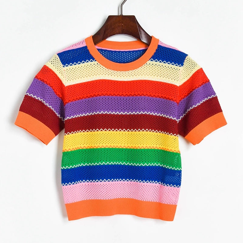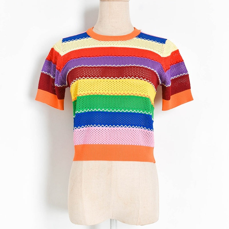 Contrasting Color Rainbow Stripe Cutout Thin Short-sleeved Sweater, Bead Round Neck T-shirt Women