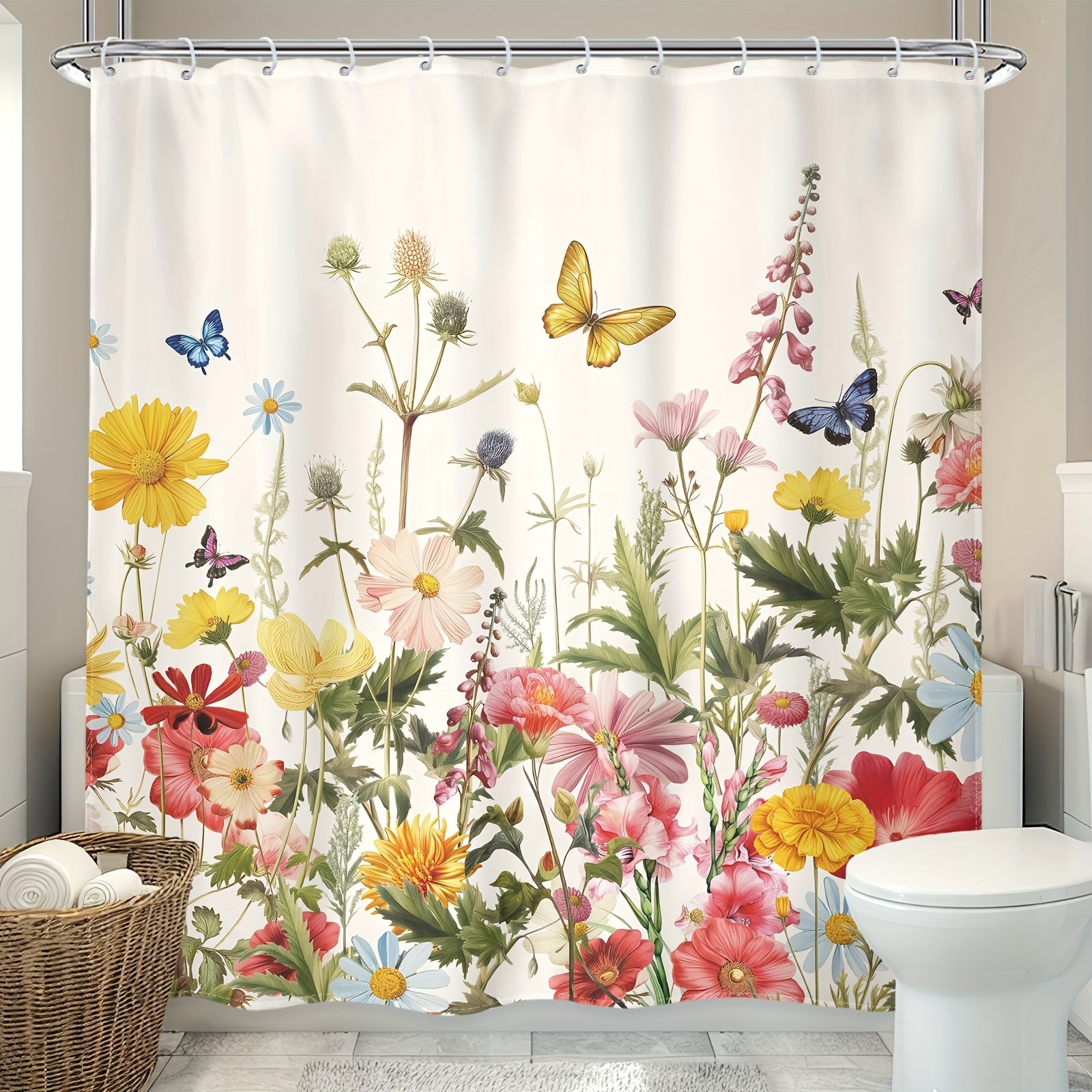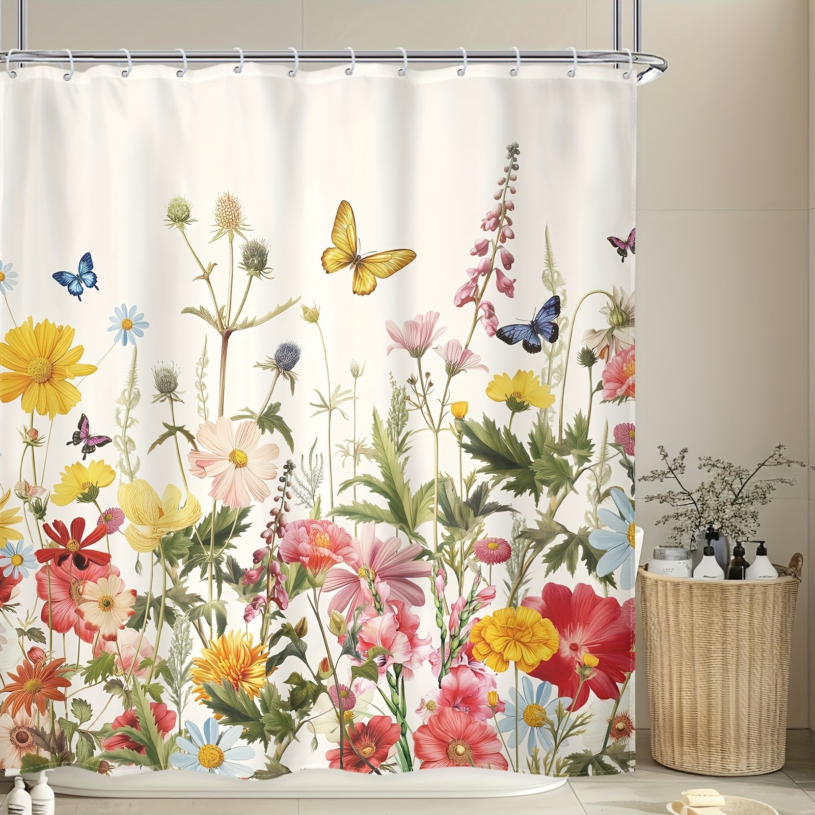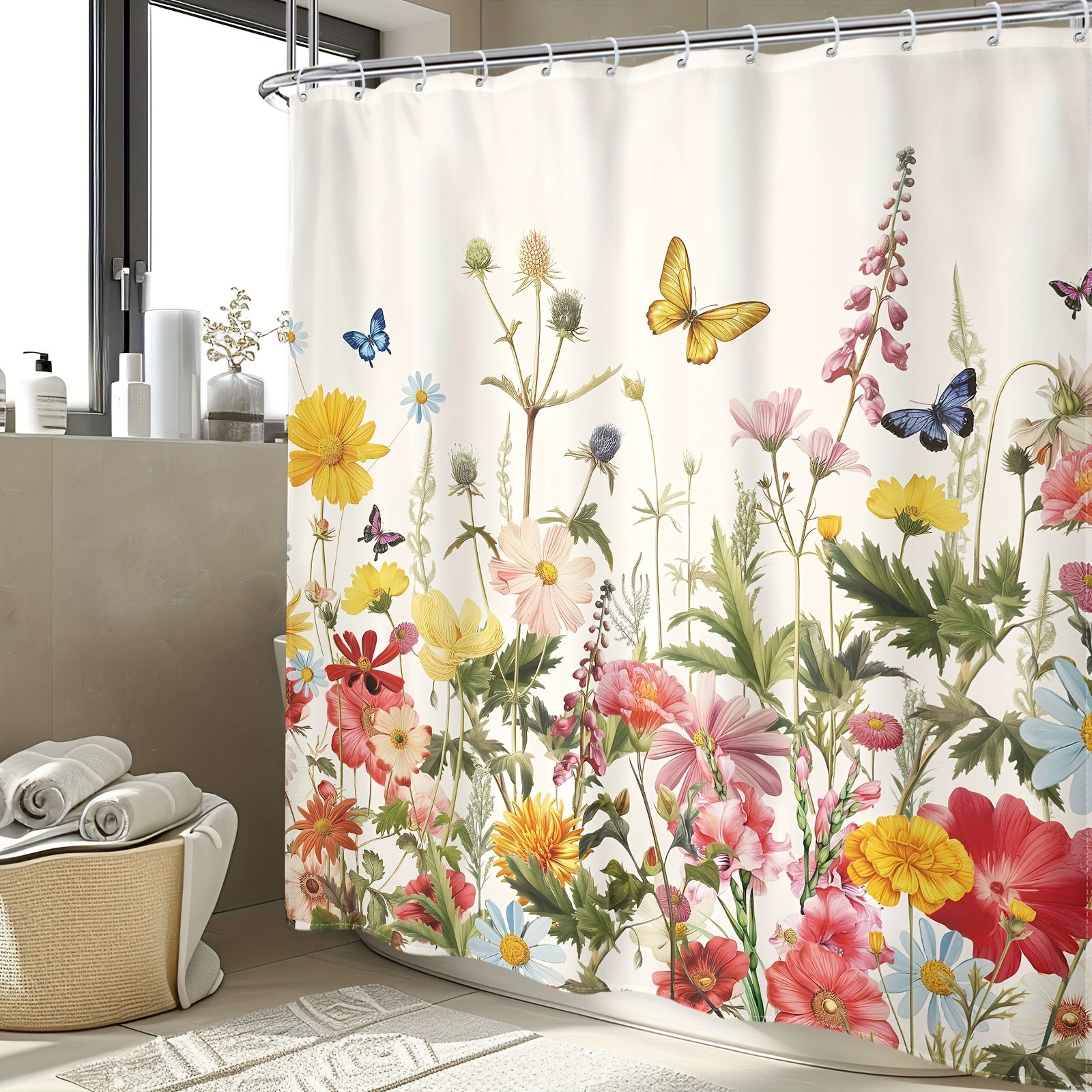 Wildflower Shower Curtain Waterproof Polyester With 12 Plastic Hooks - Nature Botanical Design With Flowers And Butterflies, Ideal Bathroom Decoration For Outdoor Bathing