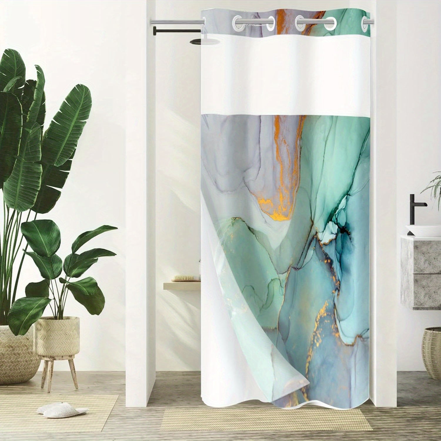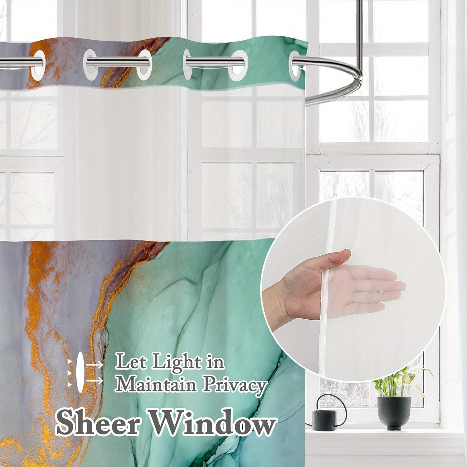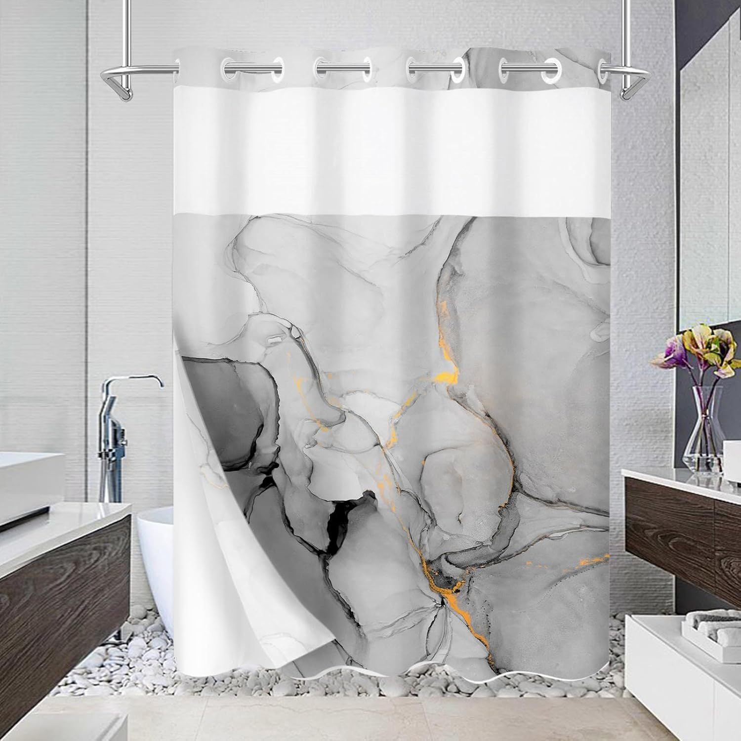 1pc No Hook Marble Shower Curtain with Snap-in Fabric Liner Set for Bathroom, Hotel Style Abstract Modern Shower Curtain with See Through Top Window, Waterproof & Washable
