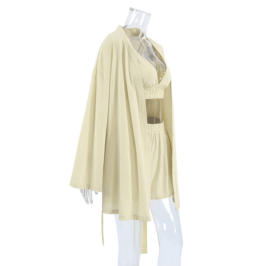 Women's Stretch Cotton Long-sleeved Underwear Shorts Pajamas Three-piece Set