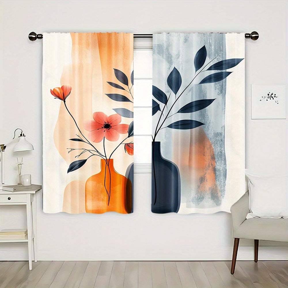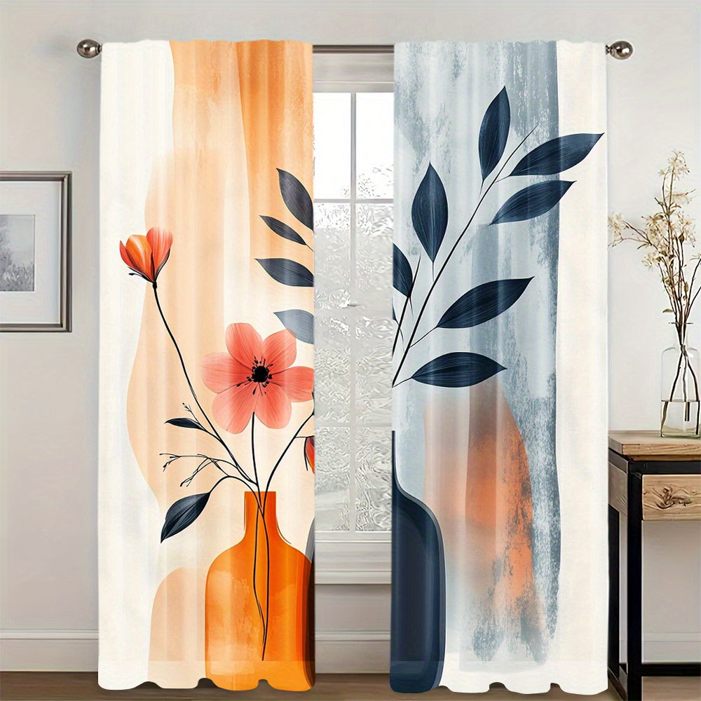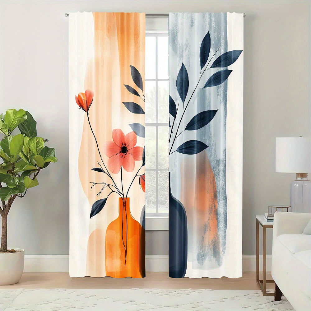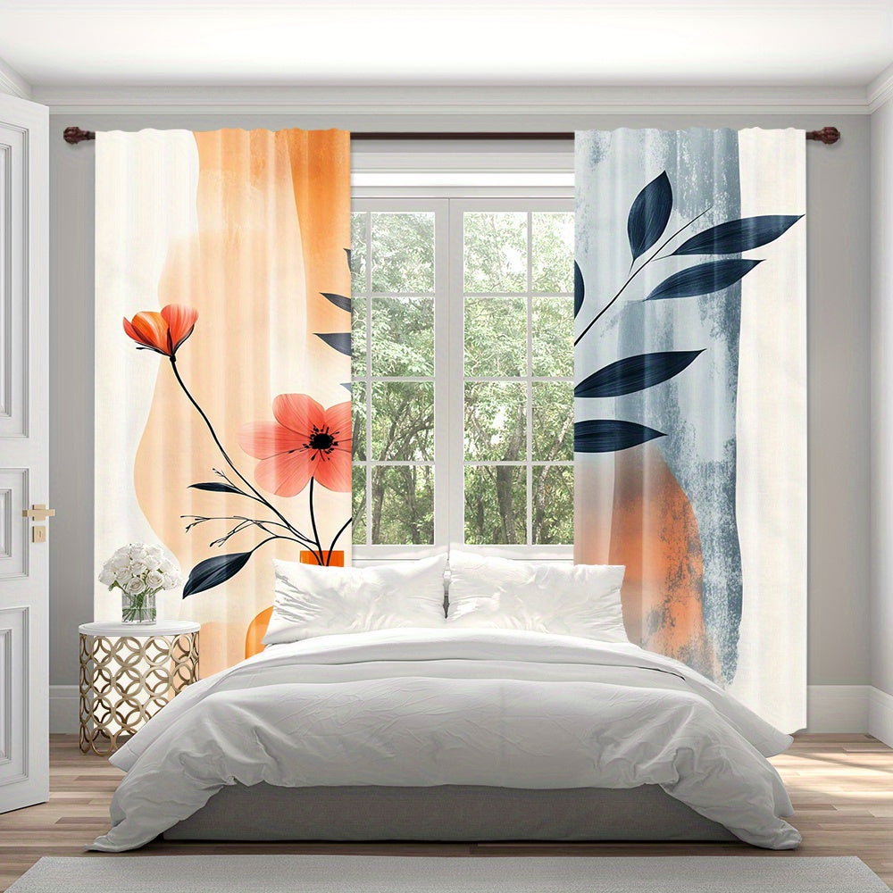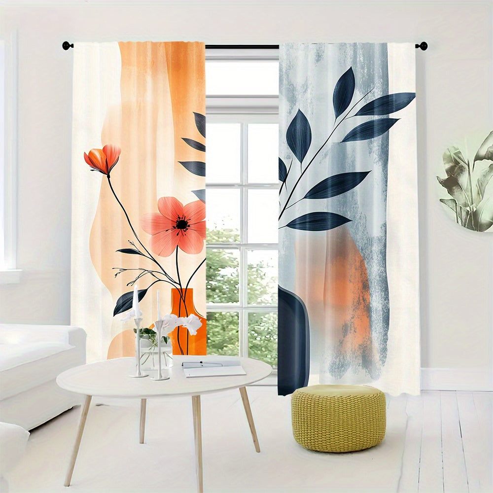 2pcs Set Modern Boho Geometric & Palm Leaf Floral Curtains - Abstract Mid-Century Rod Pocket Window Treatments for Bedroom, Office, Kitchen, Living Room, and Study