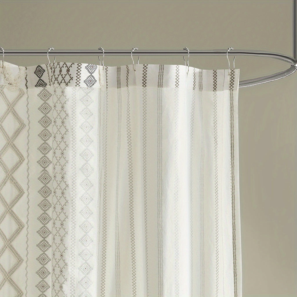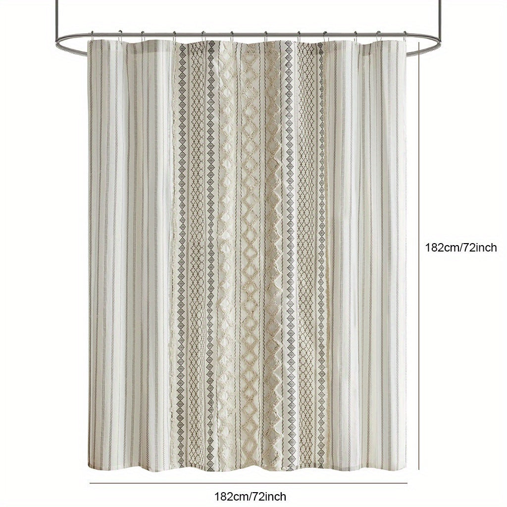 1.100% cotton printed with tufted chenille stripe trim shower curtain 2.Global inspired aztec print shower curtain measuring 72 x 72 inches 3.Oeko-Tex Certified, includes no harmful substances or chemicals (#19.HIN.73178) 4.12 button holes for better stability 5.Machine wash for easy care 6.Coordinate matching bedding available and sold separately