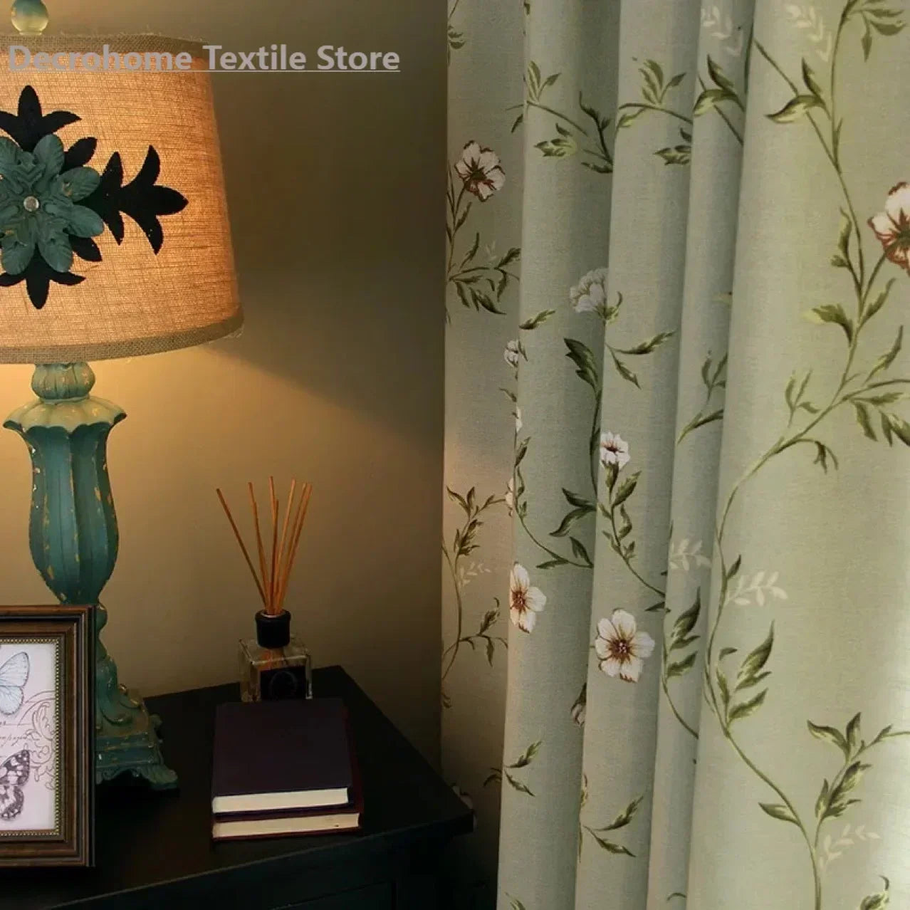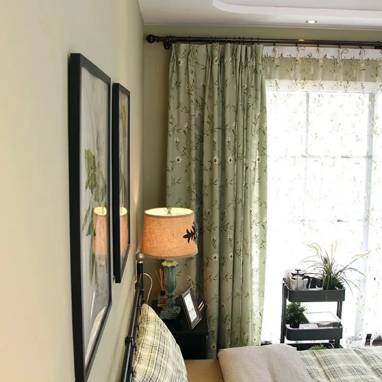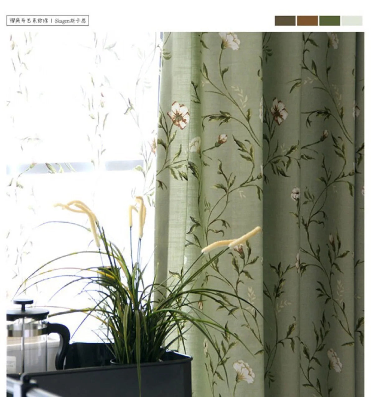 Green Flower and Bird Printed Cotton and Linen Curtains for Living Bedroom Dining Room Partition Curtains Balcony Customization