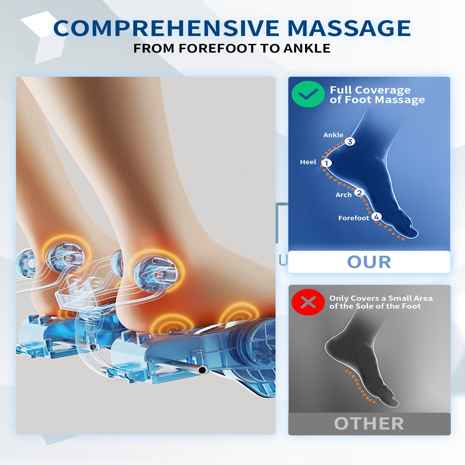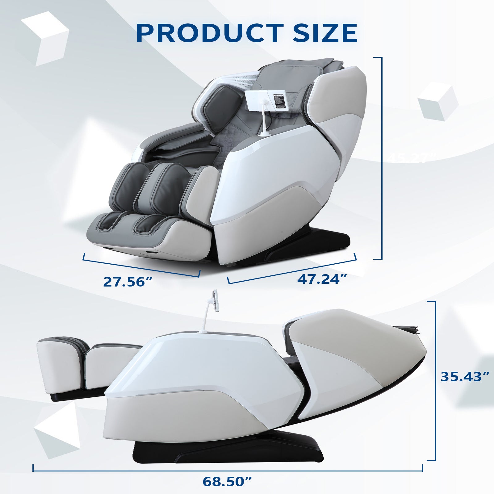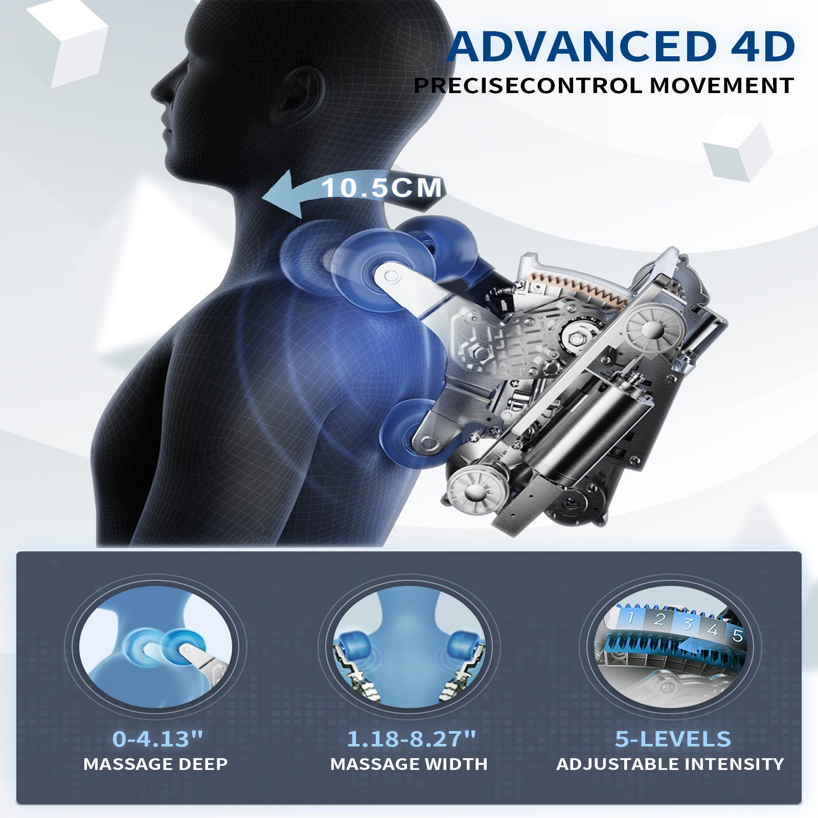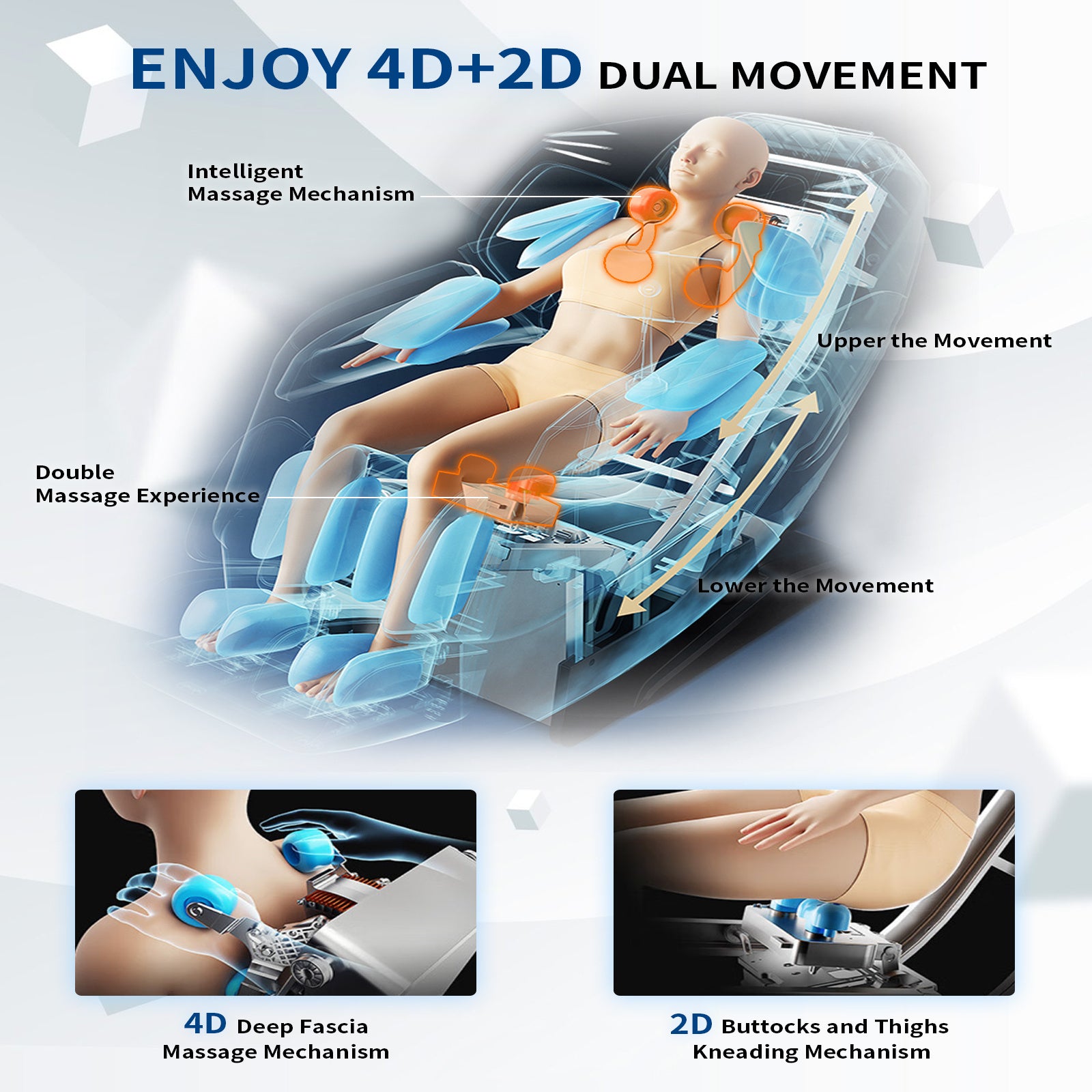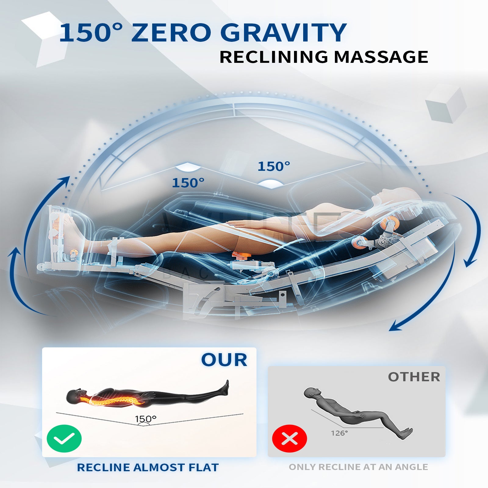 4D+2D Dual Mechanism: 4D+2D Dual Mechanisms for Double the Comfort! The 4D massage mechanism provides a variety of back massages, while the specialized 2D mechanism targets the buttocks and thigh muscles for a personalized experience. It's like having two massage therapists working at the same time for your comfort! A perfect blend of innovation and comfort for an unrivaled relaxation experience. It's a perfect blend, where 1+1 is greater than 2, for your comfort! Touch Sensing Technology: Massage chair utilizes cutting-edge detection technology, assessing your health status through gentle fingertip contact. It identifies your areas of fatigue and recommends suitable massage modes tailored specifically for you. 150° Zero Gravity Massage Chair: This massage chair snugly conforms to the natural curvature of your spine at a 150° angle, enhanced with dual-end track massage extension for broader coverage. It creates the optimal lying position tailored to the human body, providing effective support to various body parts. Unlike traditional angles that only offer inclined massage, this massage chair allows you to fully relax. Upgraded 3D Foot Massage: Massage from Forefoot to Ankle. Our innovative design in the full body massage chair incorporates 3D rollers, effectively stimulating the soles of your feet and targeting key pressure points, extending all the way to the ankles to provide you with a comprehensive massage experience.