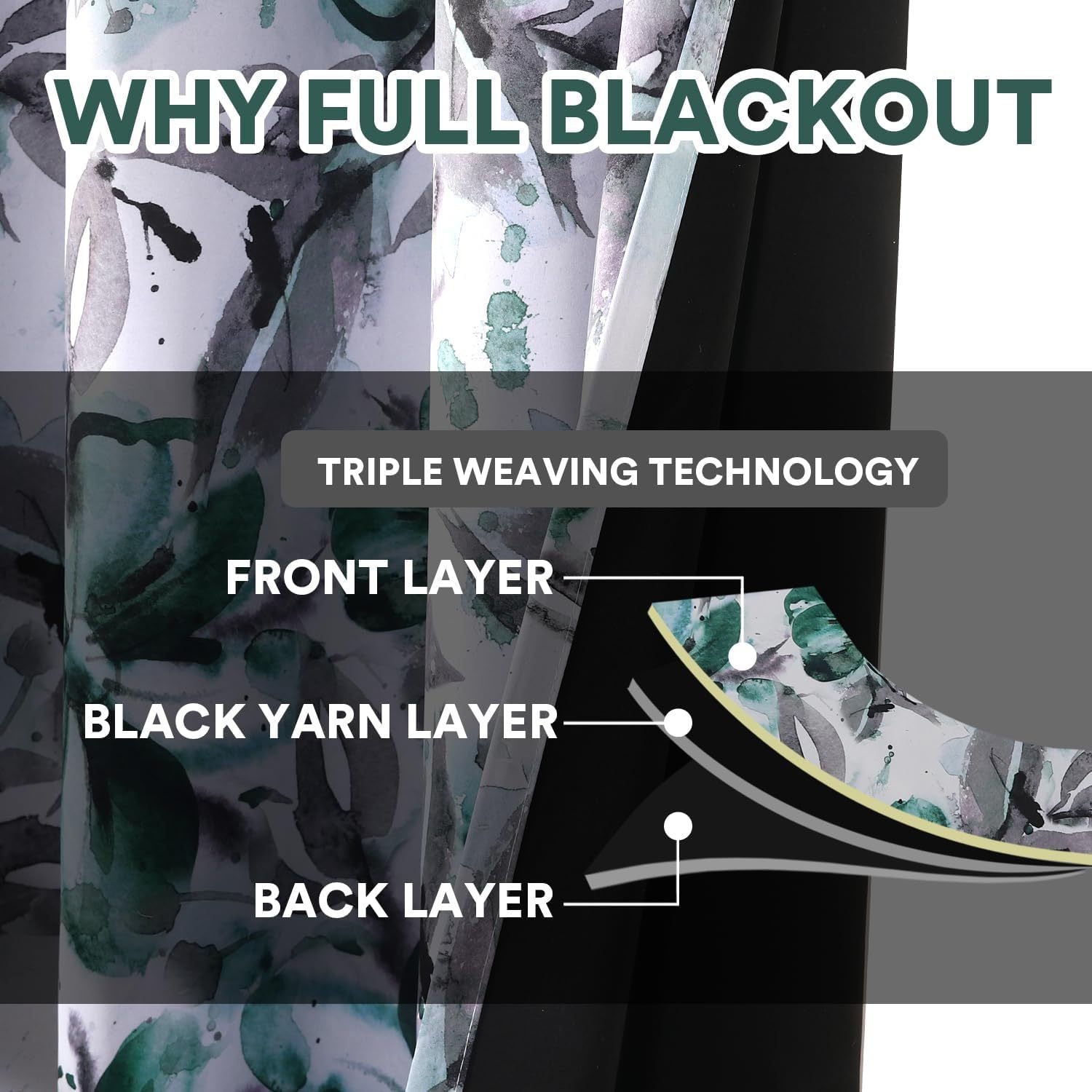 PrinceDeco 100% Blackout Curtains for Bedroom 84 Inches Long Green and Grey Floral Print Curtains for Living Room Patterned Blackout Curtains Thermal Soundproof Gromment Top 2 Panels Set