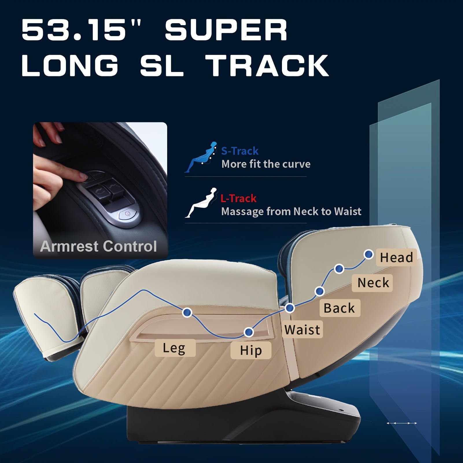 Zero Gravity& 128CM SL Track:One-Button zero gravity mode, 3 adjustable zero gravity positions relax your body and mind, massage your spine with an angle of 126±7°. And this 3D massage recliner combined with 128cm "SL" shape space curved rail technology, makes you enjoy personal massage from the head to the leg, achieves relaxing the spine and relieve tense muscles.