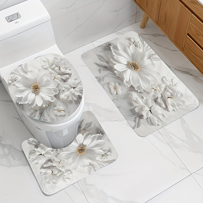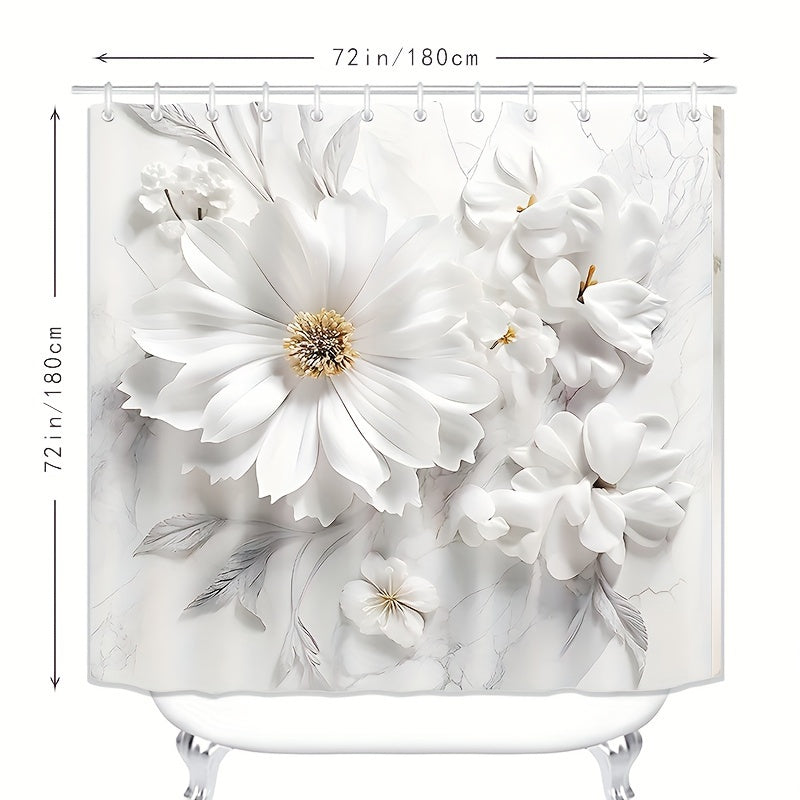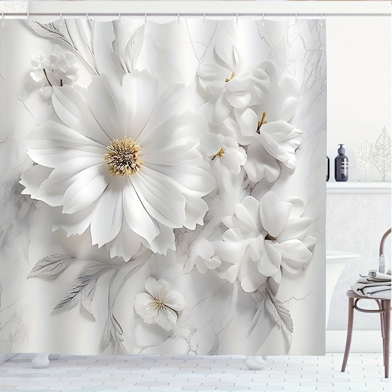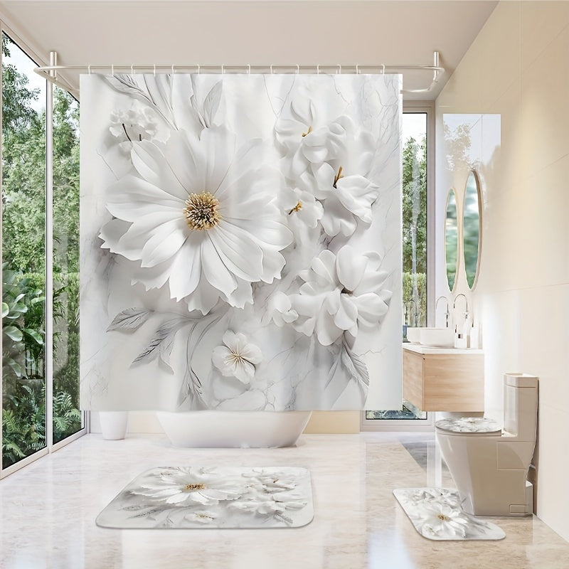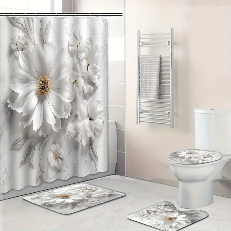 4pcs White Flower Pattern Shower Curtain, Contemporary Floral Design, Bathroom Decor, Machine Washable, With Hooks, Easy To Clean