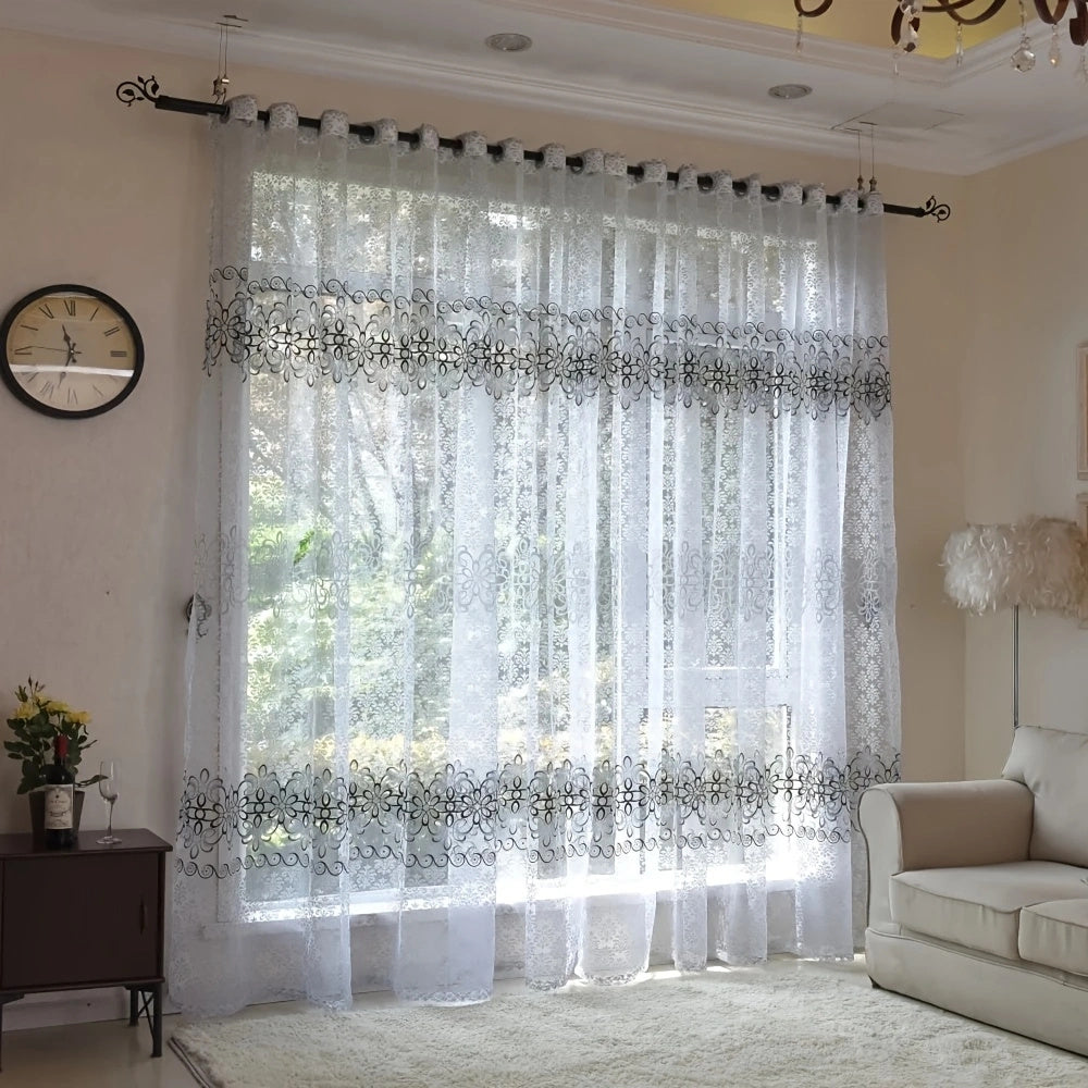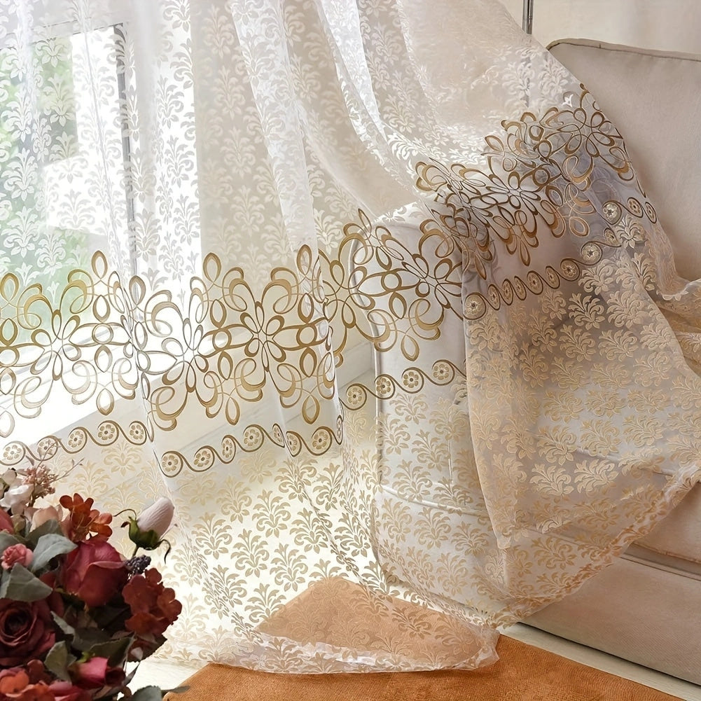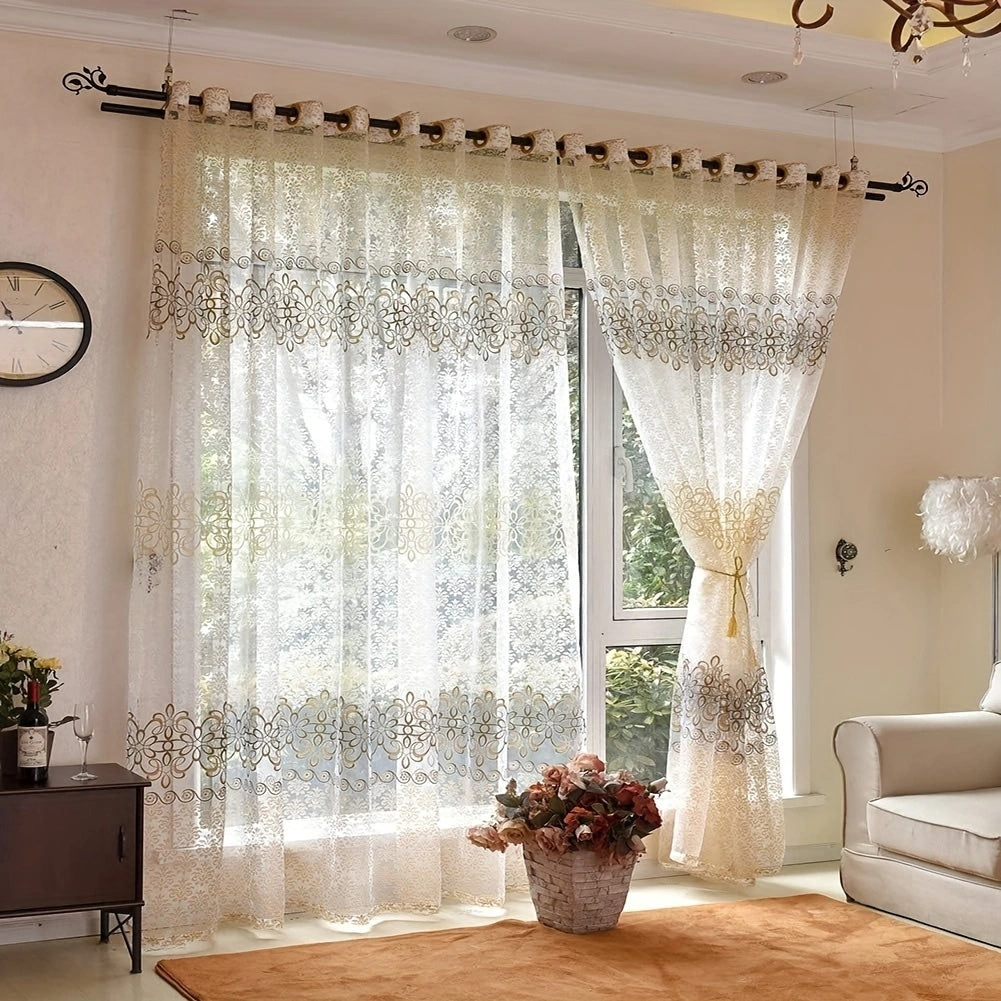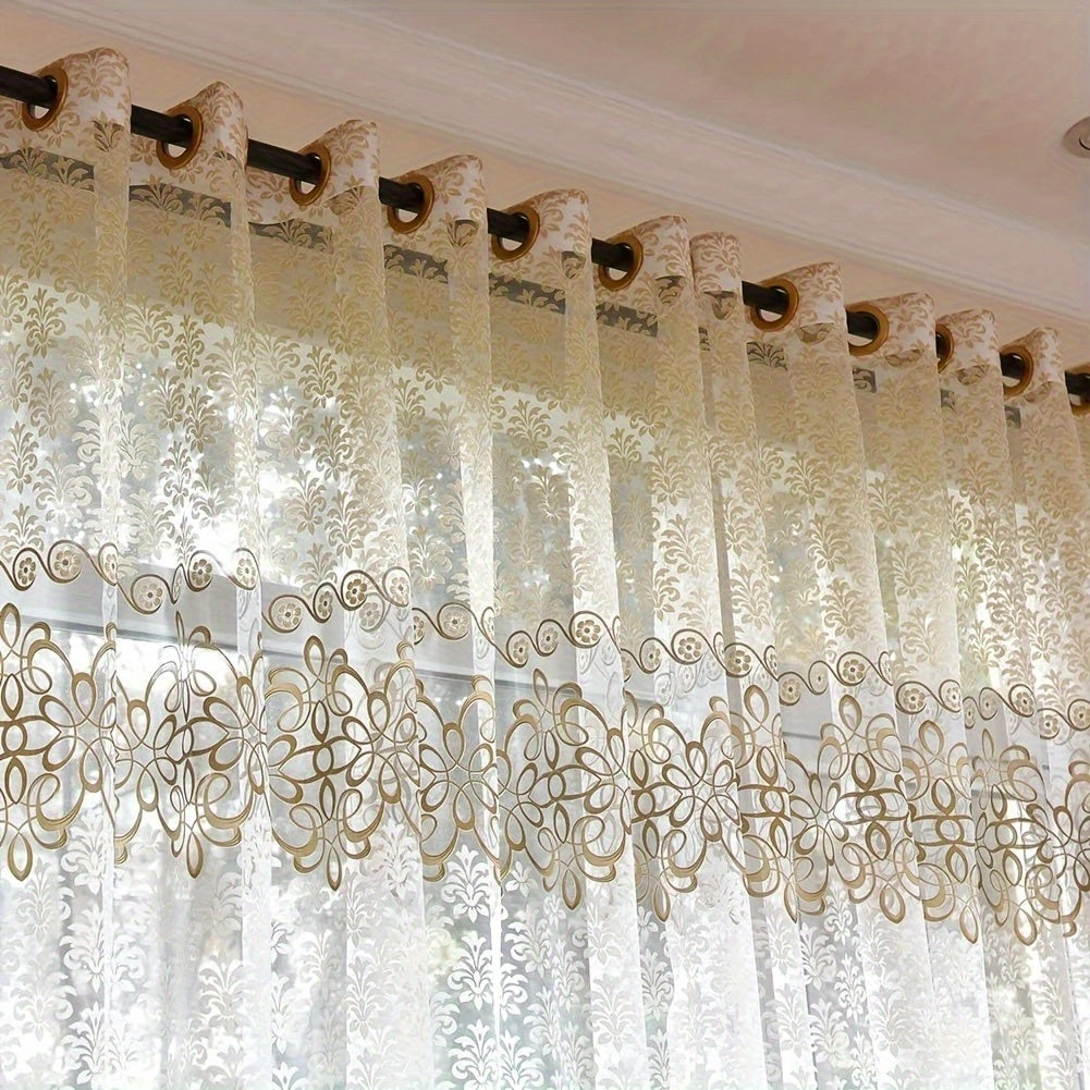 2pcs Golden Grey Floral Pattern Curtain Sheer Curtain Eyelet Grommet Top Curtain For Living Room Bedroom Office Home Decor