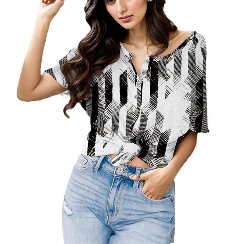 Fashion V-neck Printed Button Short Sleeve Women's Blouse