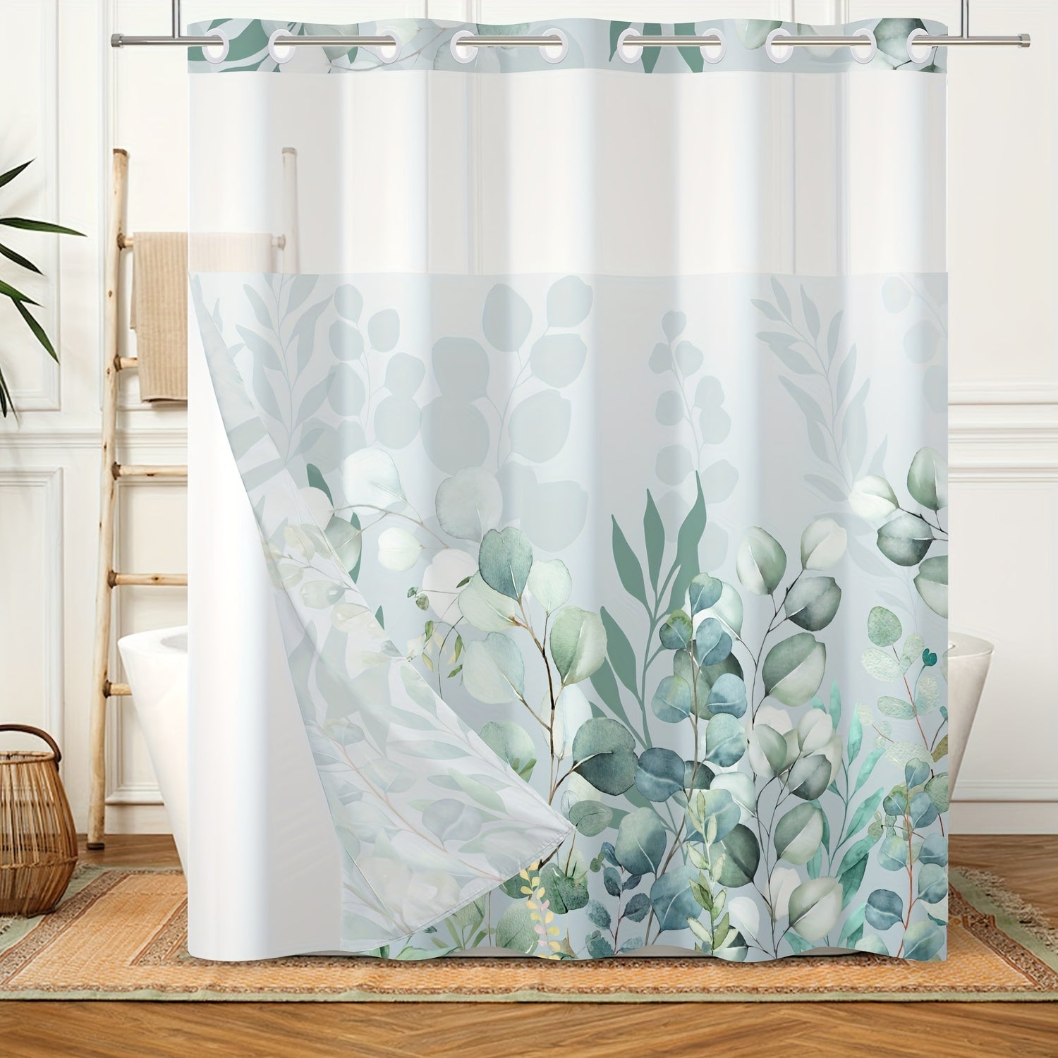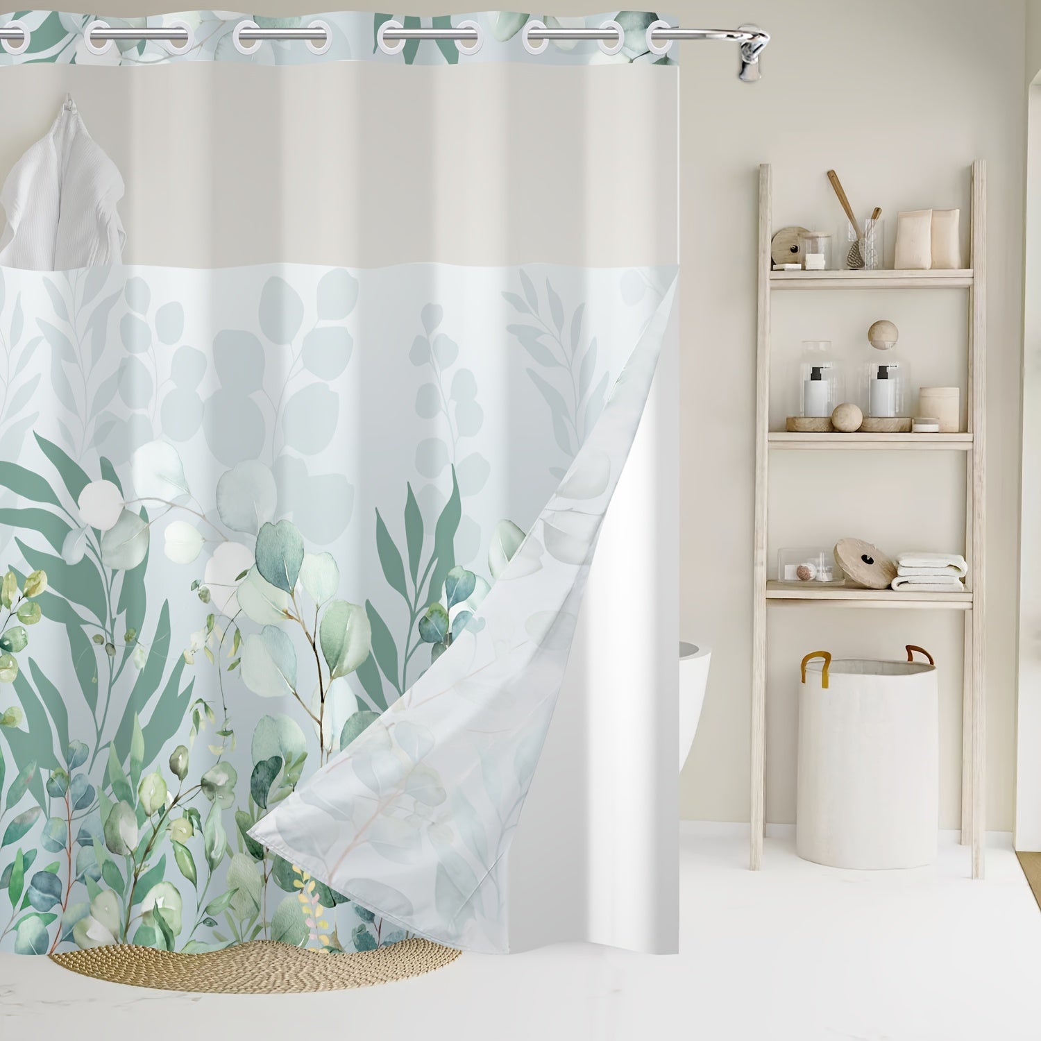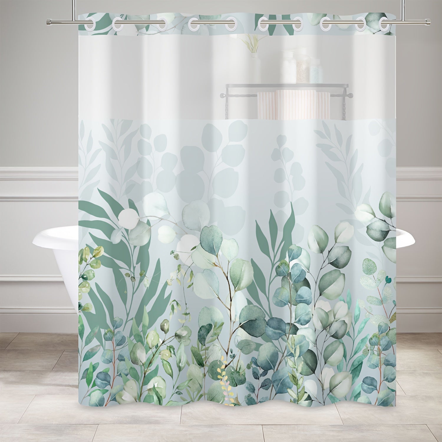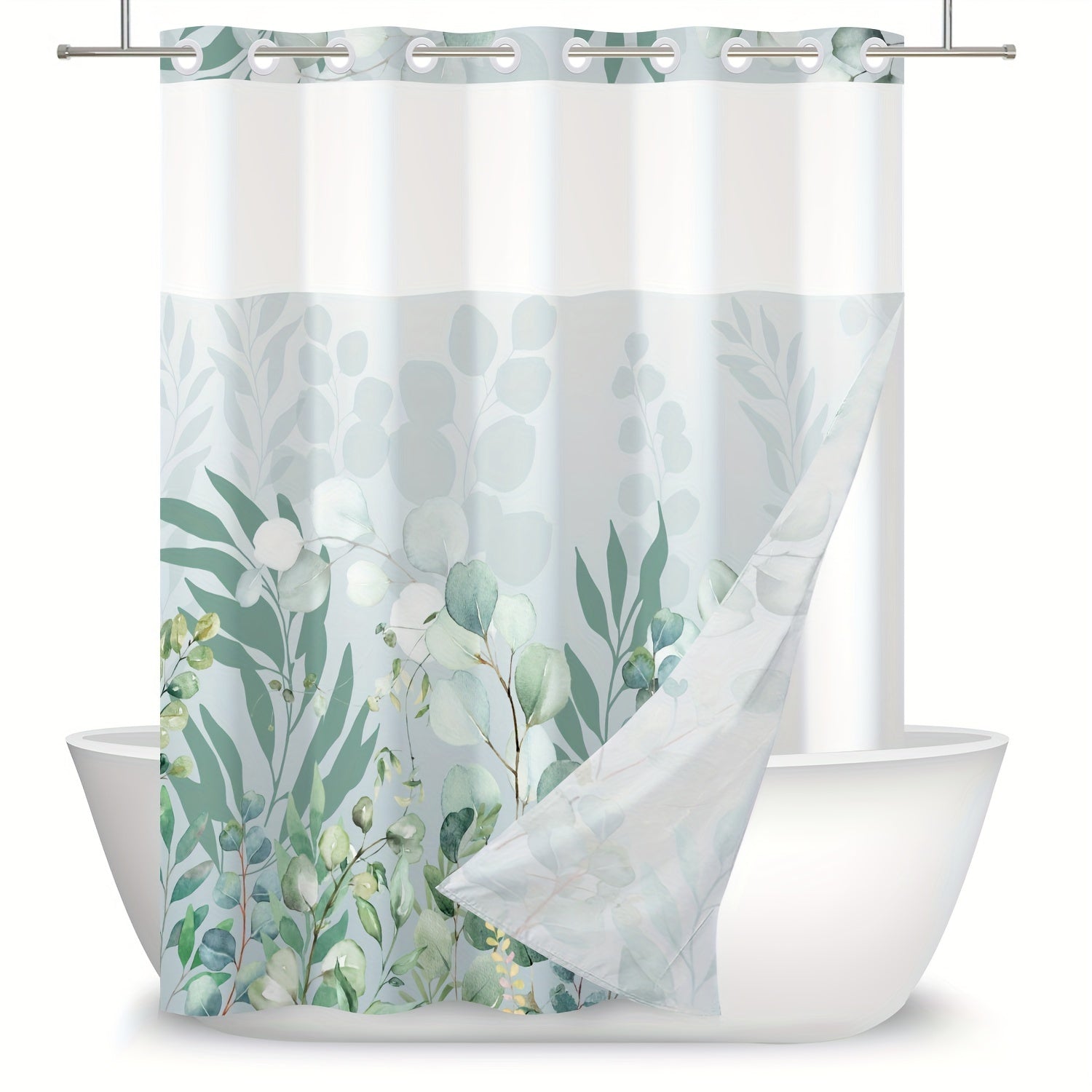 Sage Green Eucalyptus Leaf Shower Curtain Set, No Hook Shower Curtain With See Through Mesh Top Window, Plant No Hooks Needed Shower Curtain With Snap In Liner, Hotel Bathroom Decor 71x74 Inches