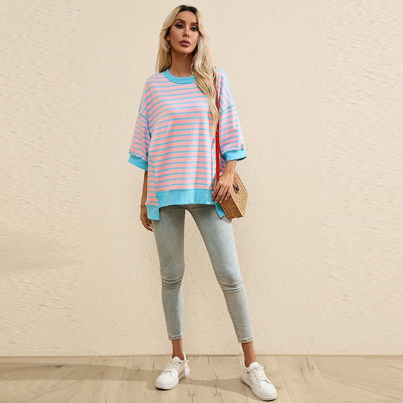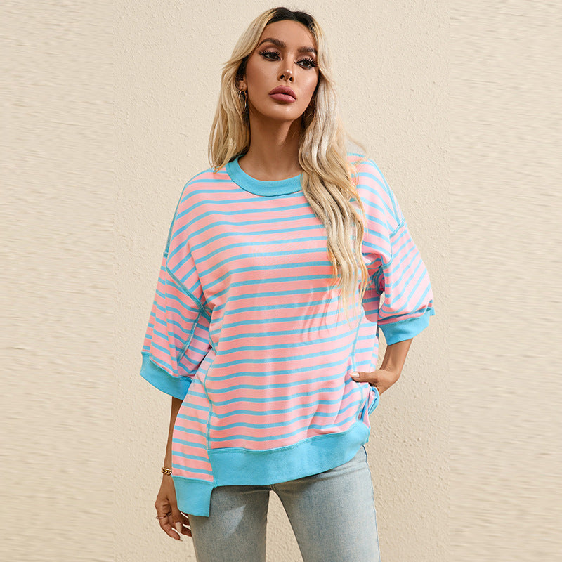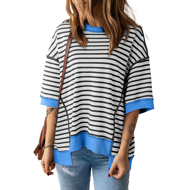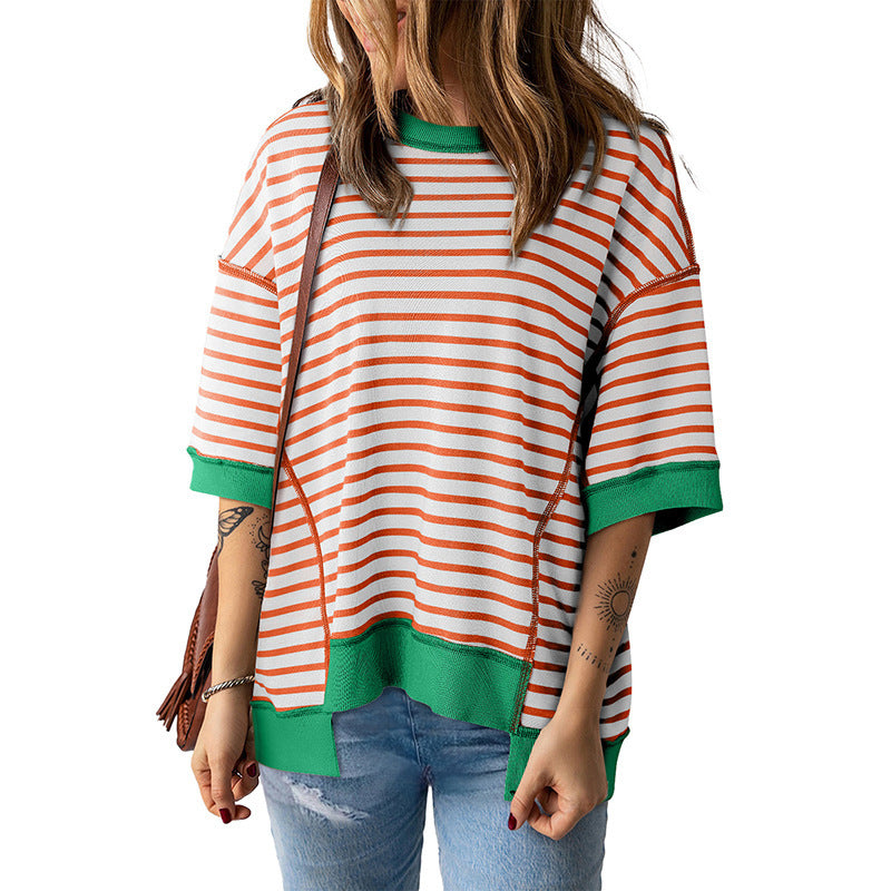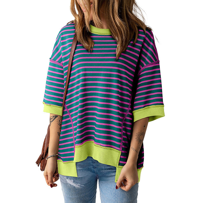 Women's Striped Color Matching Short-sleeved T-shirt