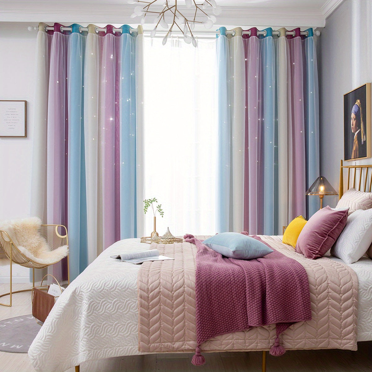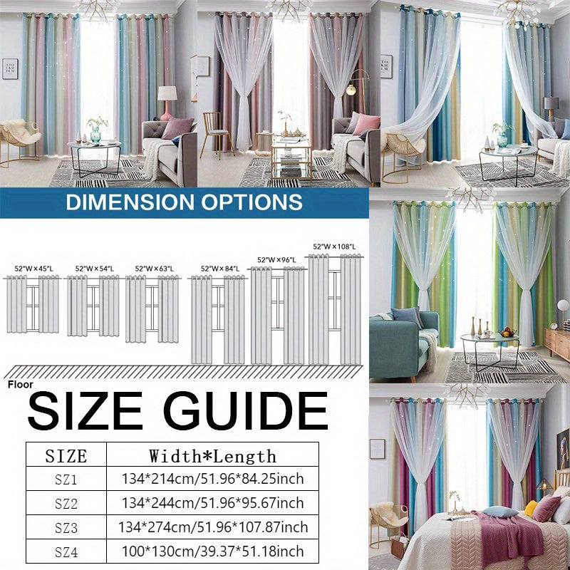 • Geometric Pattern :The curtains feature a unique geometric pattern, adding a modern and stylish touch to any room. • Double-Layer Perforated Design :The double-layer perforated design allows for optimal light control and adds depth to your decor. • Hollowed Out Stars :The hollowed out stars design adds a whimsical element, making it perfect for children's rooms or playrooms. • High Shading Rate :With a shading rate of 41%-85%, these curtains are highly effective at blocking out sunlight, making them ideal for brightly lit rooms. • Versatile Installation :Designed for ceiling installation, these curtains can be easily installed in various configurations, offering flexibility in design. • Durable Material :Made from 100% polyester, these curtains are durable and long-lasting, ensuring they remain a stylish addition to your home for years to come.