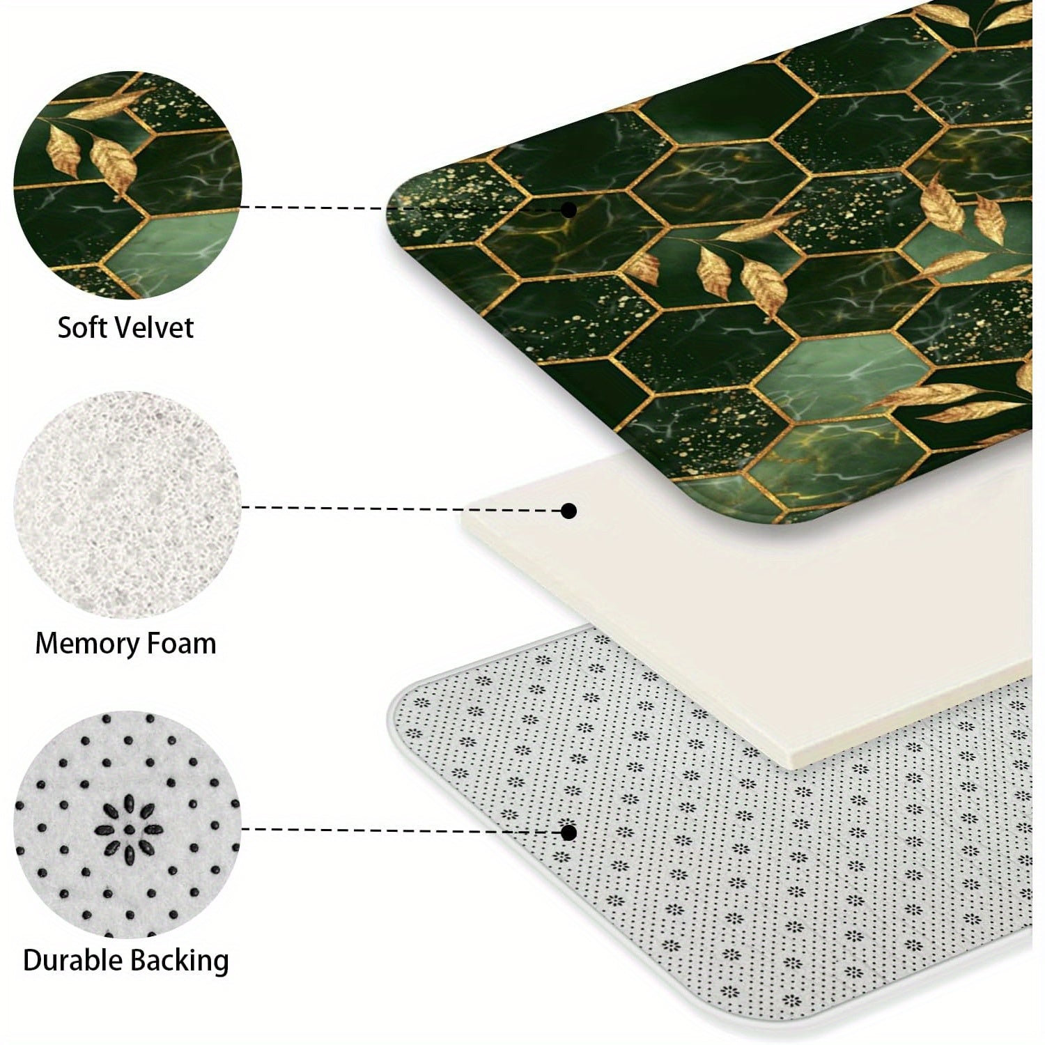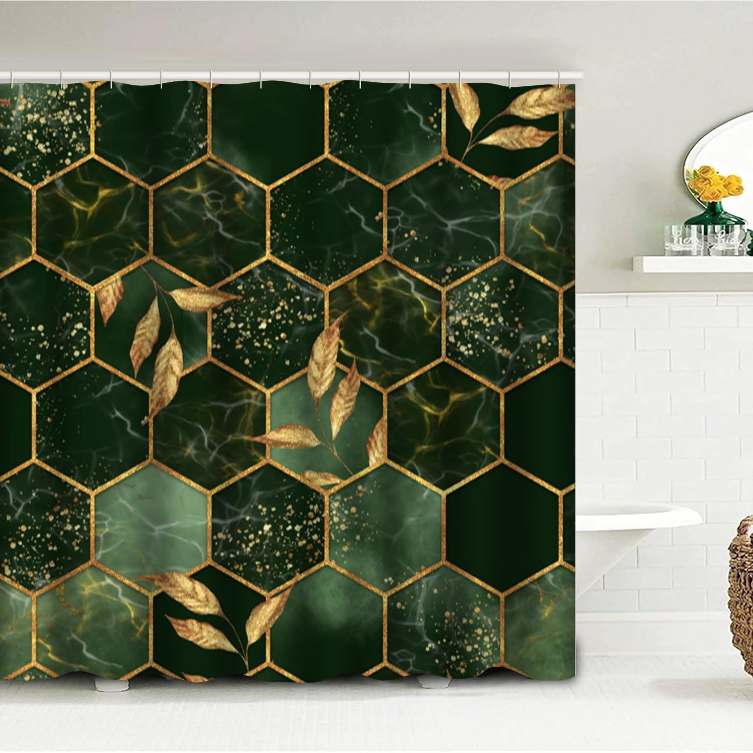 4-Piece Marble Hexagon Bathroom Shower Curtain Set - Water-Repellent, Golden Green Geometric Design, Floral Leaves Pattern, Includes Shower Curtain, Rugs, Mats, and Towels - Complete Bathroom Decor Solution