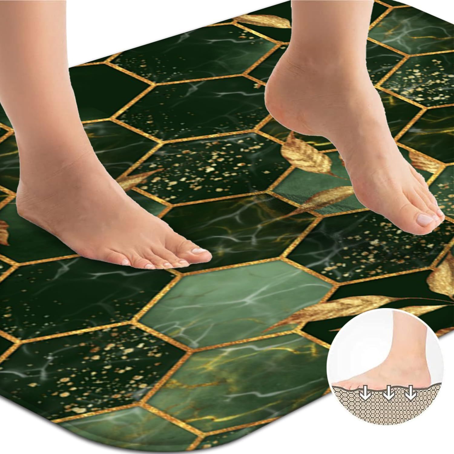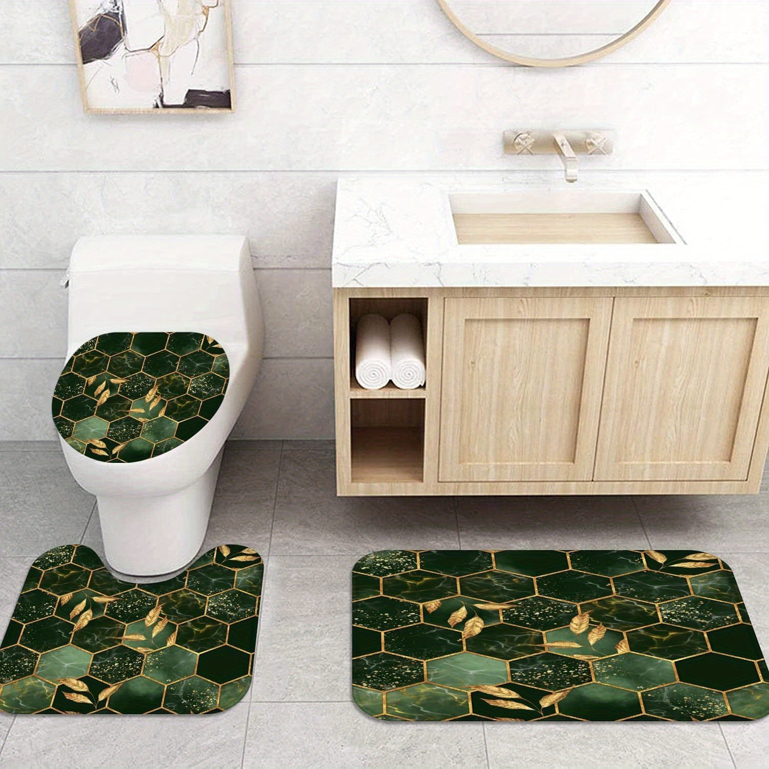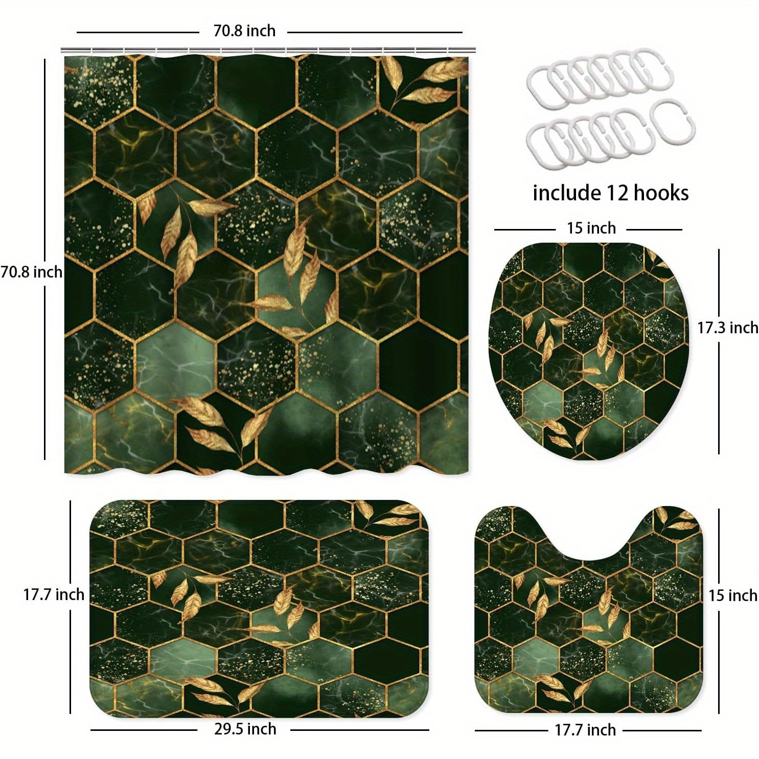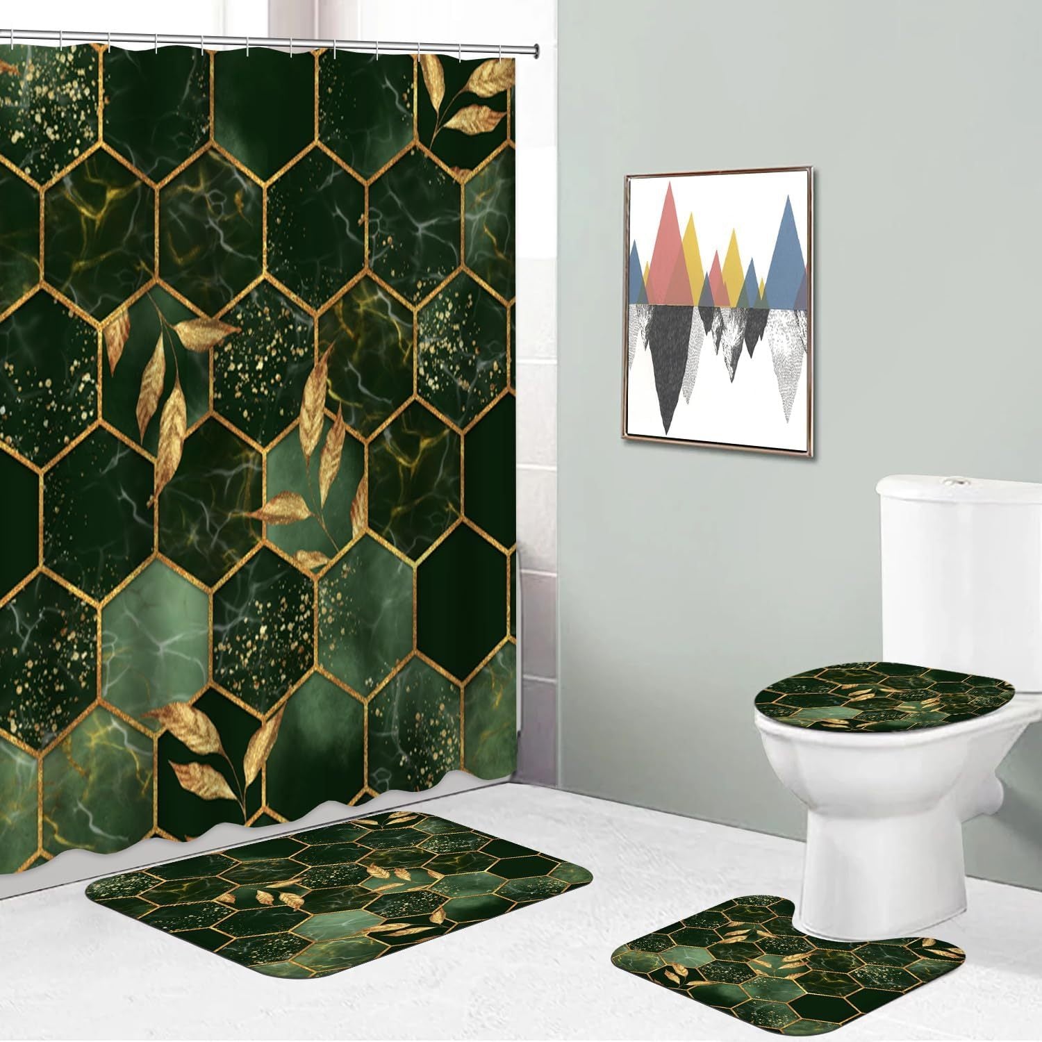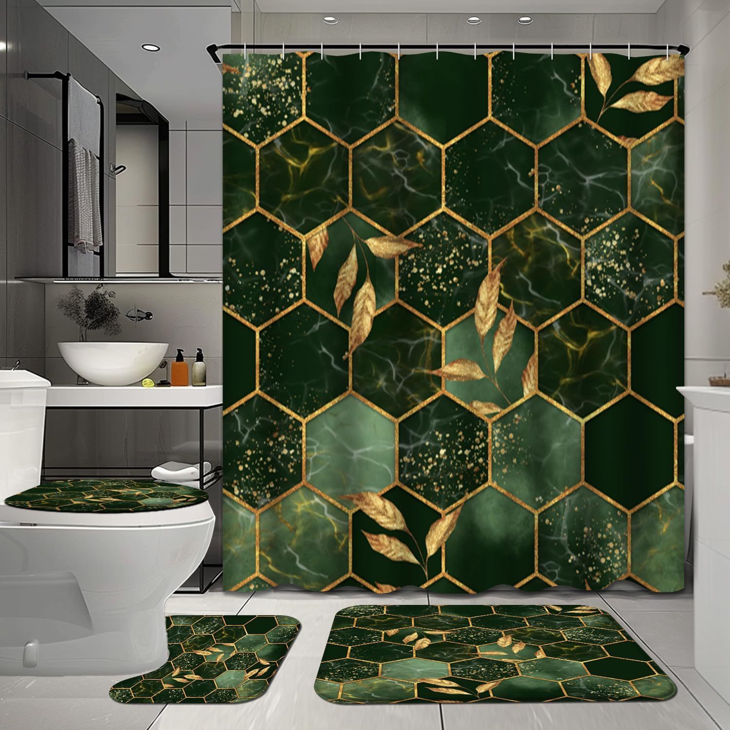 4-Piece Marble Hexagon Bathroom Shower Curtain Set - Water-Repellent, Golden Green Geometric Design, Floral Leaves Pattern, Includes Shower Curtain, Rugs, Mats, and Towels - Complete Bathroom Decor Solution