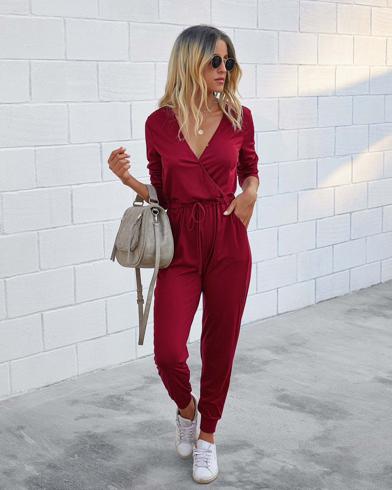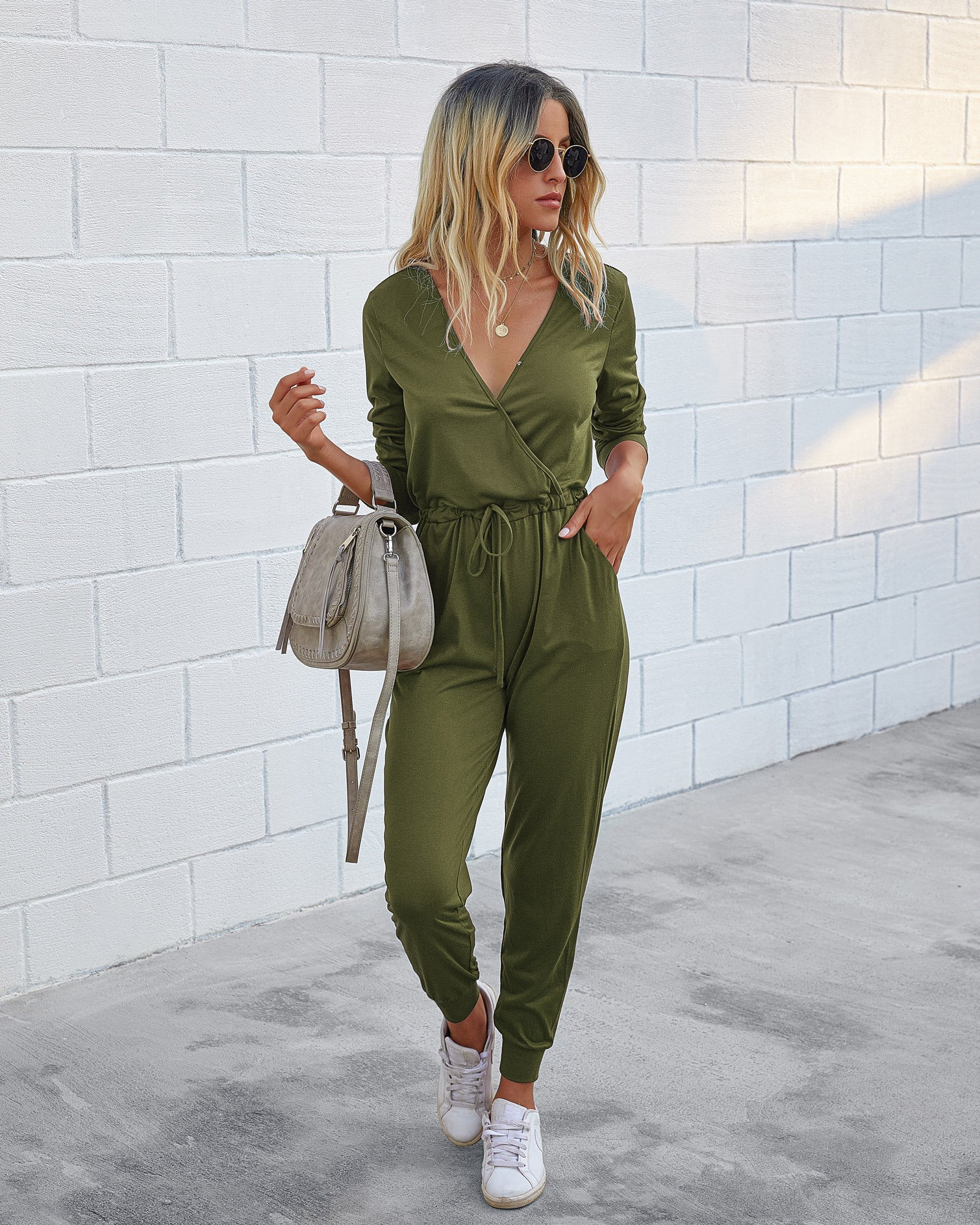 Popular elements: Concealed buckle, solid color, tie, V-neck pocket