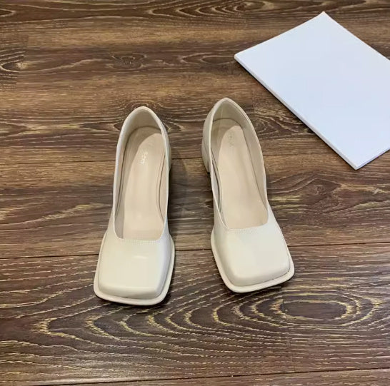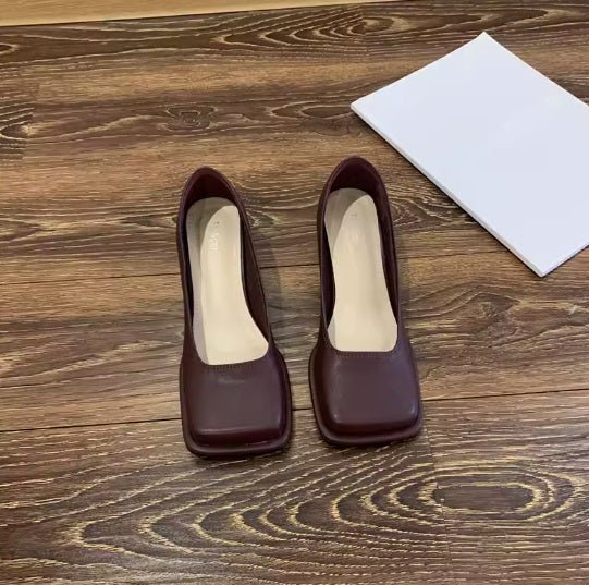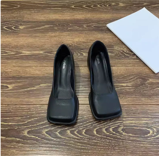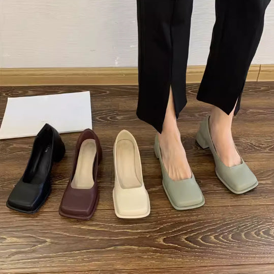 Hepburn Style Square Toe Shallow Mouth Thick Heel Wide Toe