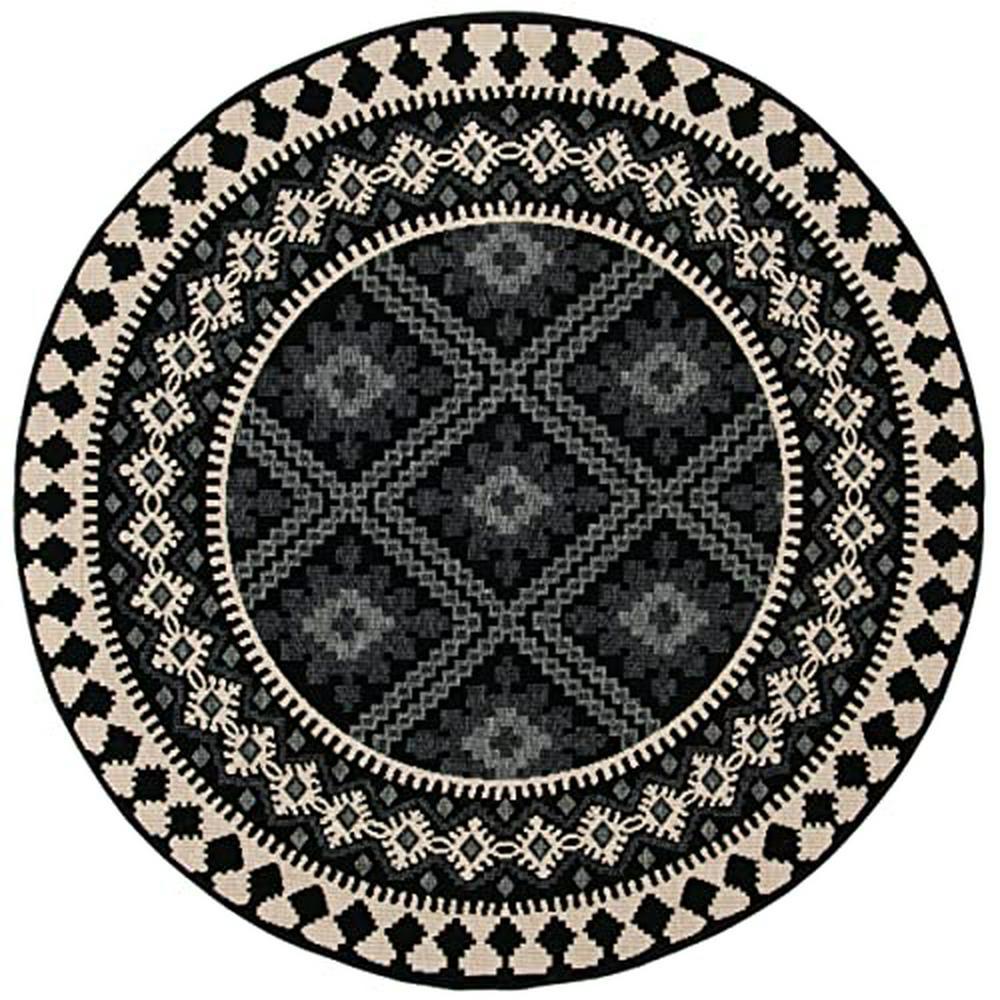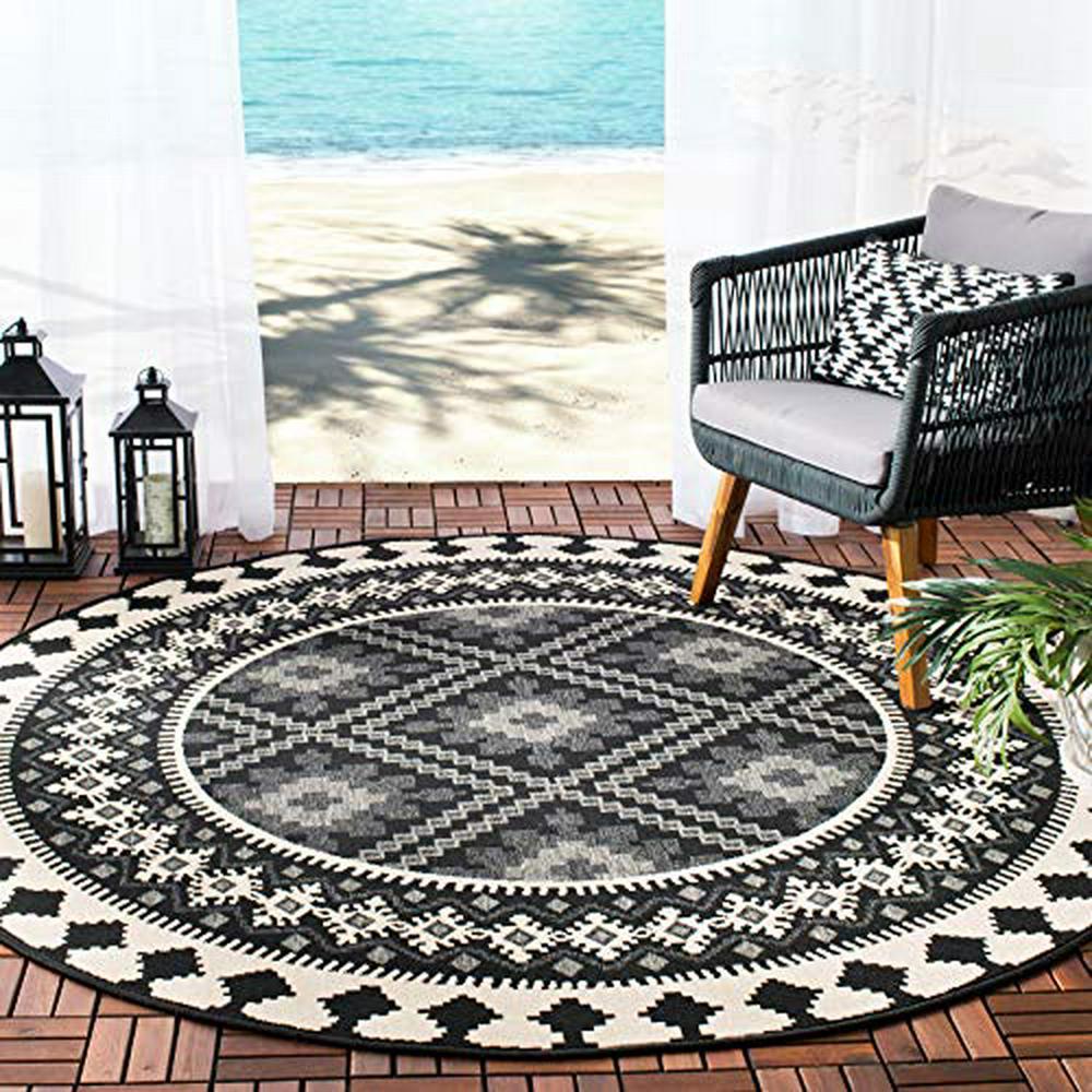 Introducing the Veranda Collection 5'3" Round Black/Cream Area Rug, a perfect blend of style and functionality for both indoor and outdoor spaces. This rug is designed with a striking boho pattern that easily elevates any patio, backyard, porch, deck, or mudroom setting. The intricate black and cream design adds a touch of elegance and sophistication, creating an inviting atmosphere wherever it is placed. Crafted from enhanced synthetic durable fibers, the rug is both stain and weather-resistant, making it ideal for high-traffic areas. The power-loomed construction ensures the fibers remain intact and retain their vibrant colors, despite exposure to the elements. With a non-shedding 0.25-inch thick pile, it provides a comfortable underfoot feel while requiring minimal maintenance. Designed with busy households in mind, this kid and pet-friendly rug withstands life's inevitable messes. Whether exposed to high foot traffic or unexpected spills, it maintains its structure and appearance with ease. Cleaning is stress-free; simply vacuum regularly or rinse with a garden hose and soapy water, then air dry. For trusted quality, look no further than SAFAVIEH, a renowned brand with over a century of expertise in home furnishings.