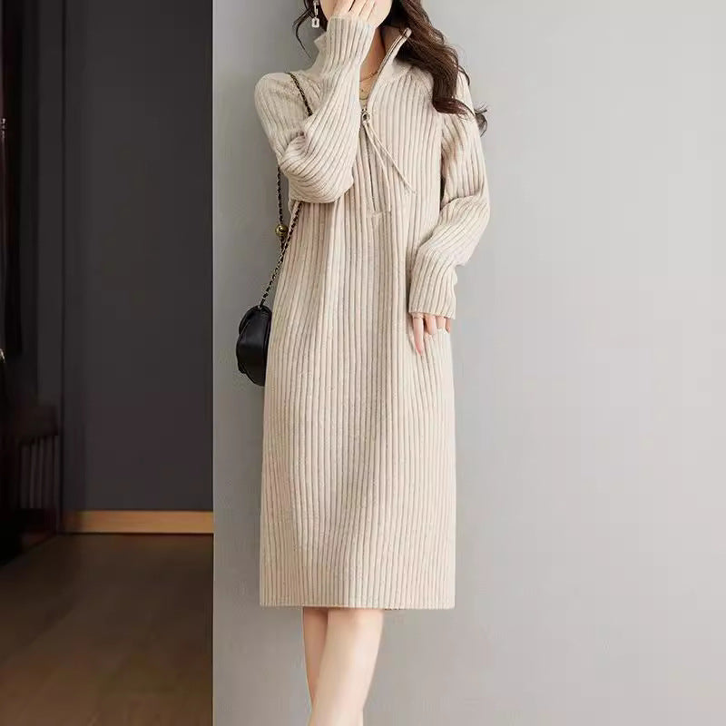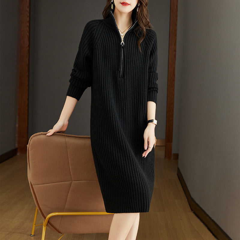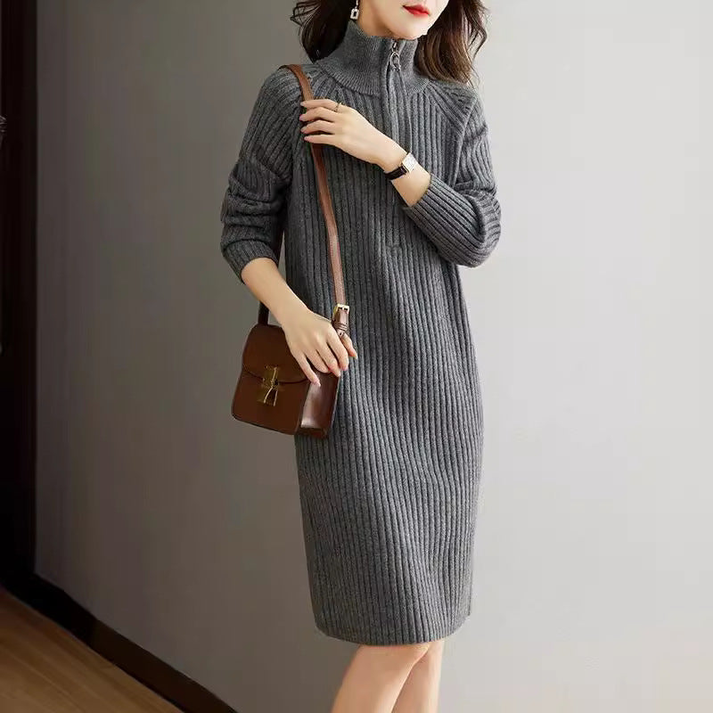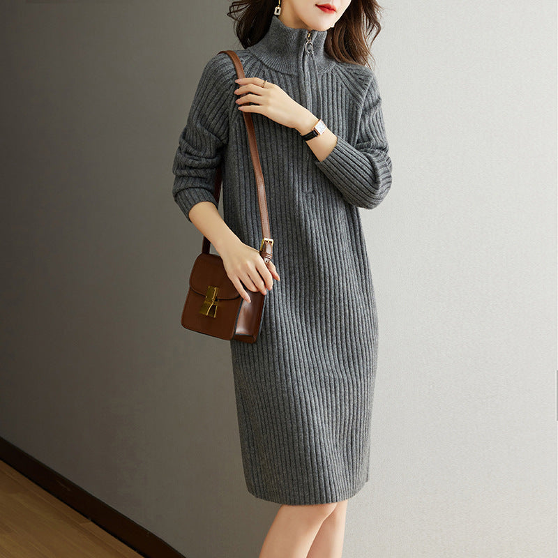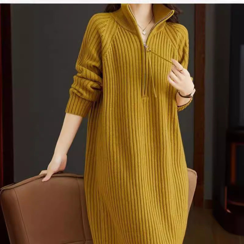 Bedford Cord Sweater Women's Dress Stand Collar Zipper Autumn And Winter Turtleneck Loose Knit