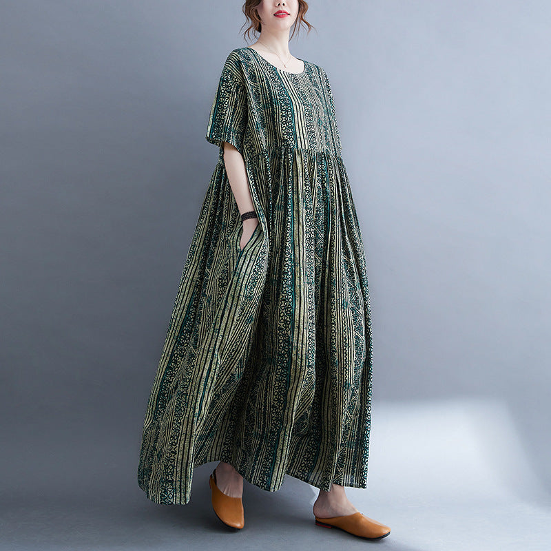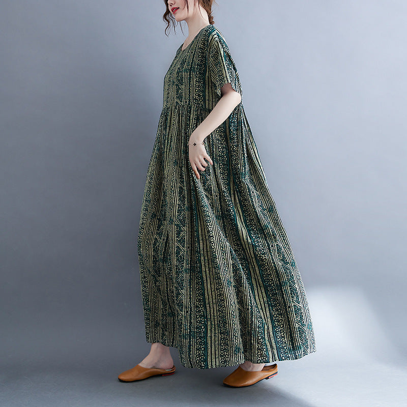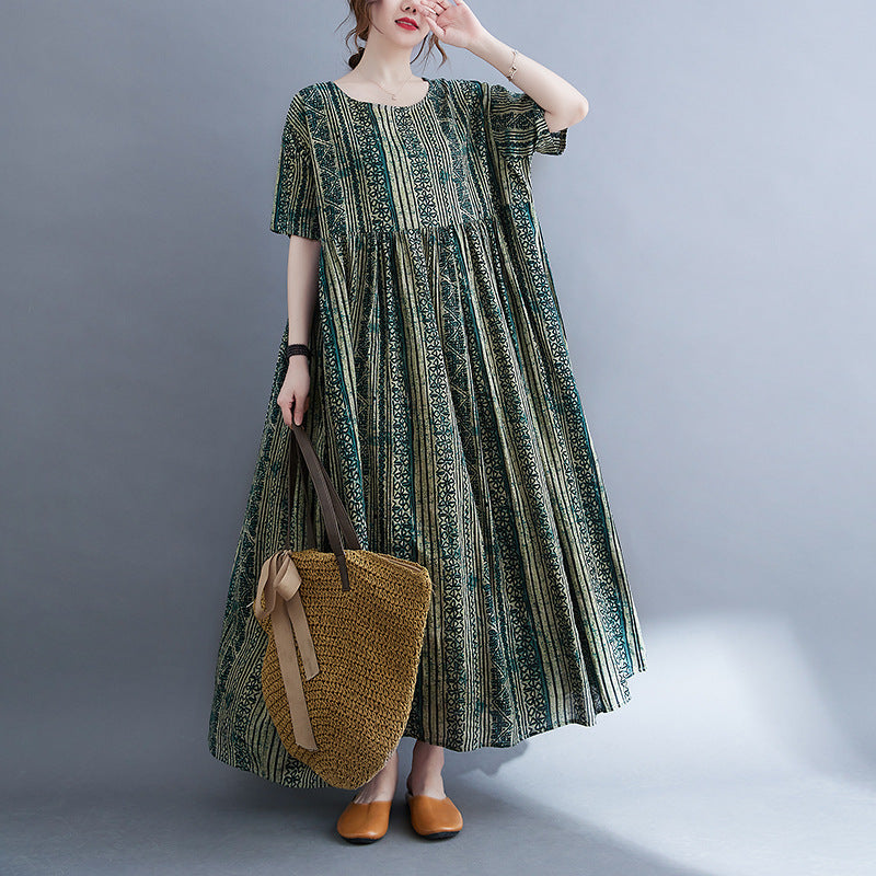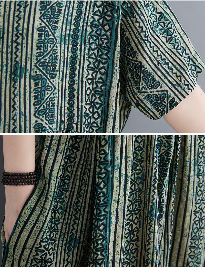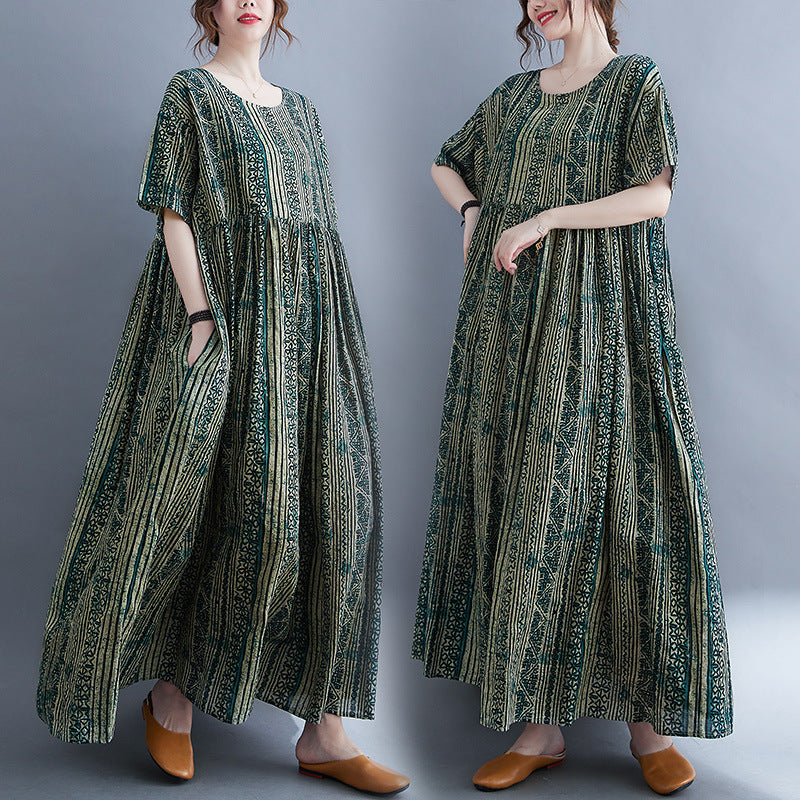 Loose Ladies Cotton Linen Printed Short Sleeve Dress