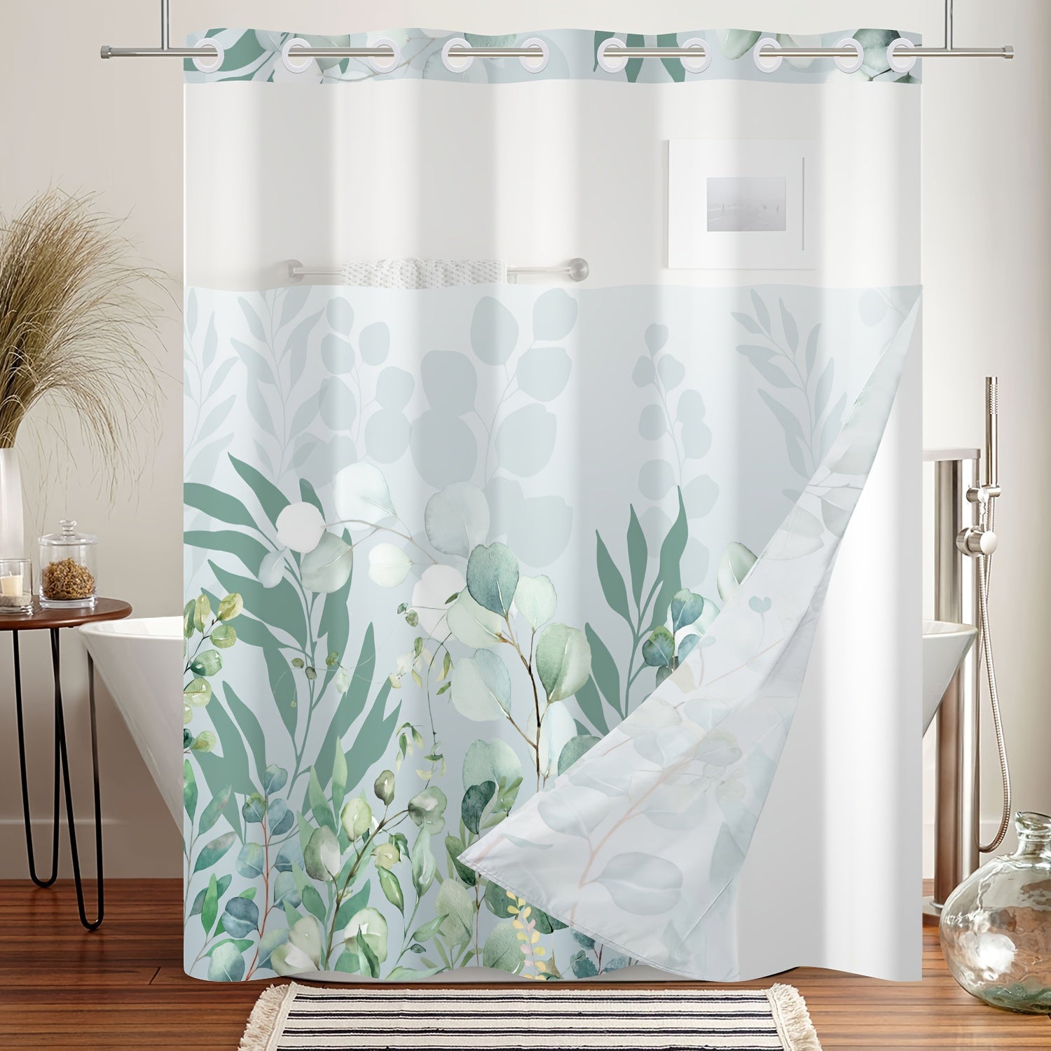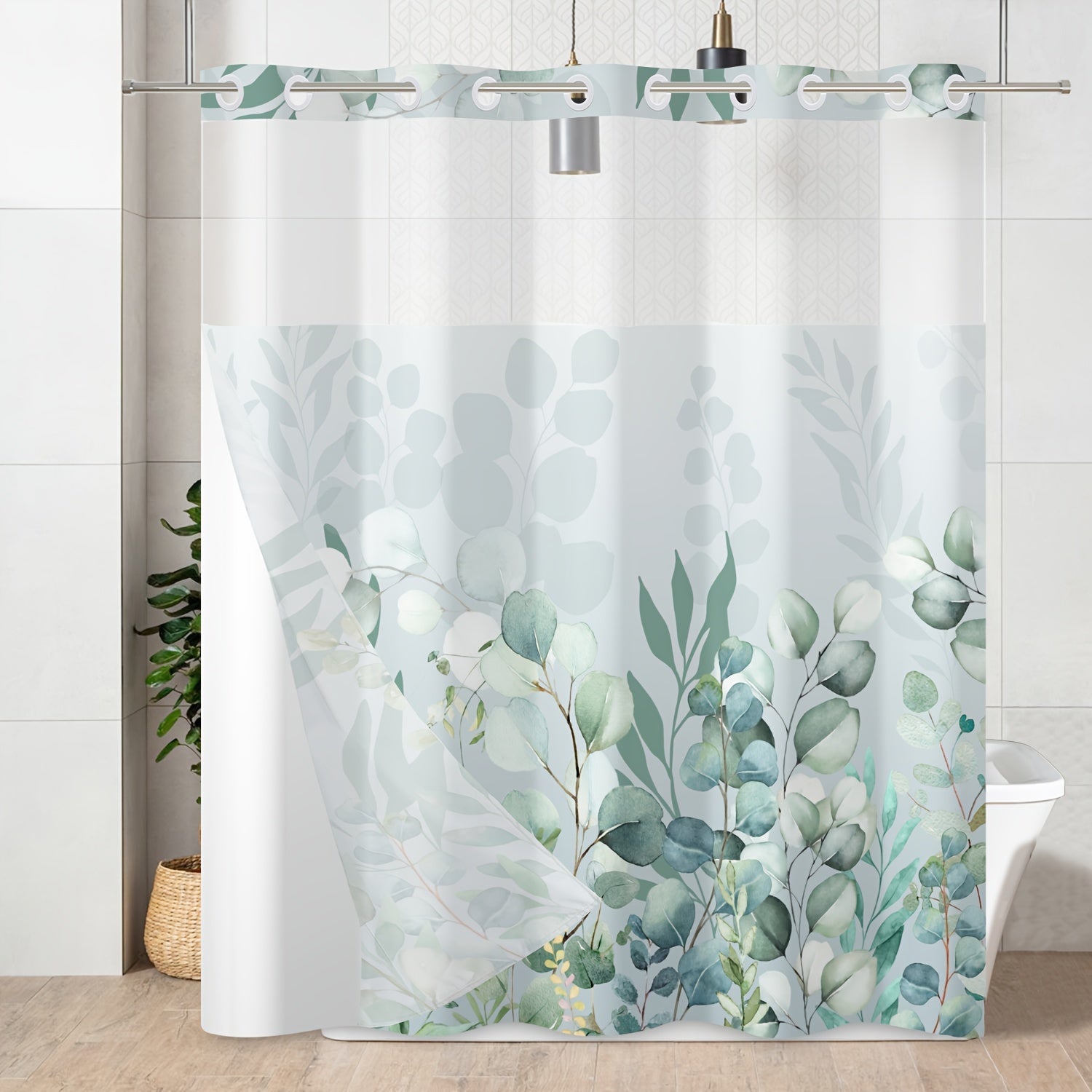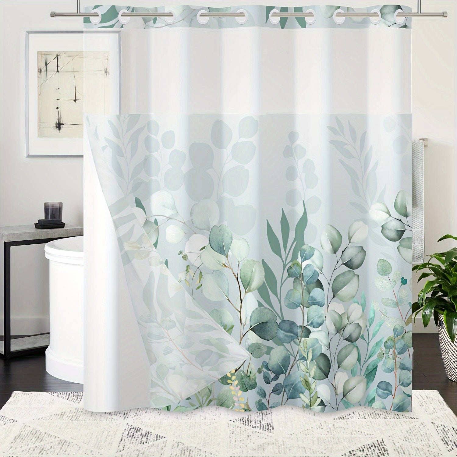 Sage Green Eucalyptus Leaf Shower Curtain Set, No Hook Shower Curtain With See Through Mesh Top Window, Plant No Hooks Needed Shower Curtain With Snap In Liner, Hotel Bathroom Decor 71x74 Inches