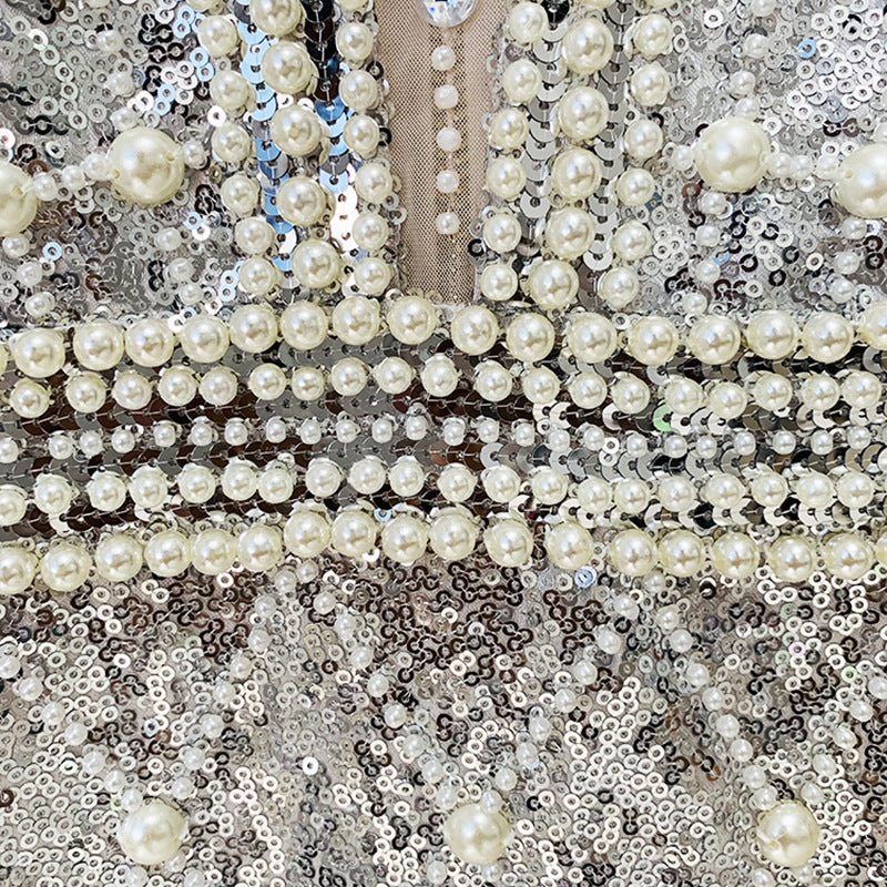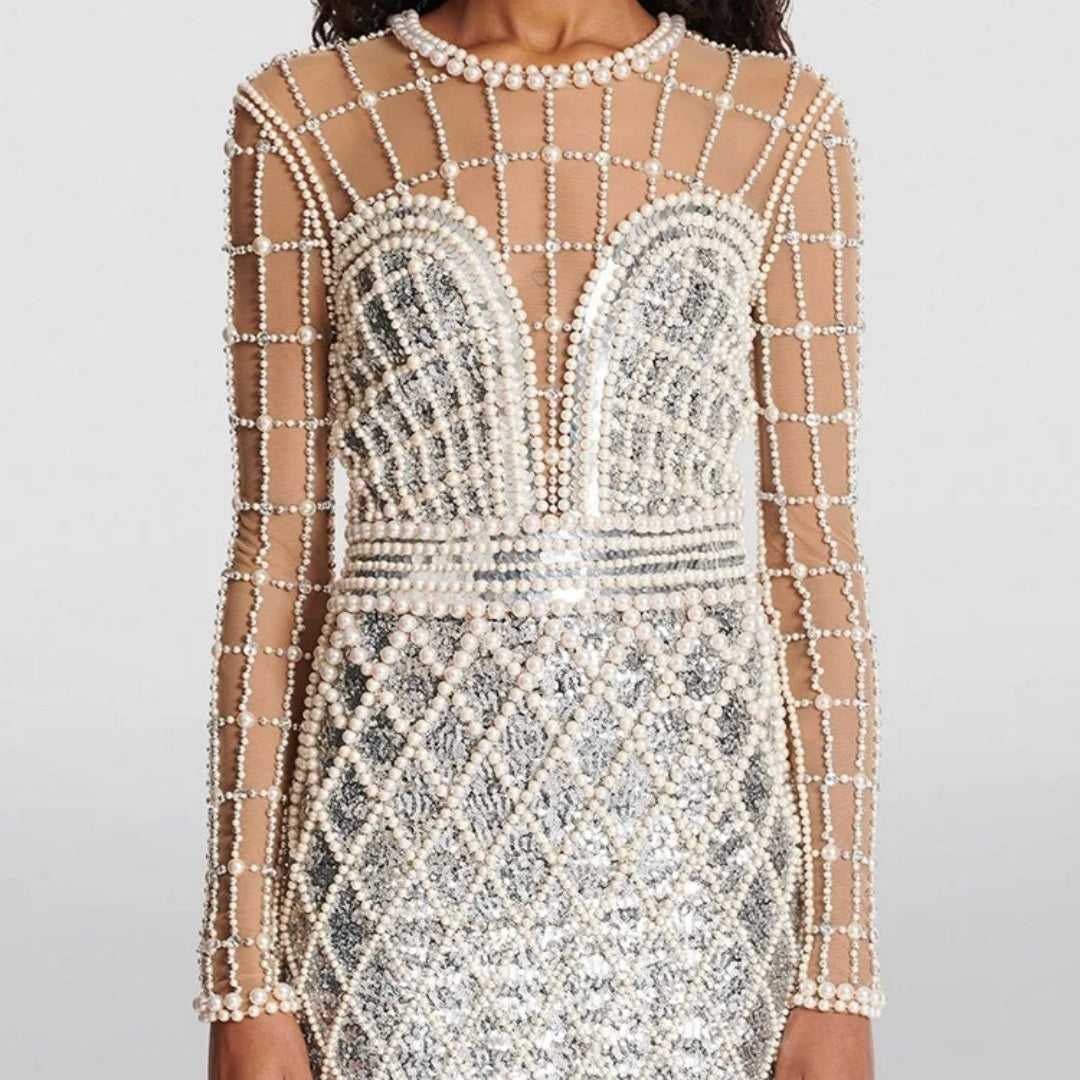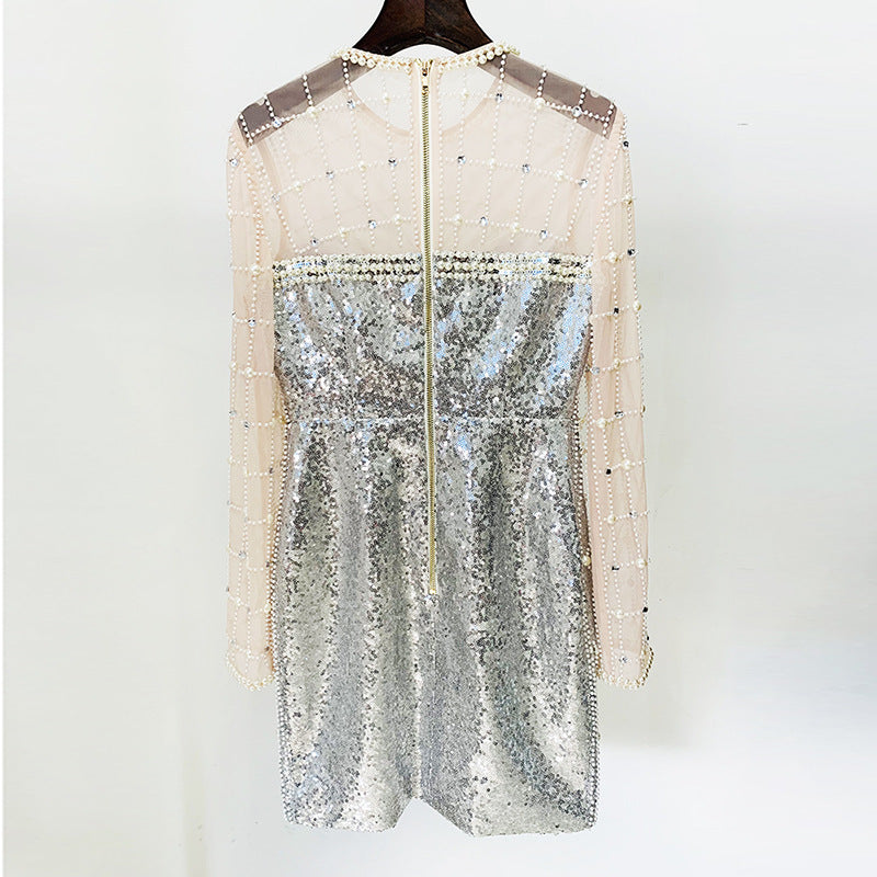 Fashionable Pearl Heavy Industry Nailed Pearl Sequin Long Sleeved Mesh Dress