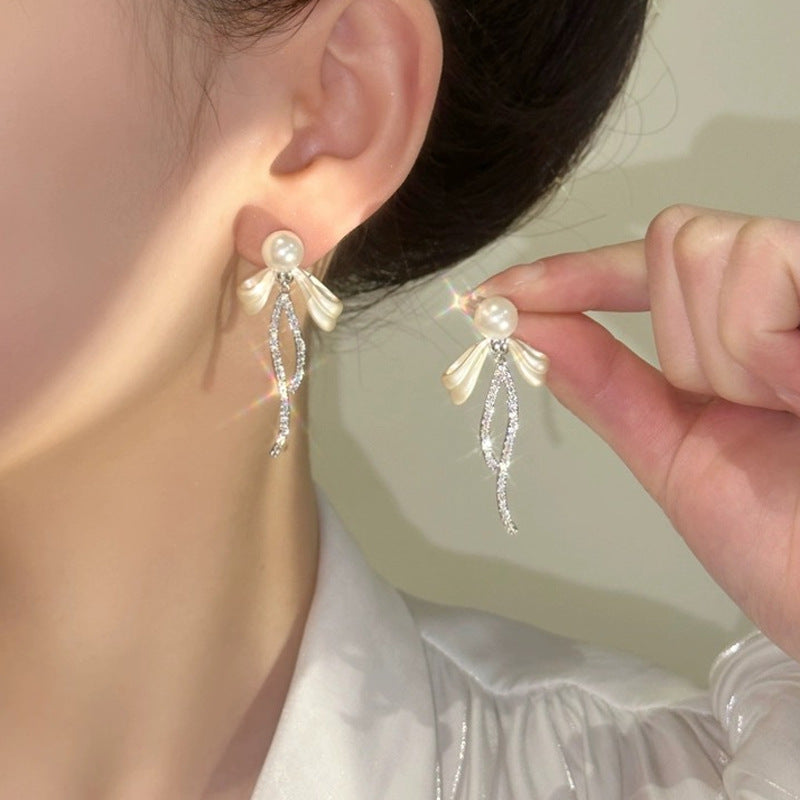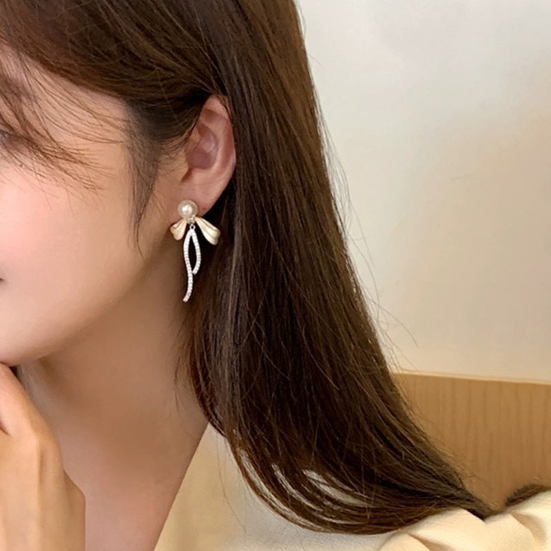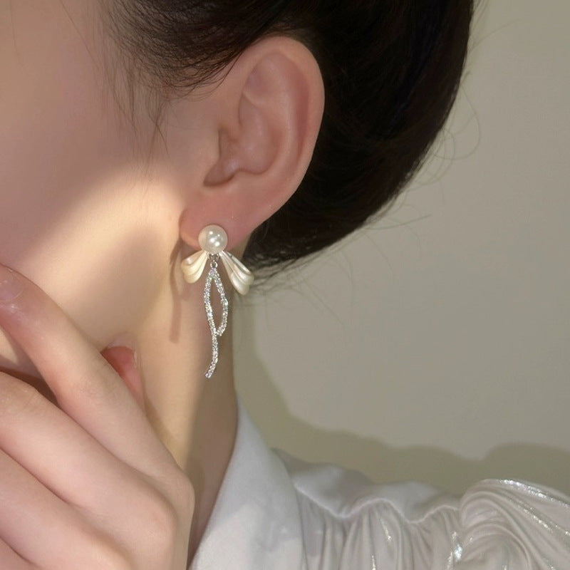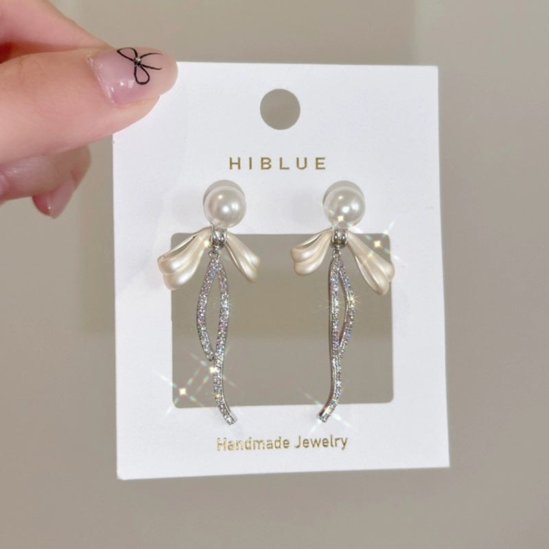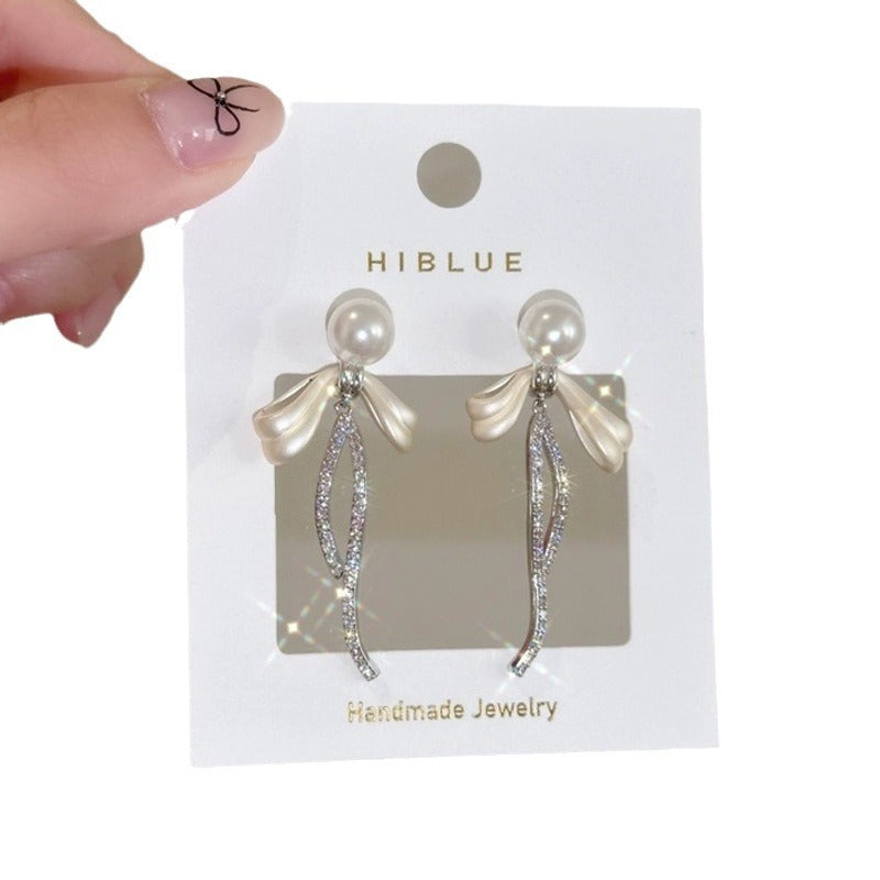Navy Blue Tassel Long Bow Tie Female Stud Earrings