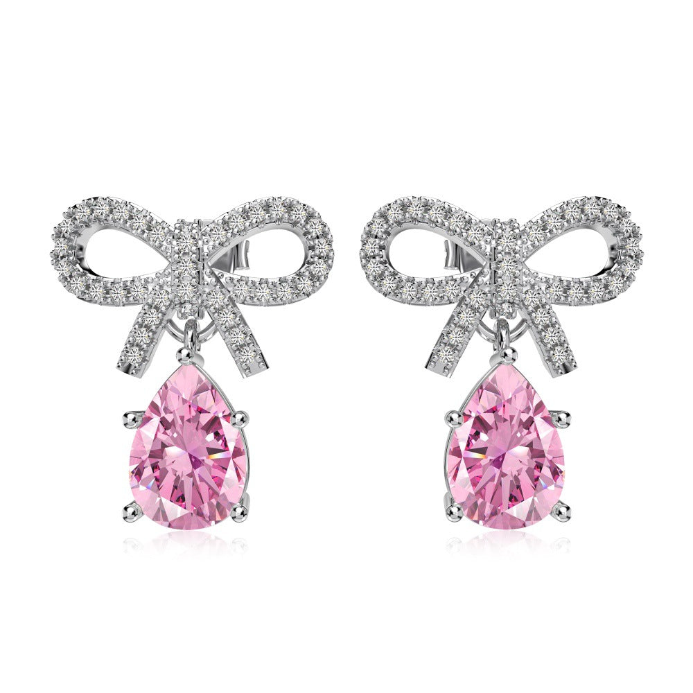 Silver S925 Pink Pear-shaped Water Drop Bow Design Niche Exquisite Fashion Sense Women's Earrings