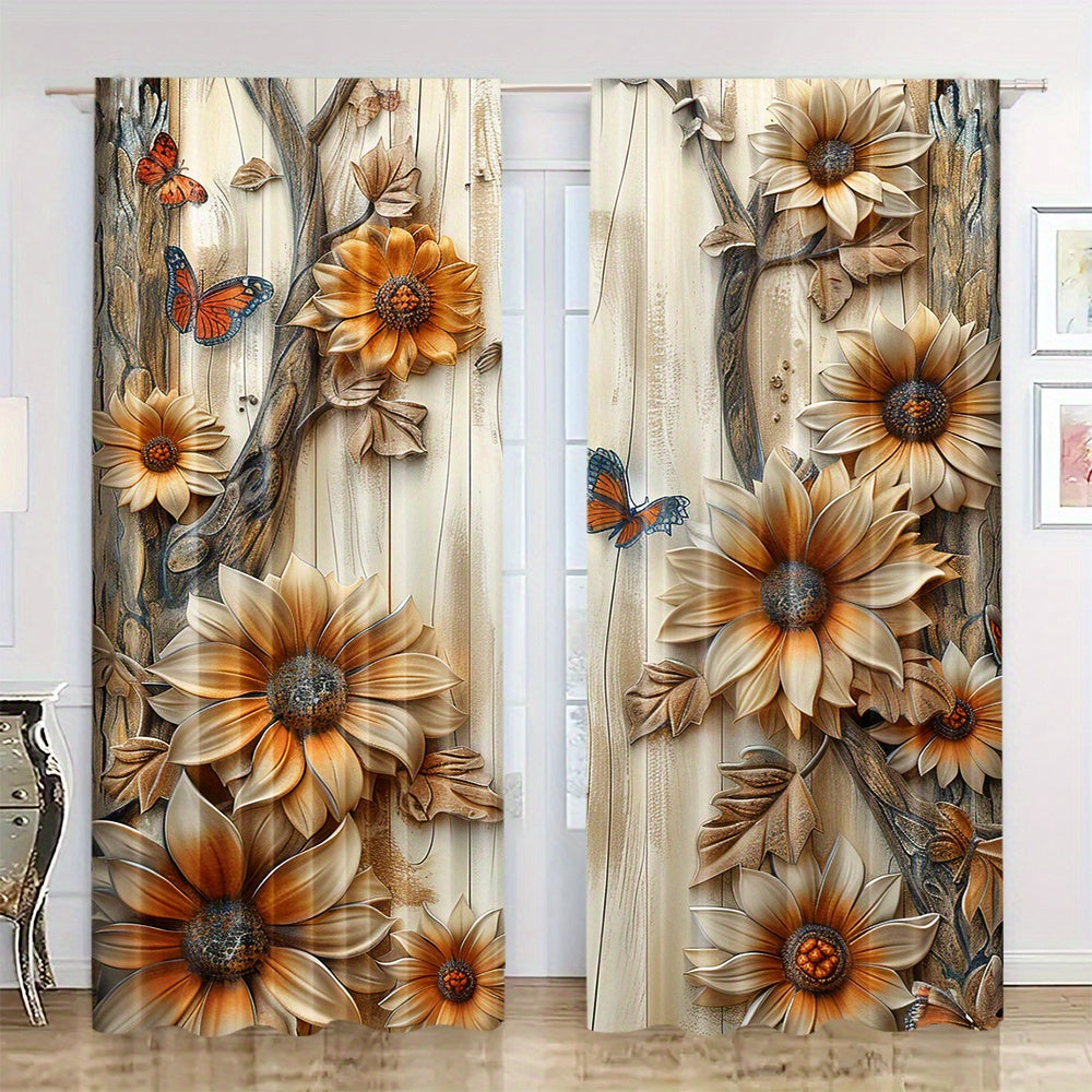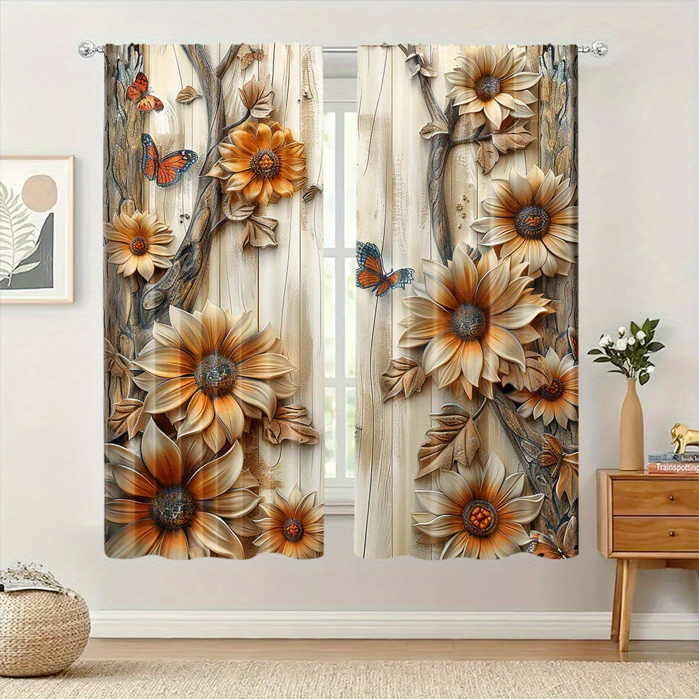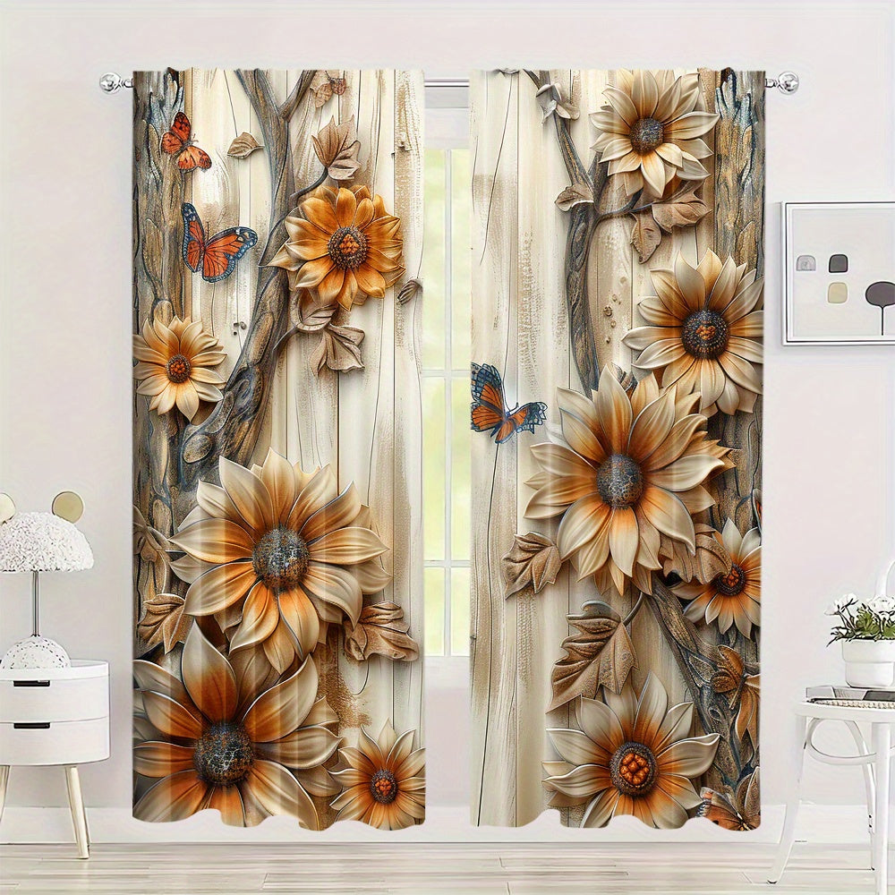 2-Piece Sunflower and Butterfly Blackout Curtain Set - Woven Polyester Pongee Rod Pocket Drapes, Embossed Roller Design, Machine Washable, for Bedroom & Living Areas, Contemporary Landscape Theme