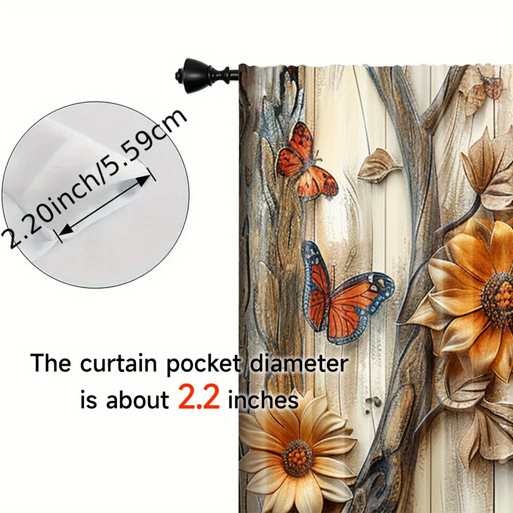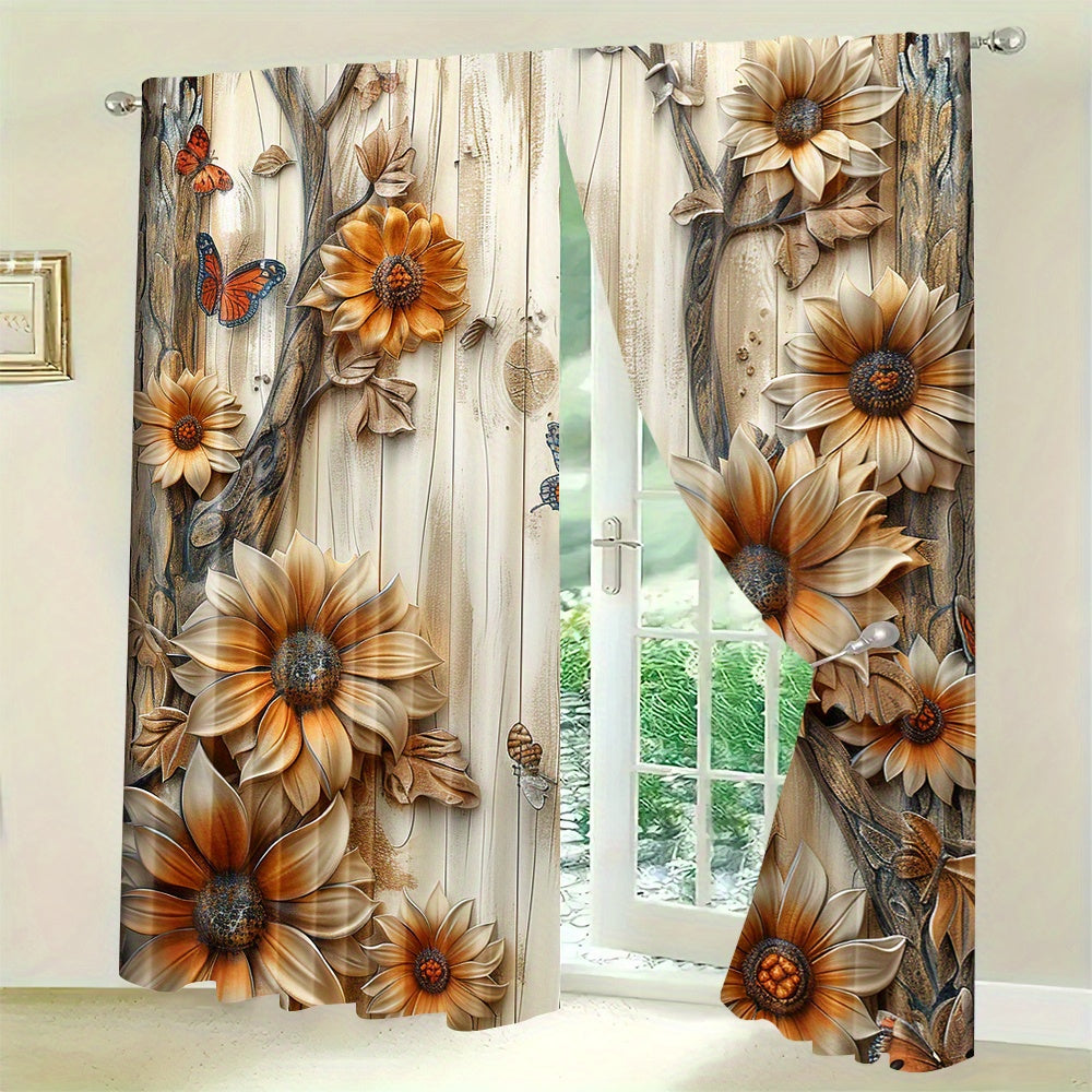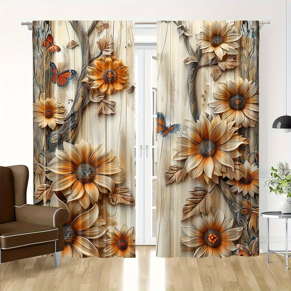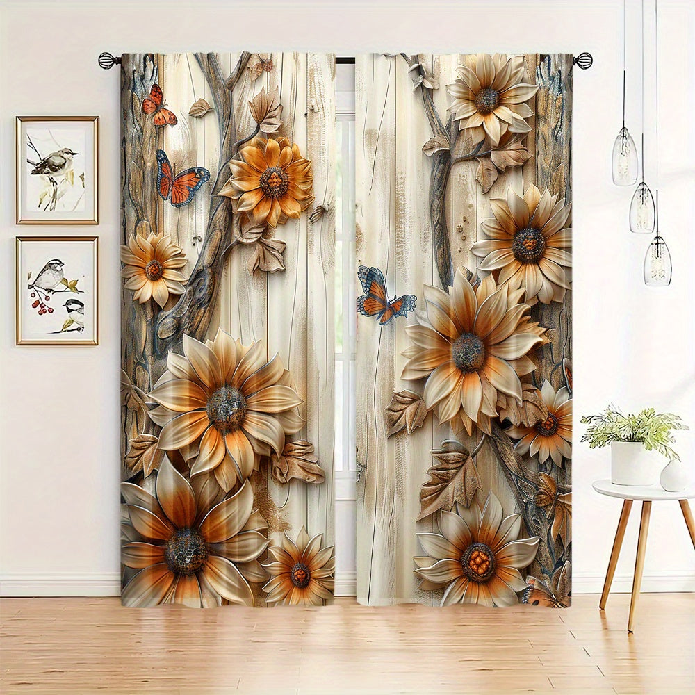 2-Piece Sunflower and Butterfly Blackout Curtain Set - Woven Polyester Pongee Rod Pocket Drapes, Embossed Roller Design, Machine Washable, for Bedroom & Living Areas, Contemporary Landscape Theme