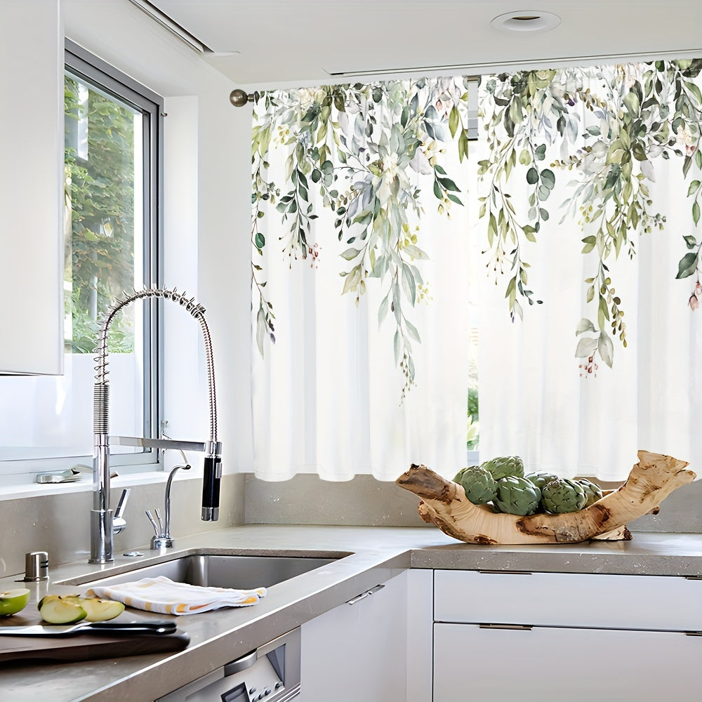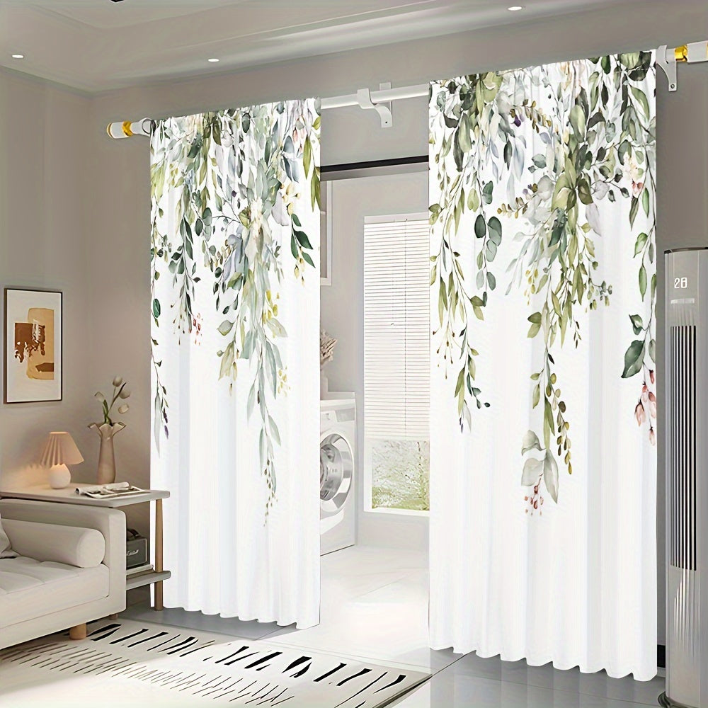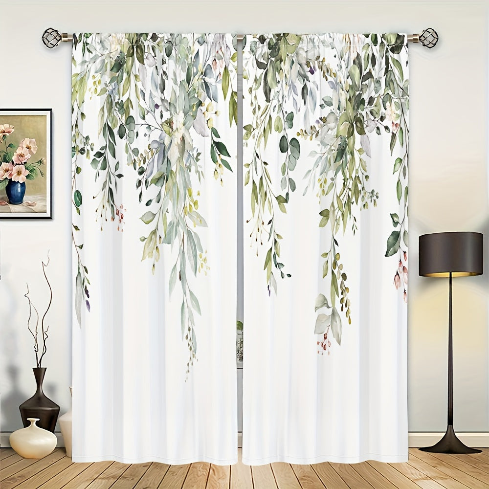 2PCS Semi-Blackout Green Eucalyptus Leaves Floral Printed Curtains, Reducing Thermal And Noise Curtain, Spring Farmhouse Naturally Rod Pocket Curtain Office Living Room Bedroom Dining Room Home Decor