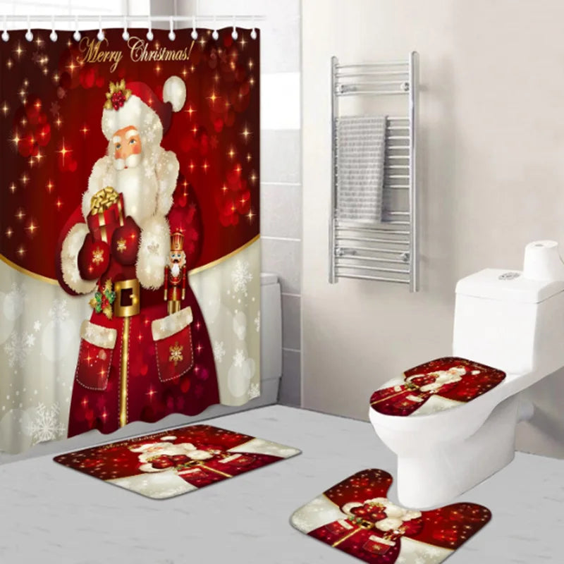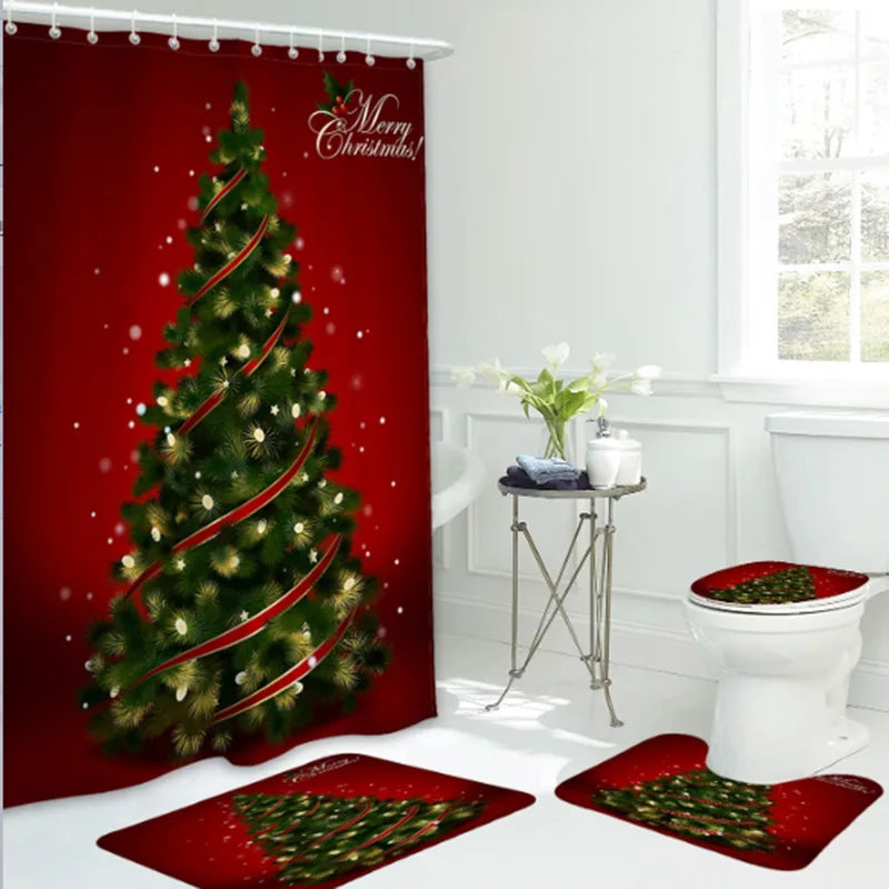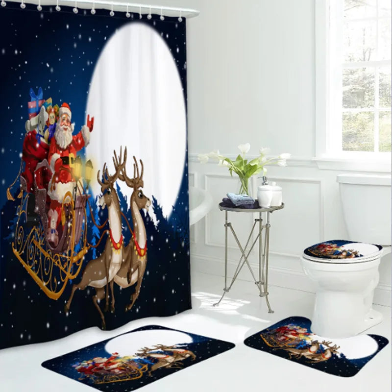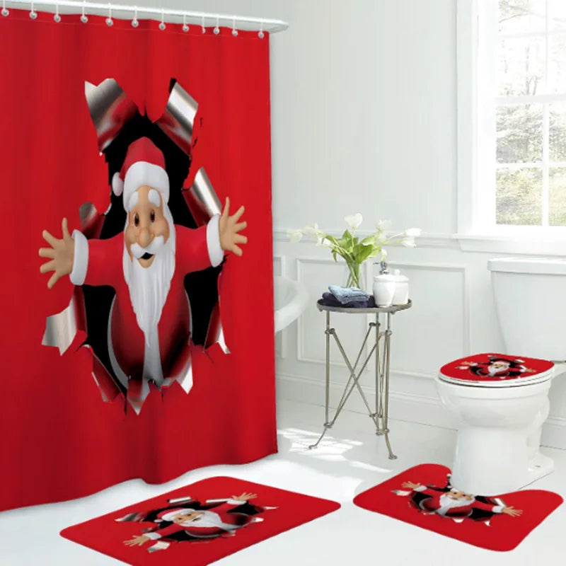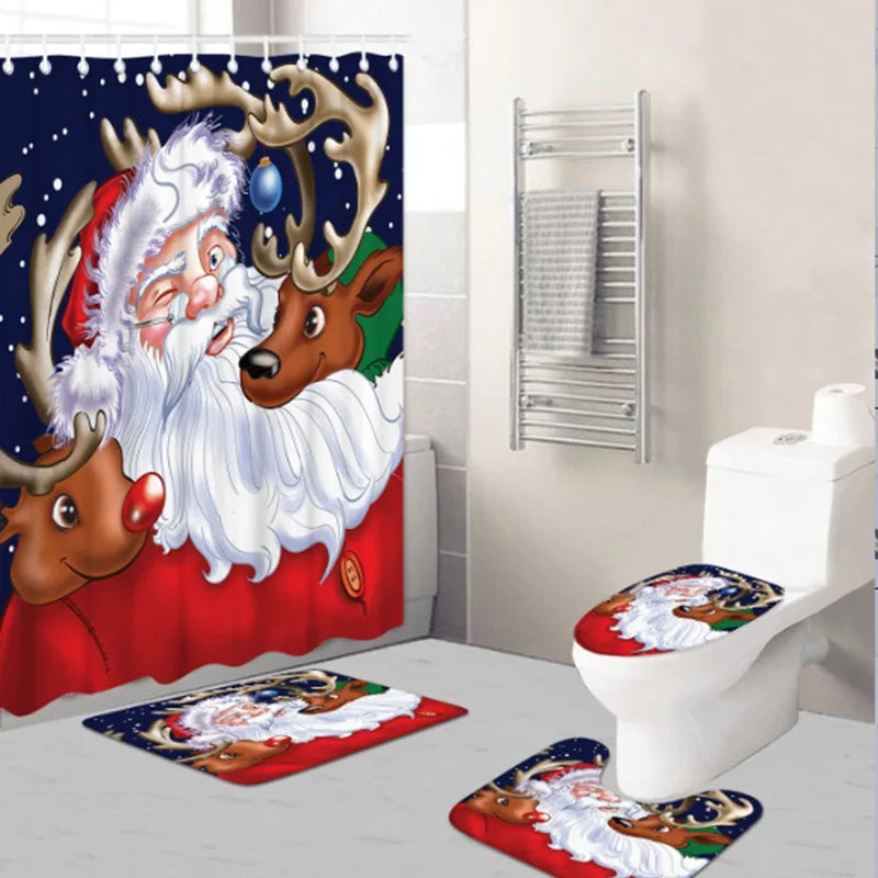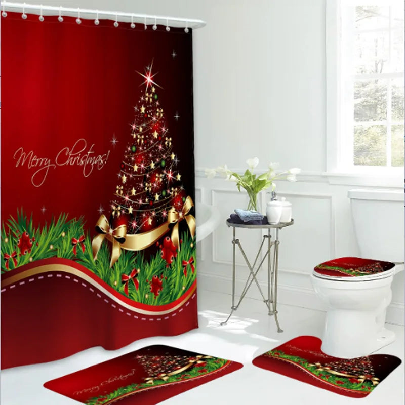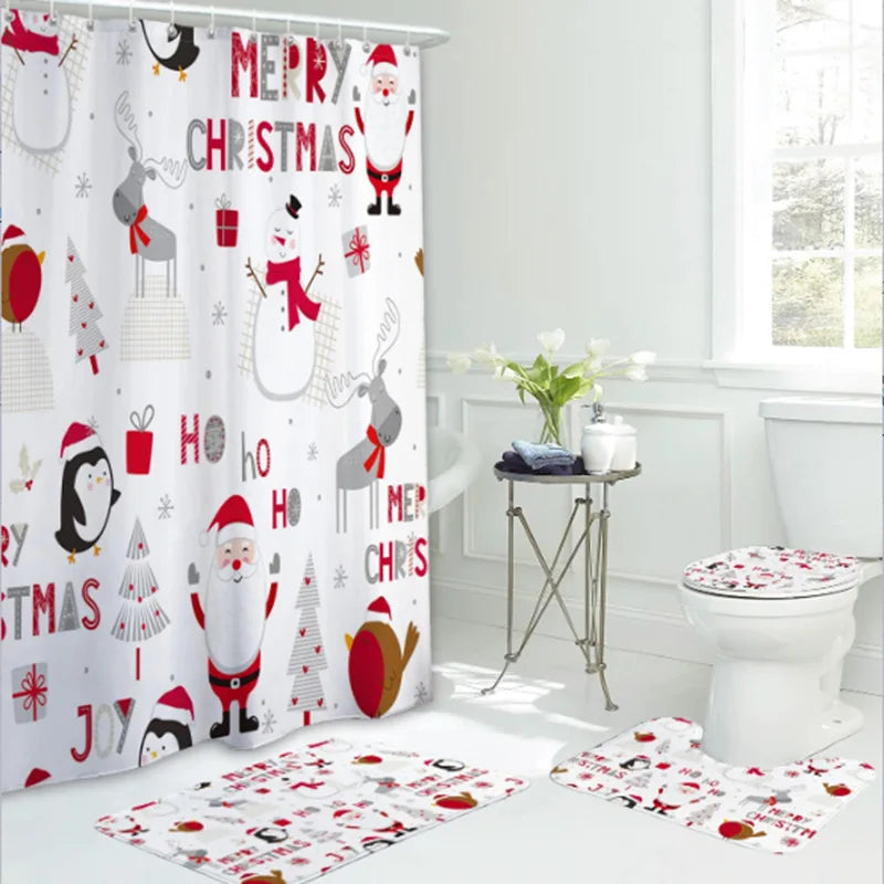 Cartoon Navidad Merry Christmas Shower Curtain Set with Bath Mat Anti-slip U-Carpet Bathroom Partition Waterproof Home Decor