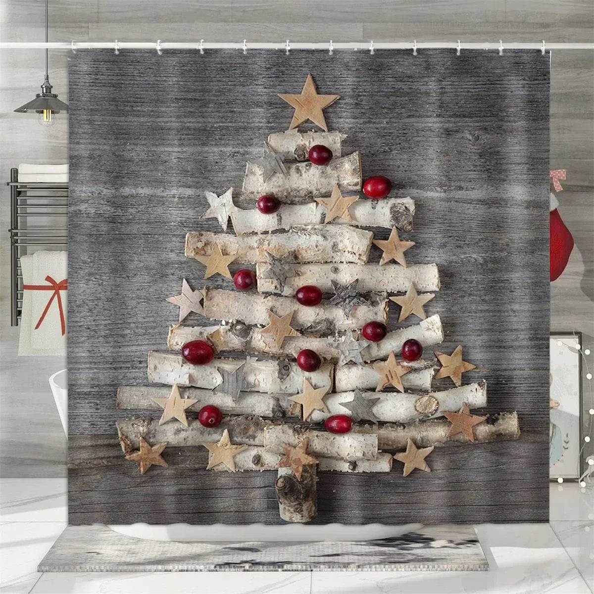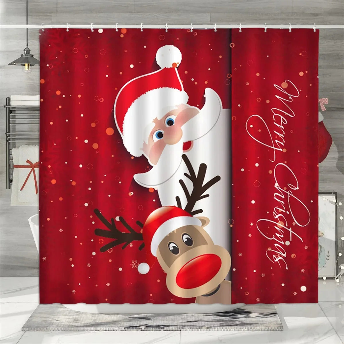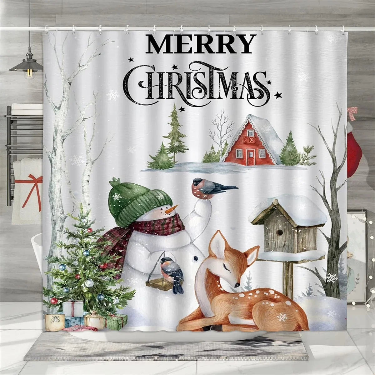 Christmas Shower Curtain, Winter Holiday Farm Snowman Santa Claus Christmas Tree Farmhouse Christmas Balls Bathroom Decorations