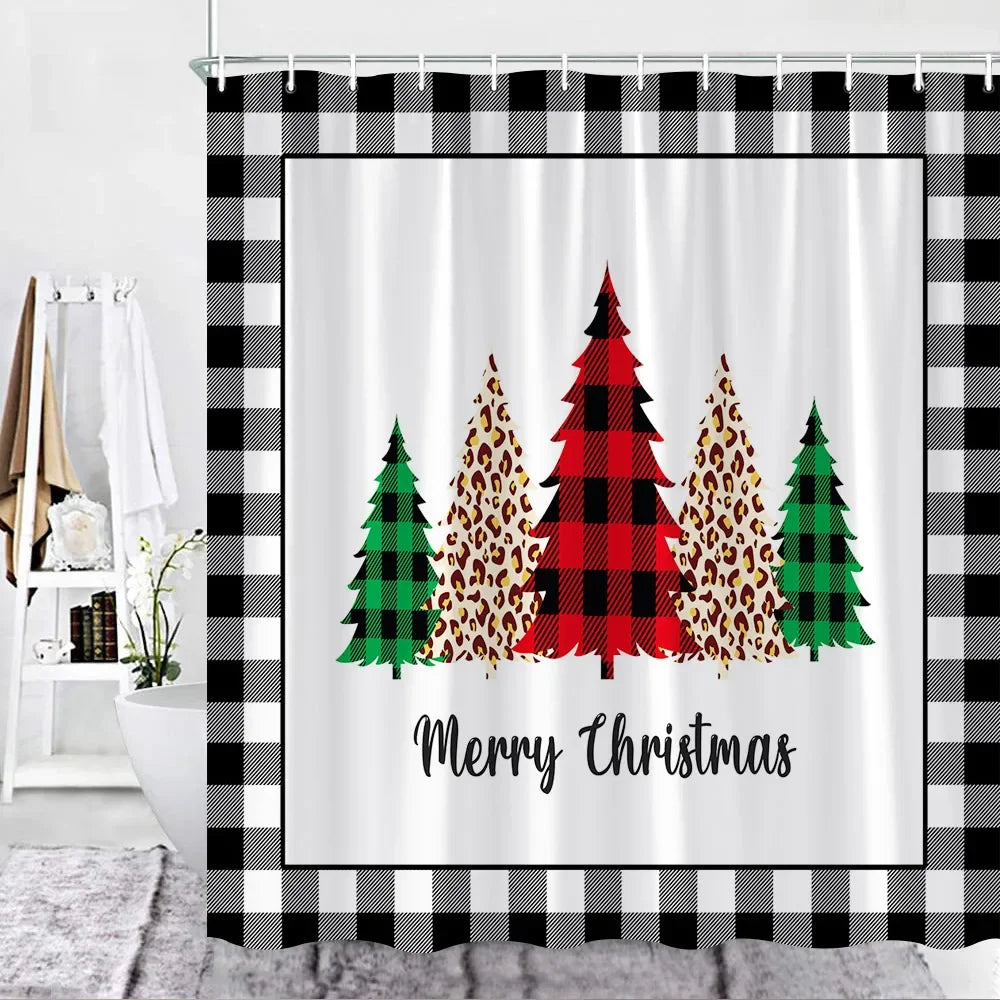 Farmhouse Christmas Shower Curtain Set Red Black Buffalo Checkered Border Xmas Tree New Year Decor Fabric Hook Bathroom Curtains