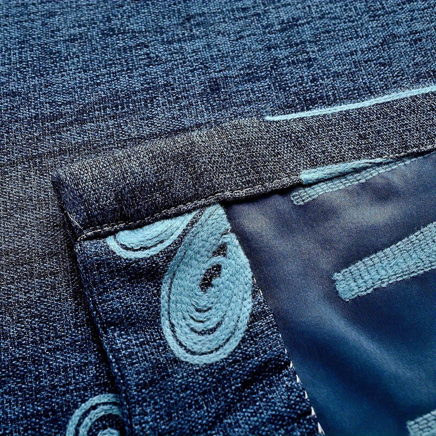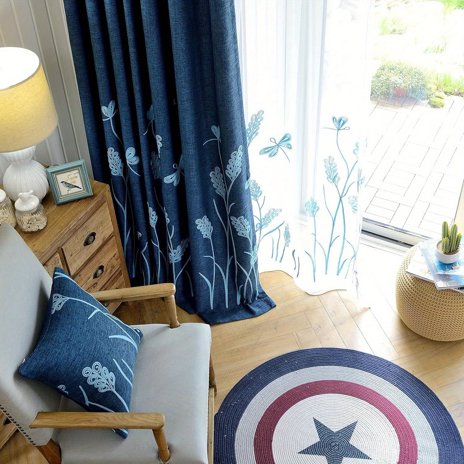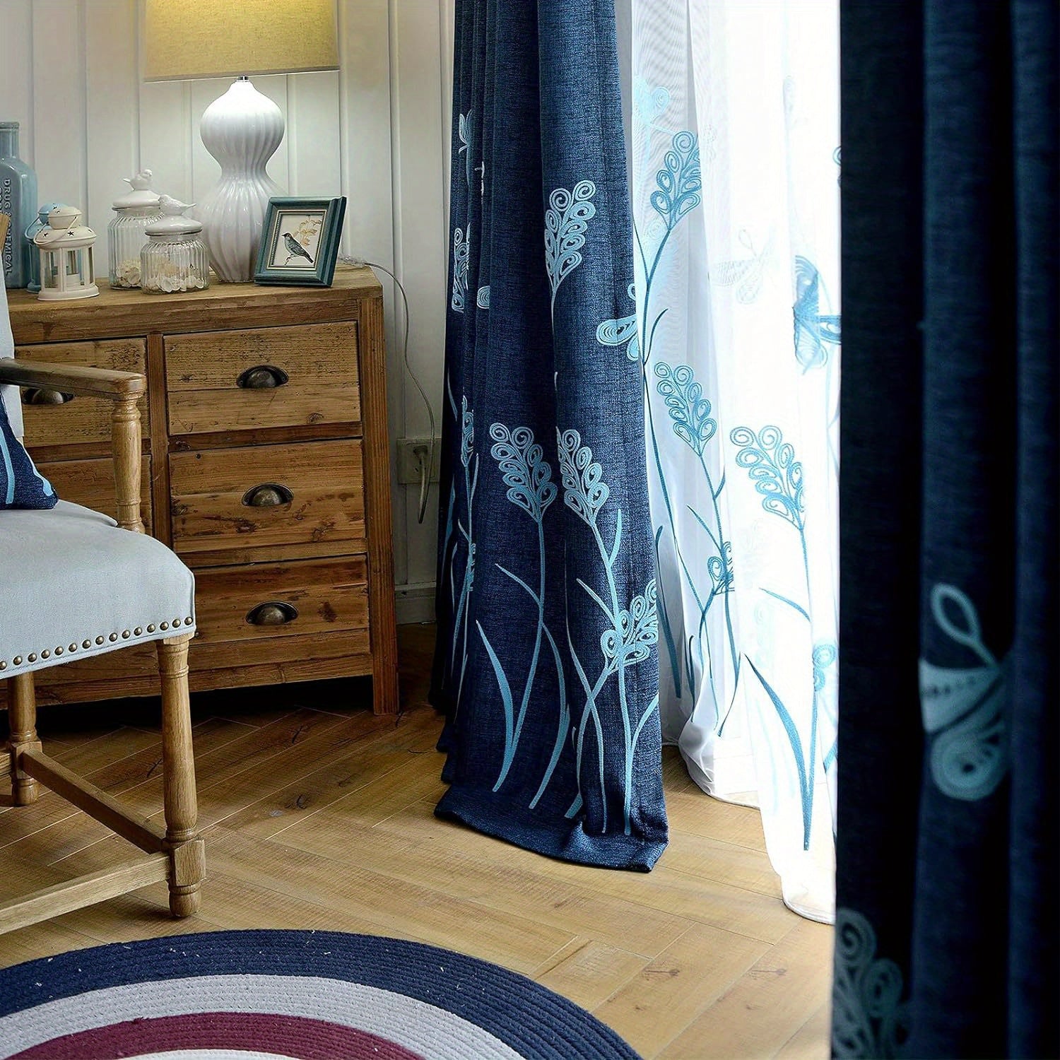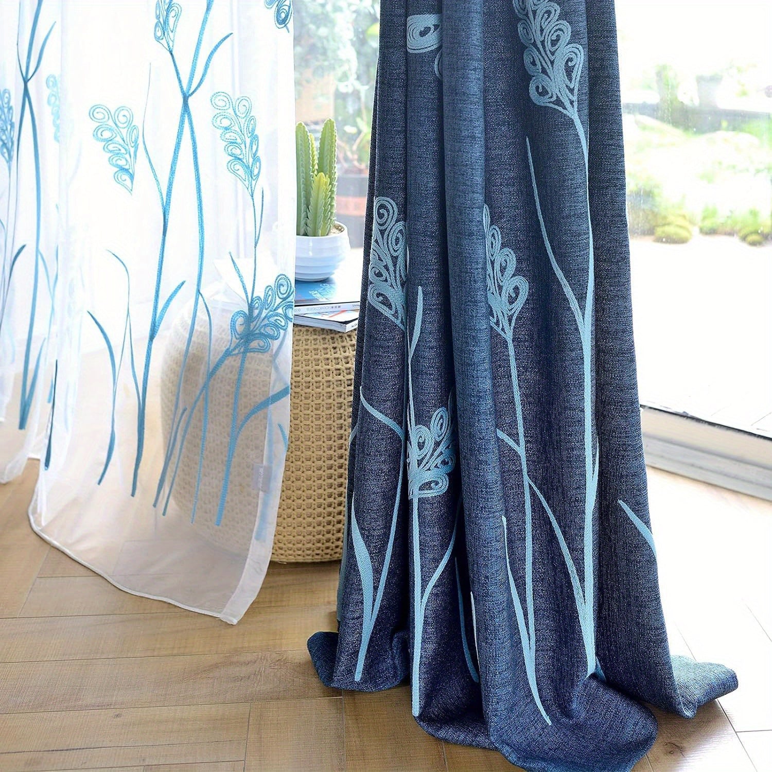 1pc Navy Blue Wheat Embroidery Linen Wide Curtains Thermal Insulated Room Darkening Noise Reducing Grommet Drapes