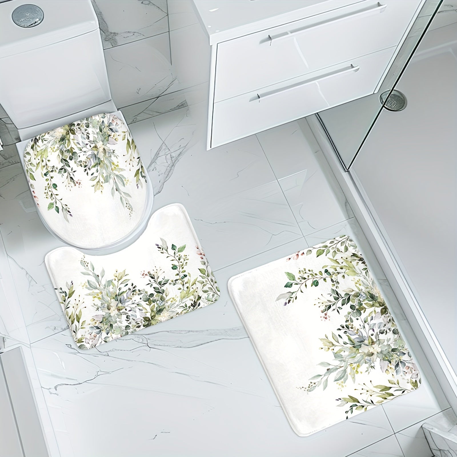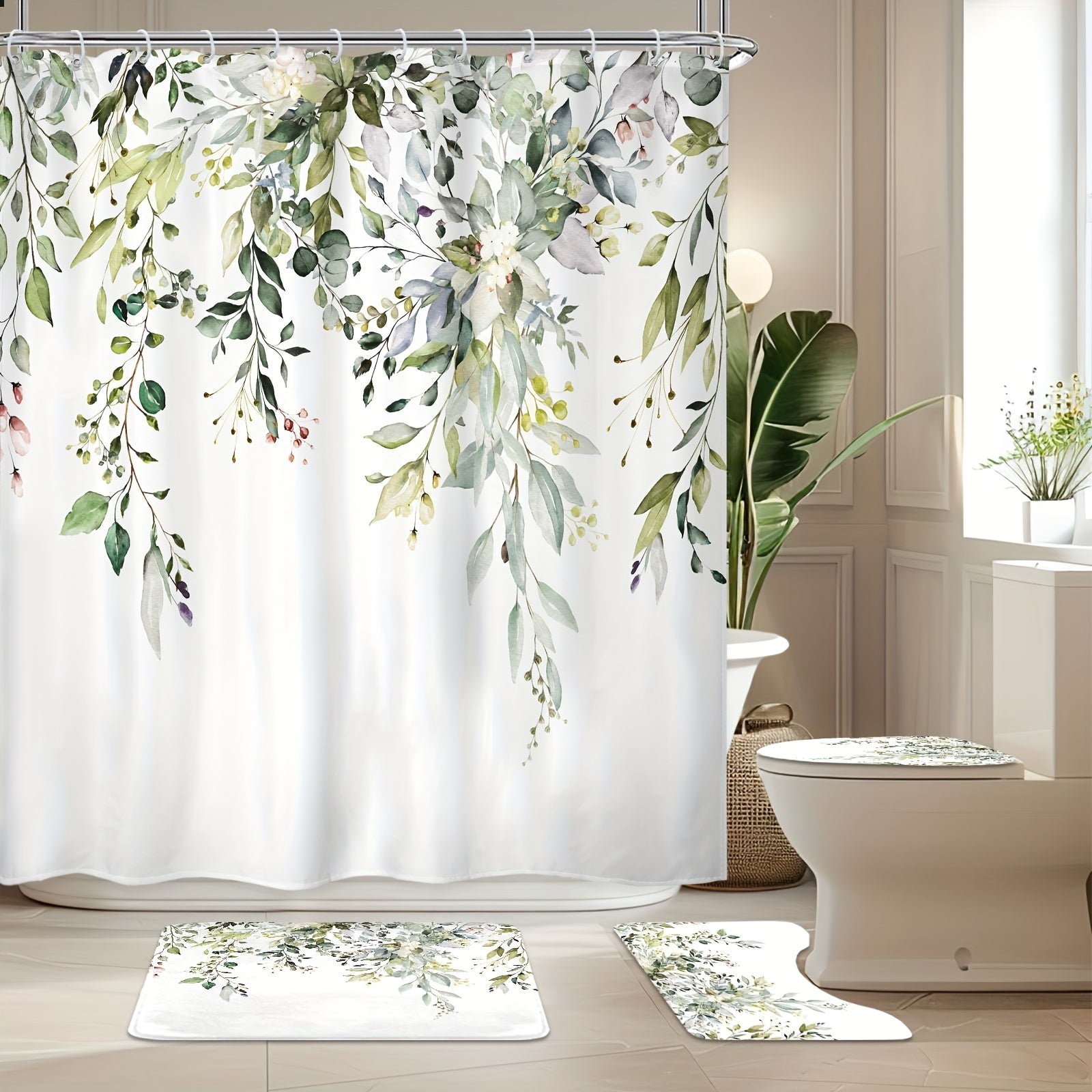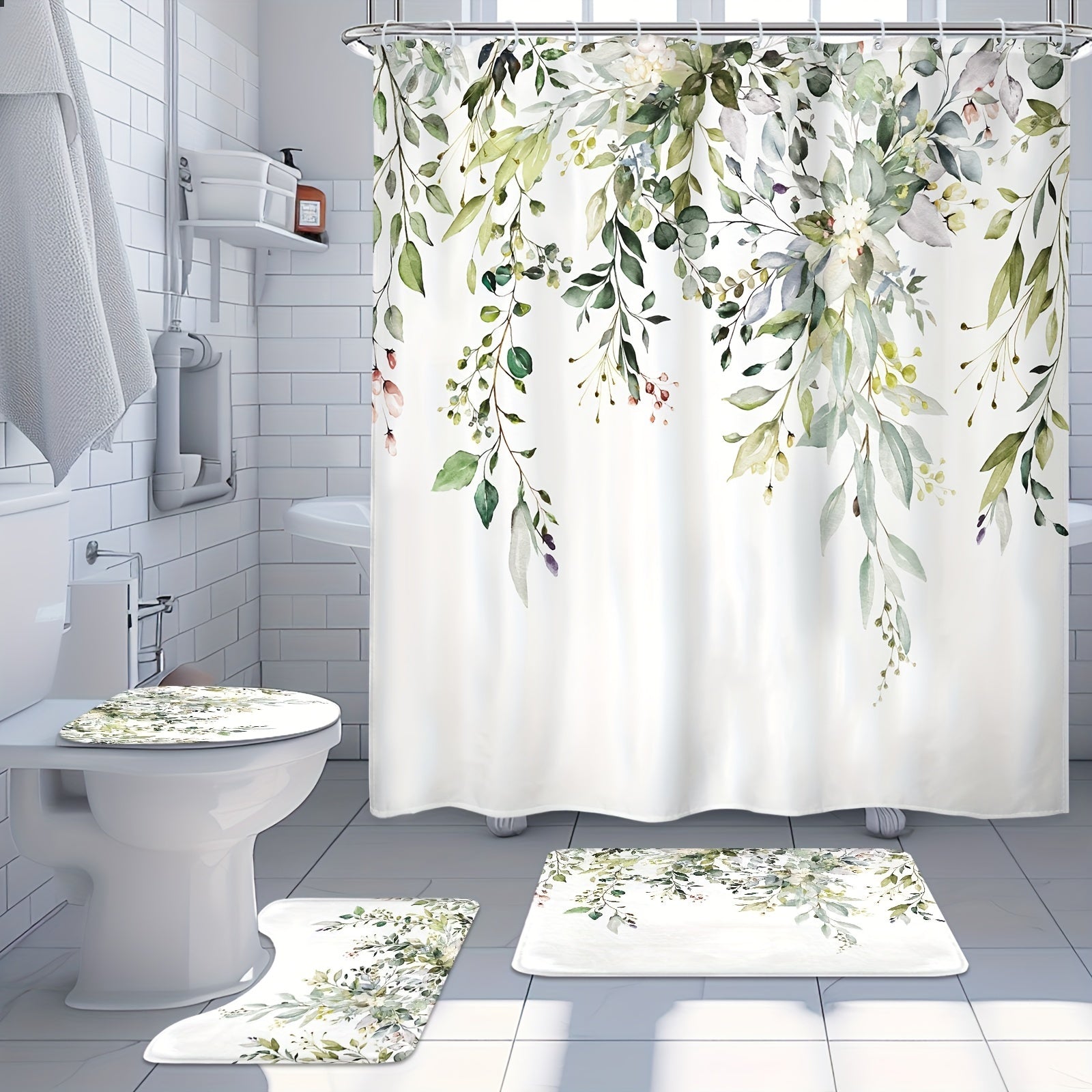 4Pcs Sage Green Eucalyptus Leaf Shower Curtain Set, Waterproof Bathroom Partition Curtain With Hook 71 Inches, Non-slip Bathroom Floor Mat, Toilet U-shaped Mat, Toilet Seat Cover Mat, Bathroom Accessories, Bathroom Home Decor